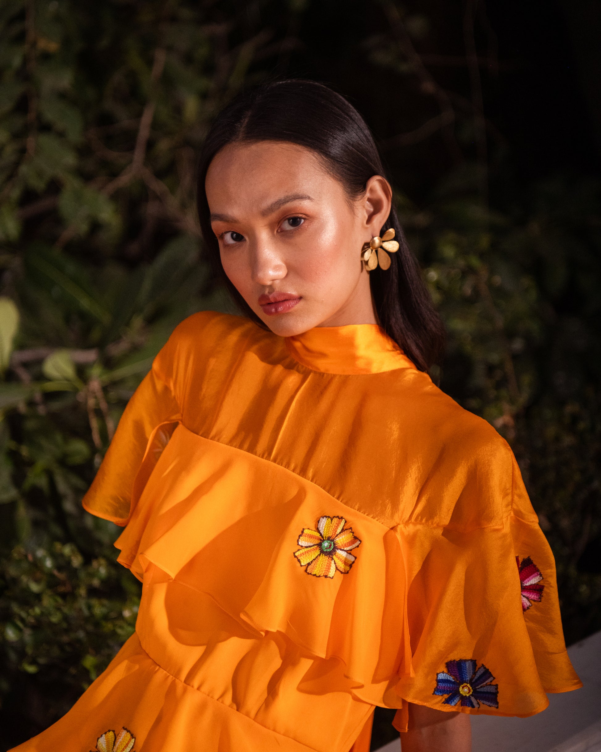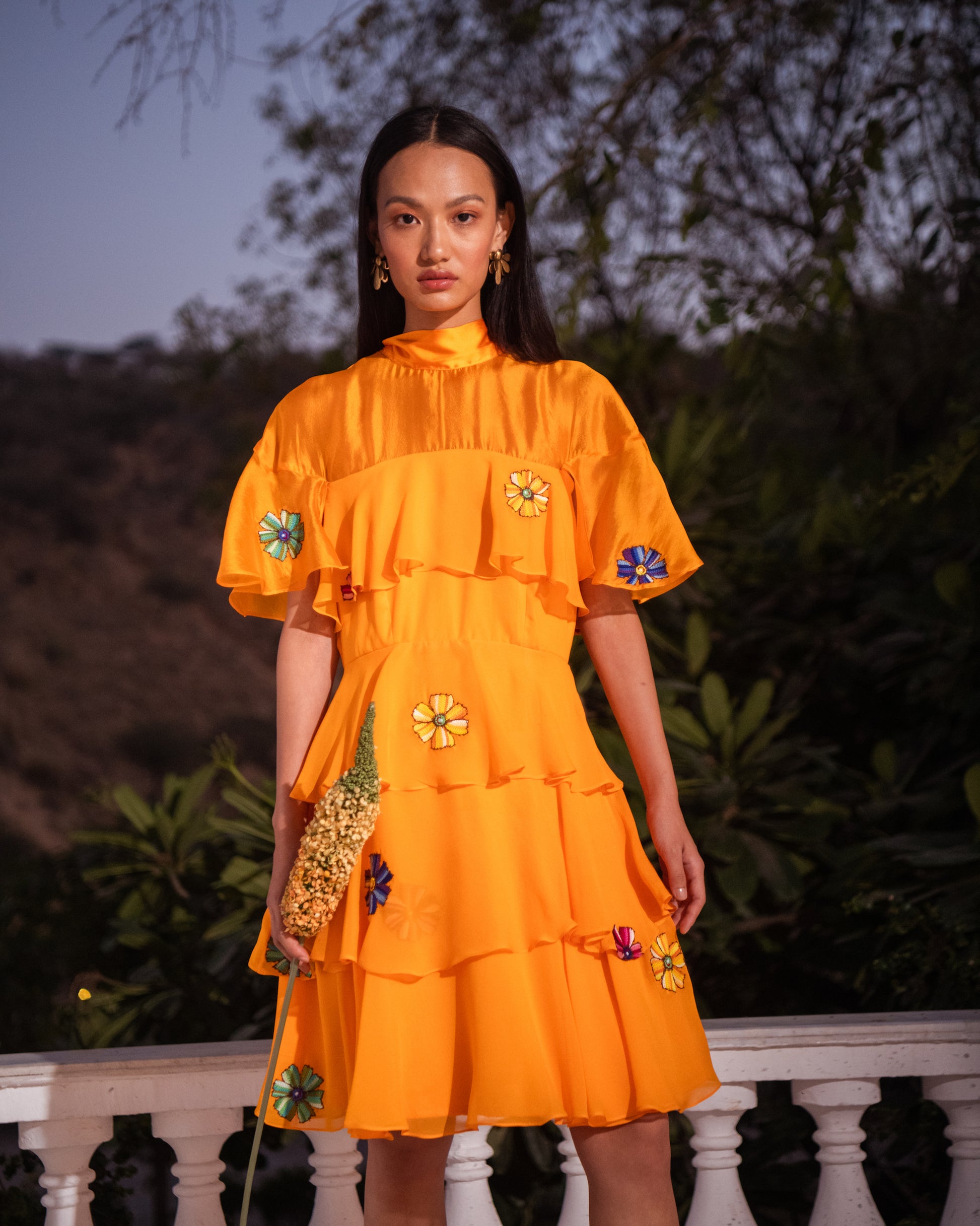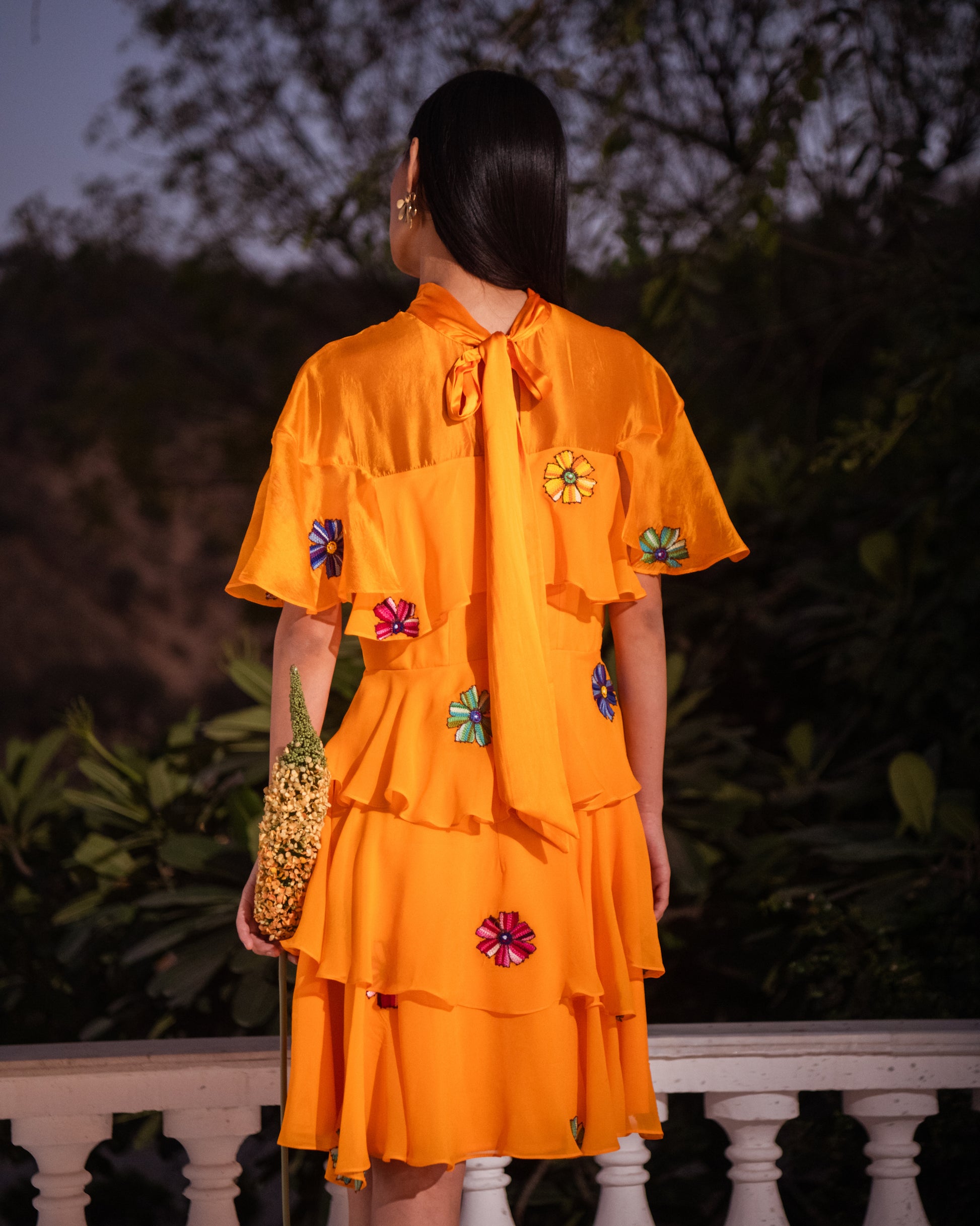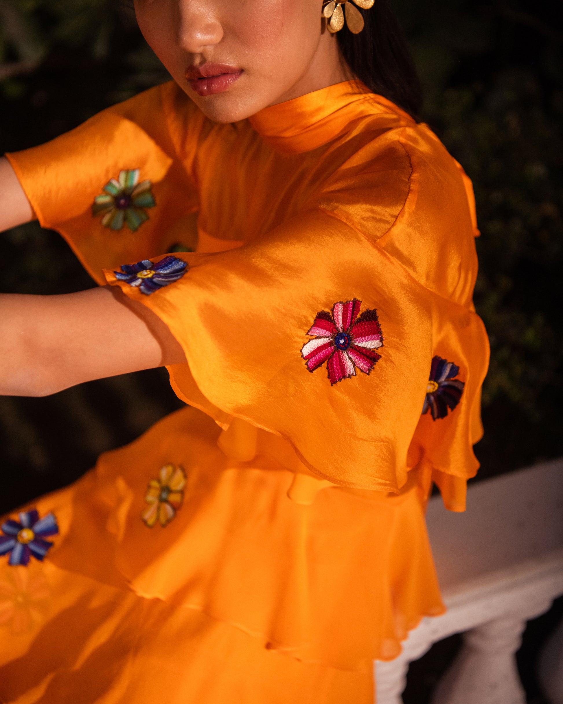 A flowy, tiered dress in midnight blue and a bright orange, Zelda is ravishing and dainty. The garment comes with multi-hued, embroidered flowers and a gorgeous neckline. Sway the evening away in this relaxing number.