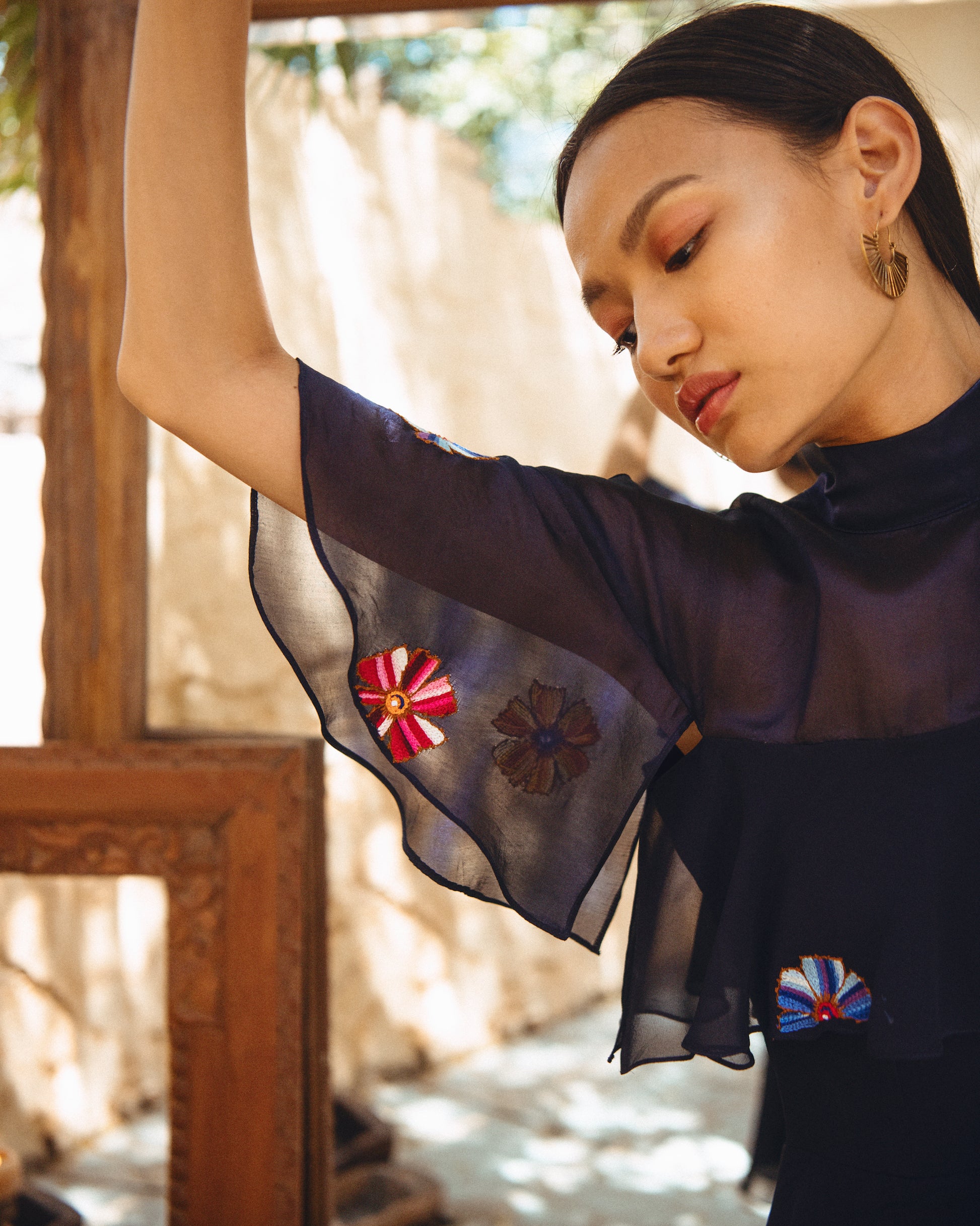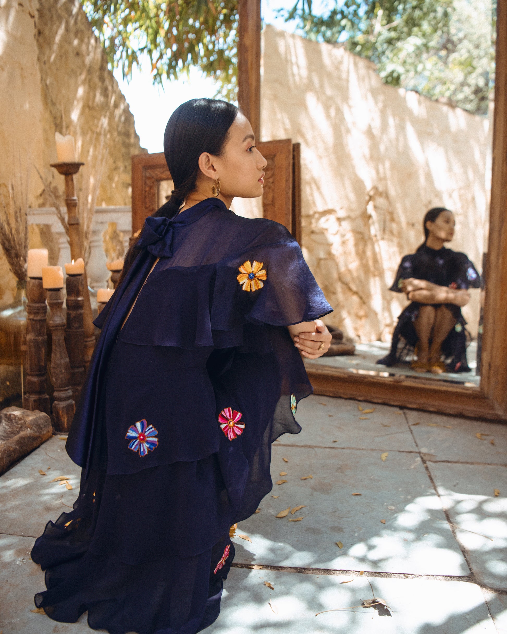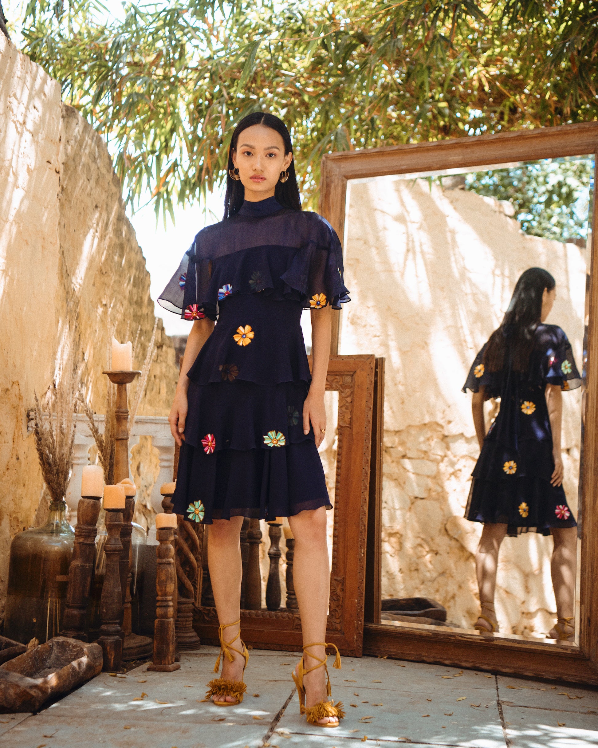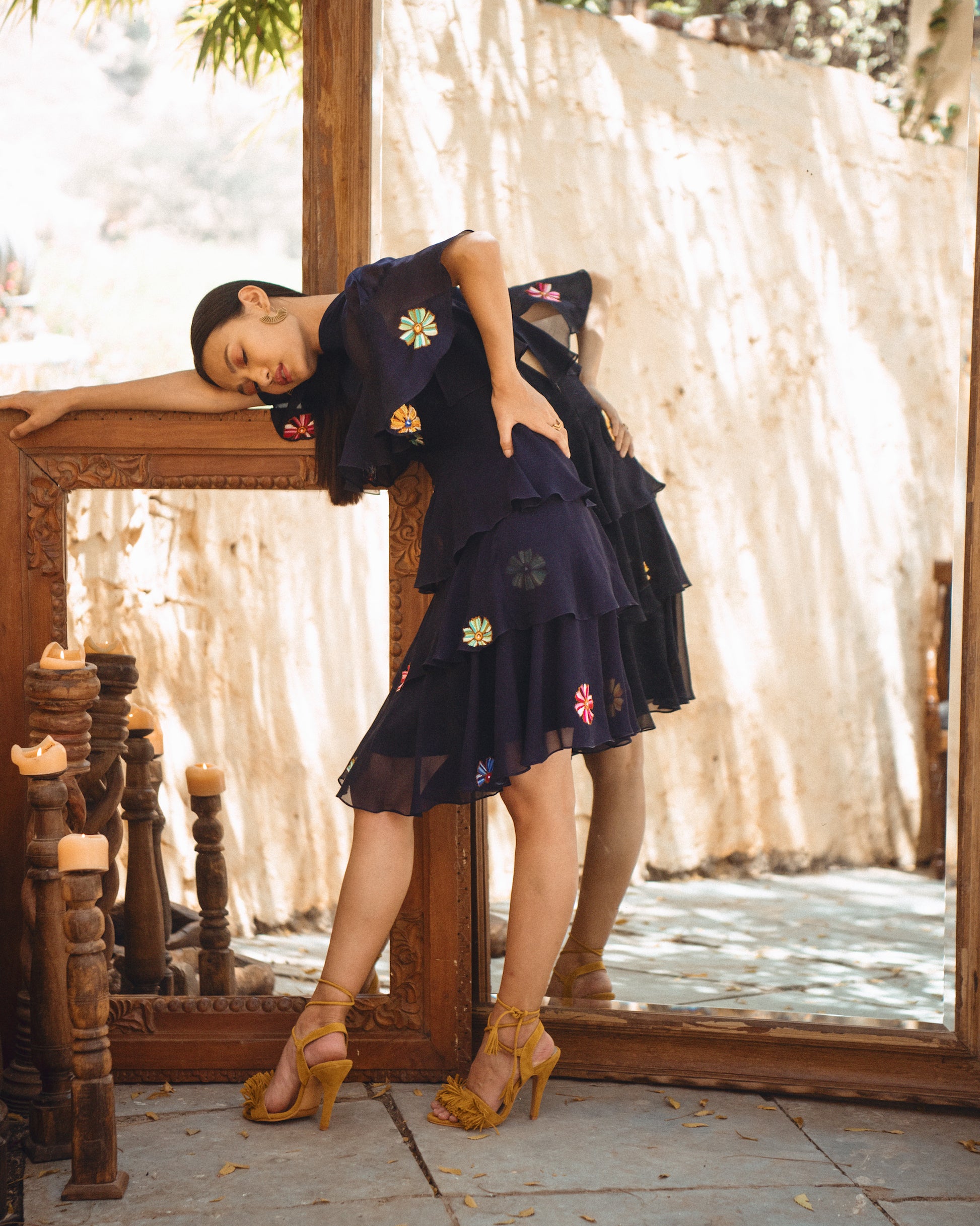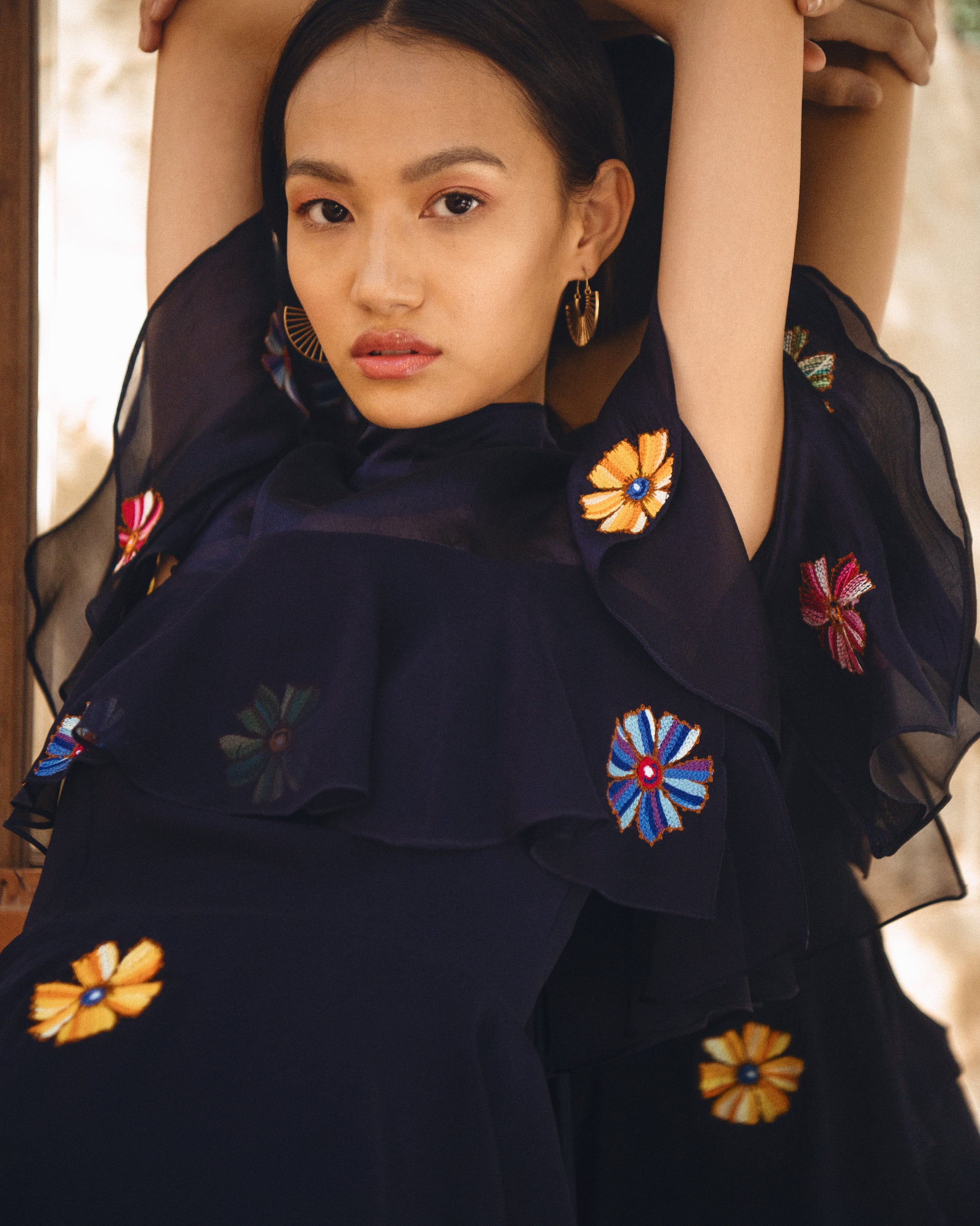 A flowy, tiered dress in midnight blue and a bright orange, Zelda is ravishing and dainty. The garment comes with multi-hued, embroidered flowers and a gorgeous neckline. Sway the evening away in this relaxing number.