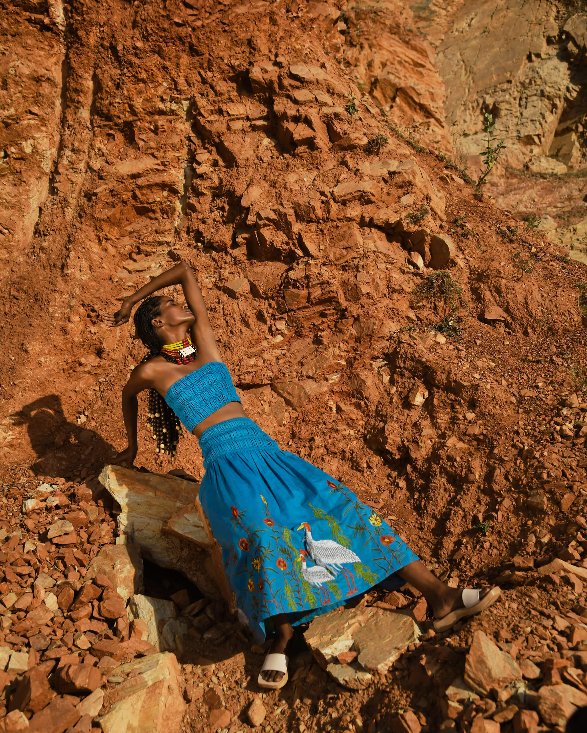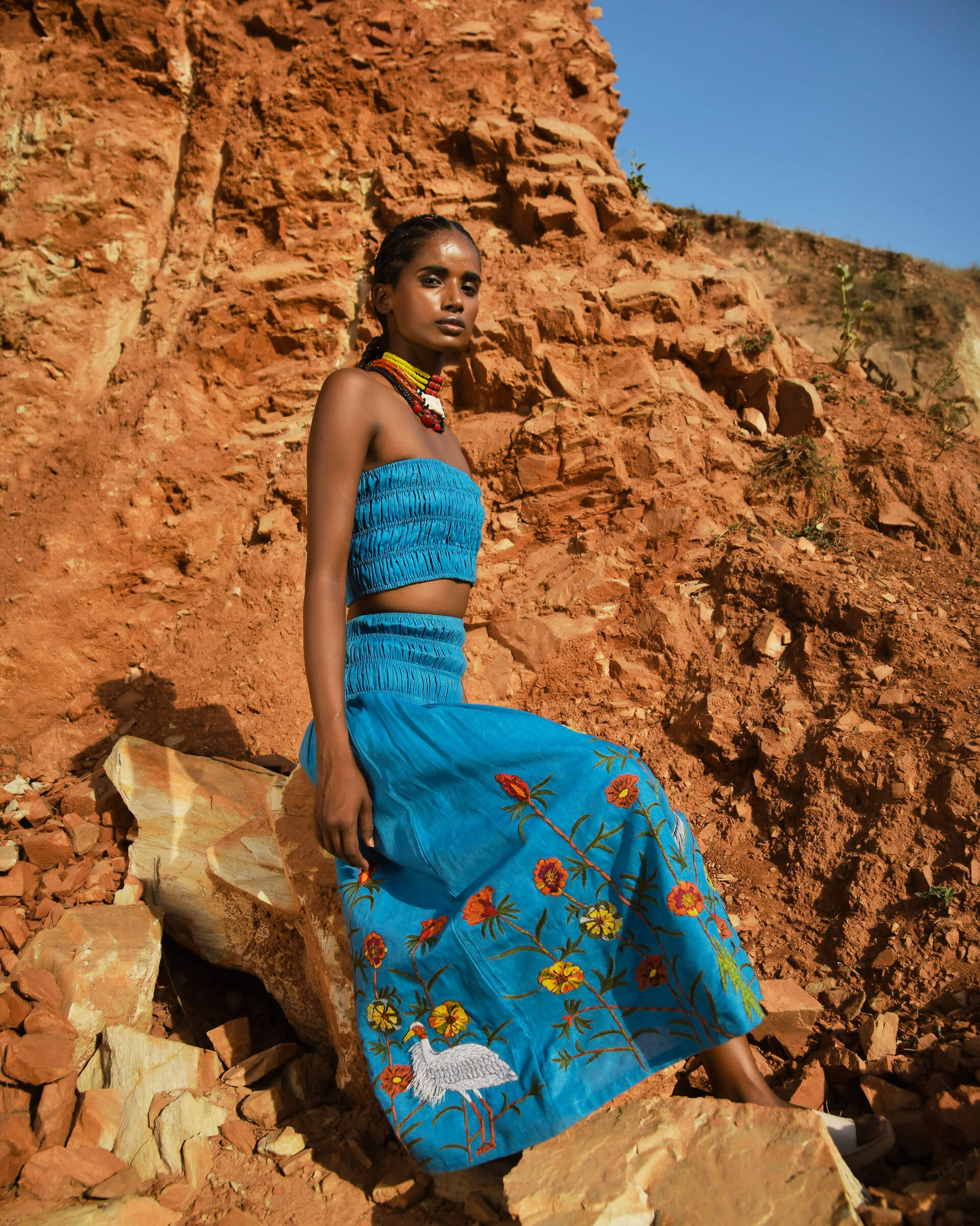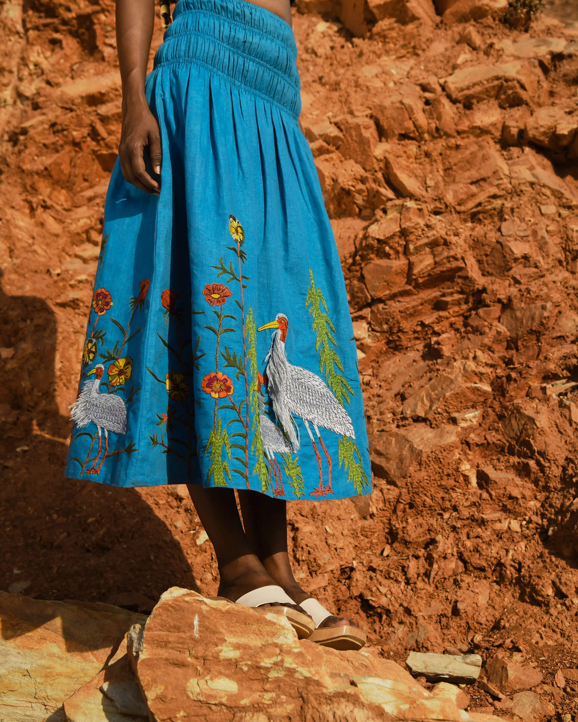 Anga' means 'blue sky' in Swahili, and the Anga Co-Ord Set is a splash for this dreamy colour. A wild tapestry adorns the Anga Skirt. The garment is a hand-embroidered painting, featuring storks amongst a lush, floral scenery. With its smocking detail on the waist, this A-line midi skirt is as comfortable as it is dreamy. Pair it with the Anga Crop Top to complete the look.