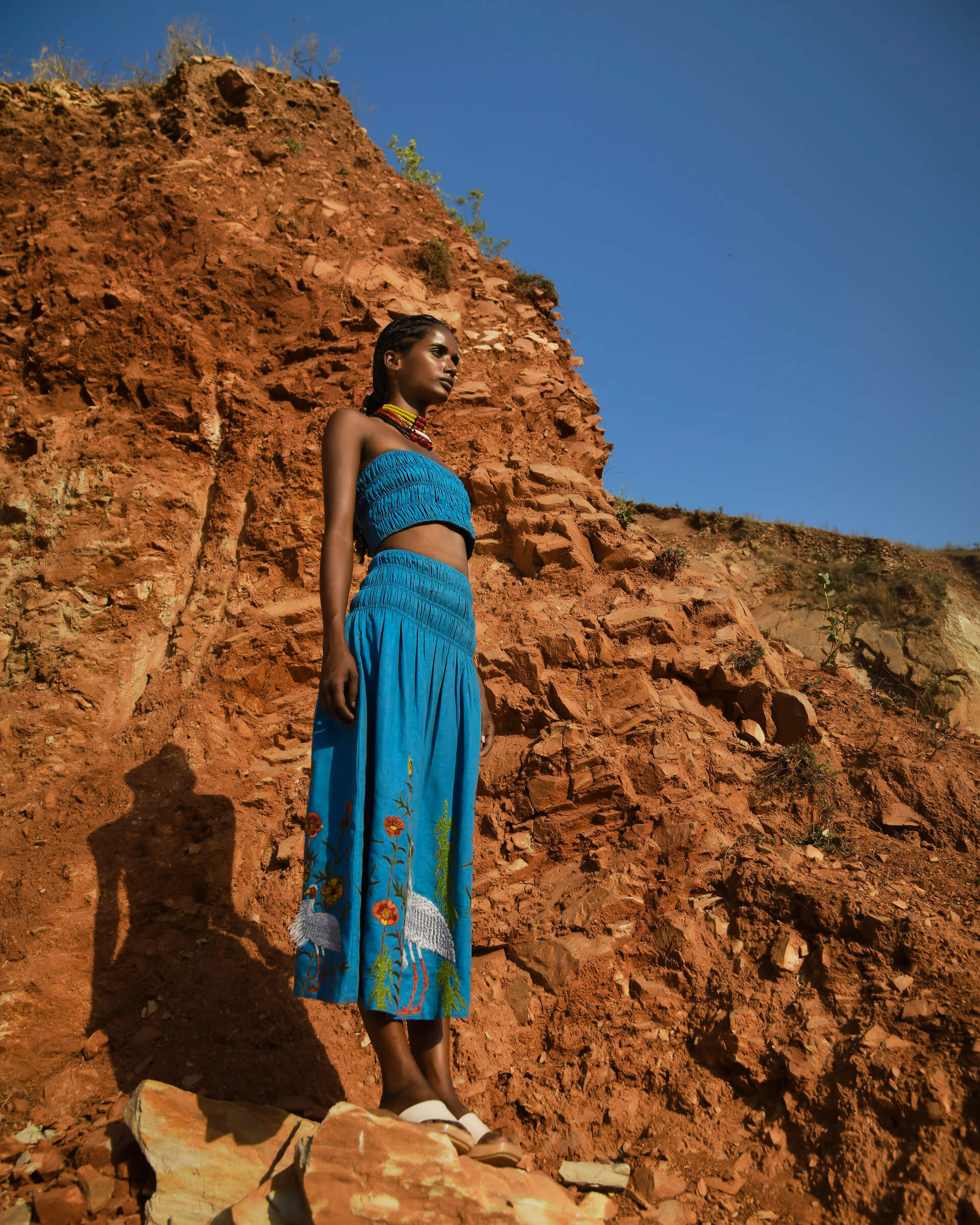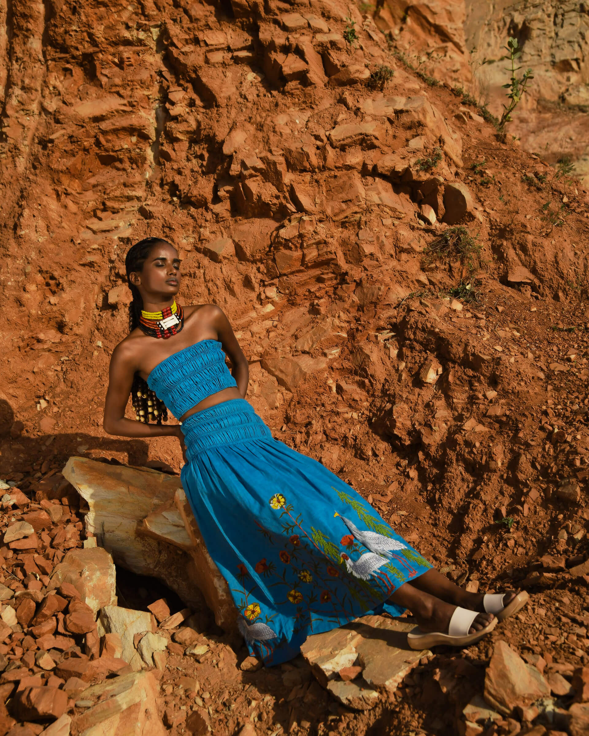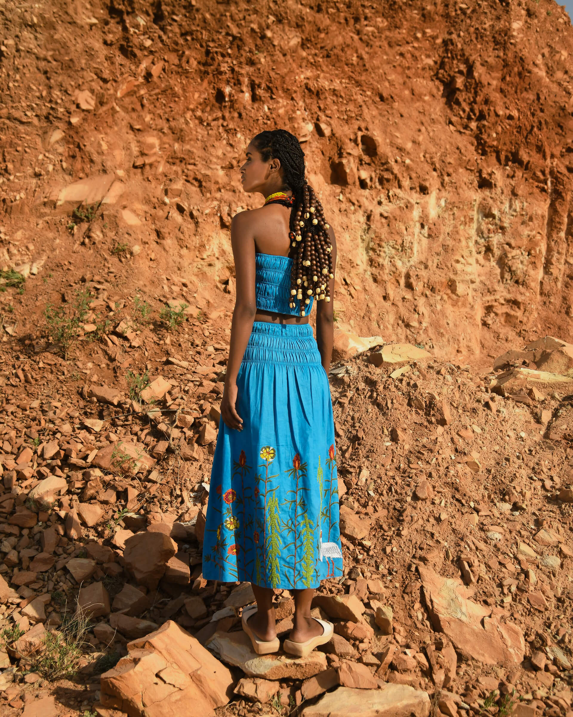 Anga' means 'blue sky' in Swahili, and the Anga Co-Ord Set is a splash for this dreamy colour. A wild tapestry adorns the Anga Skirt. The garment is a hand-embroidered painting, featuring storks amongst a lush, floral scenery. With its smocking detail on the waist, this A-line midi skirt is as comfortable as it is dreamy. Pair it with the Anga Crop Top to complete the look.