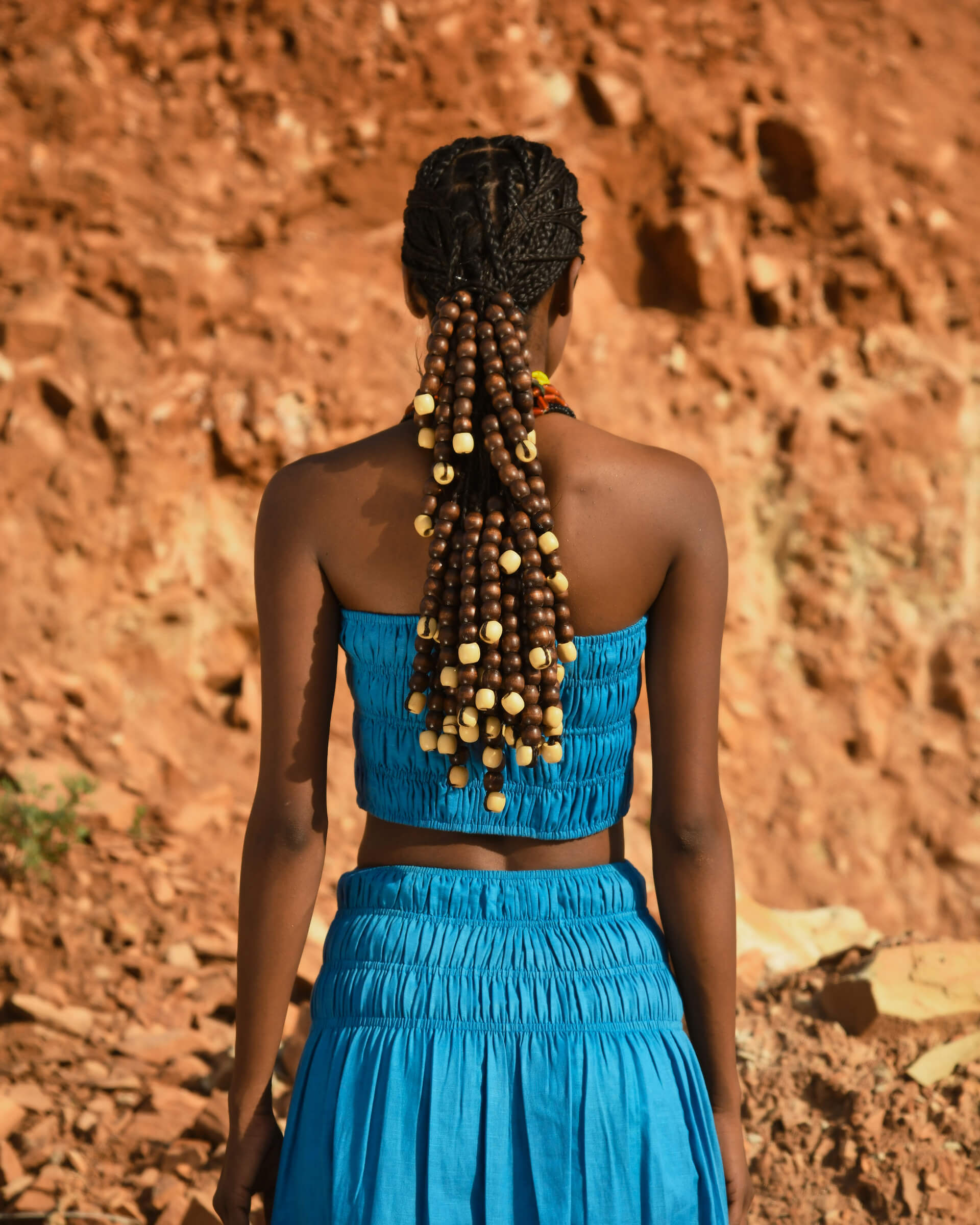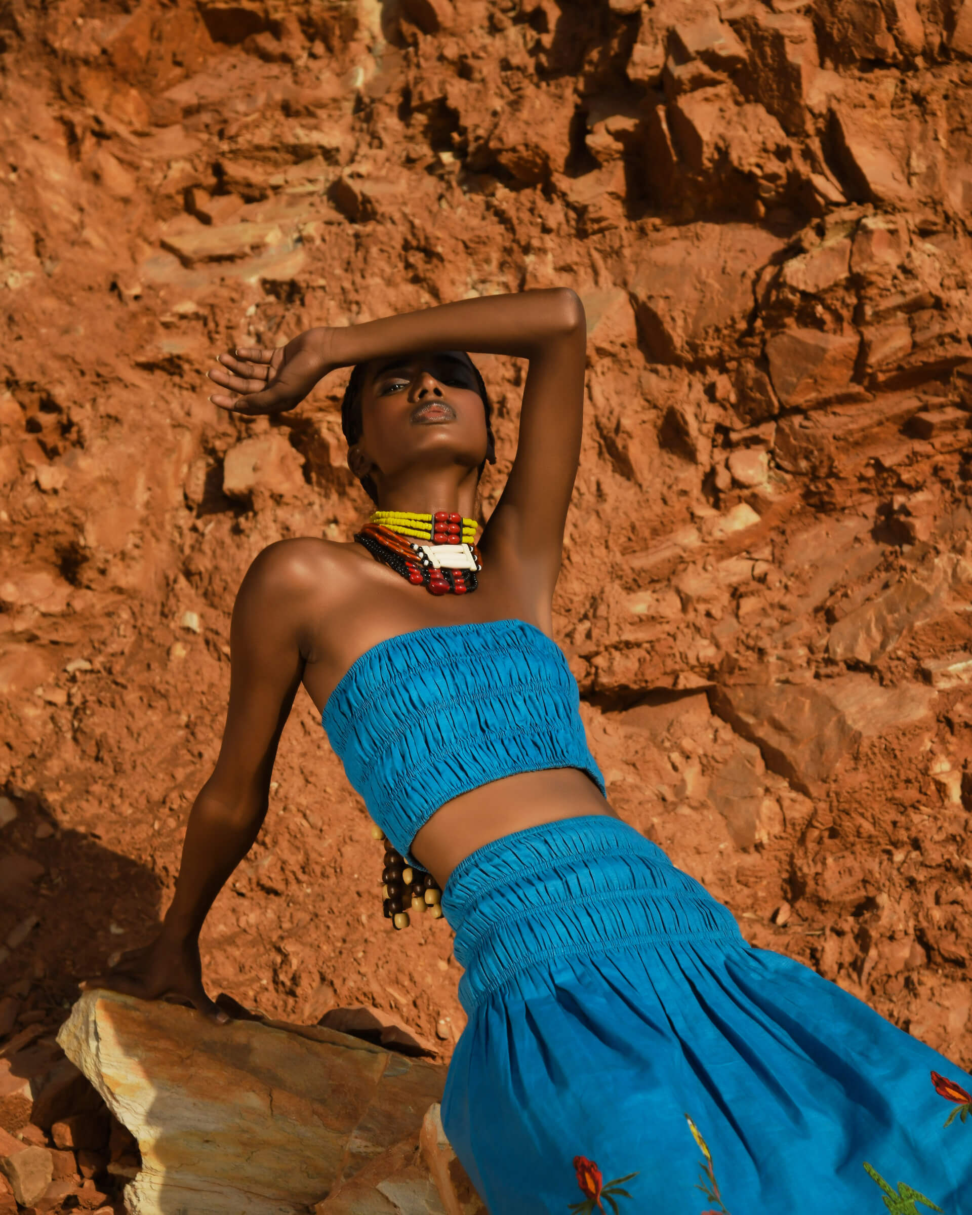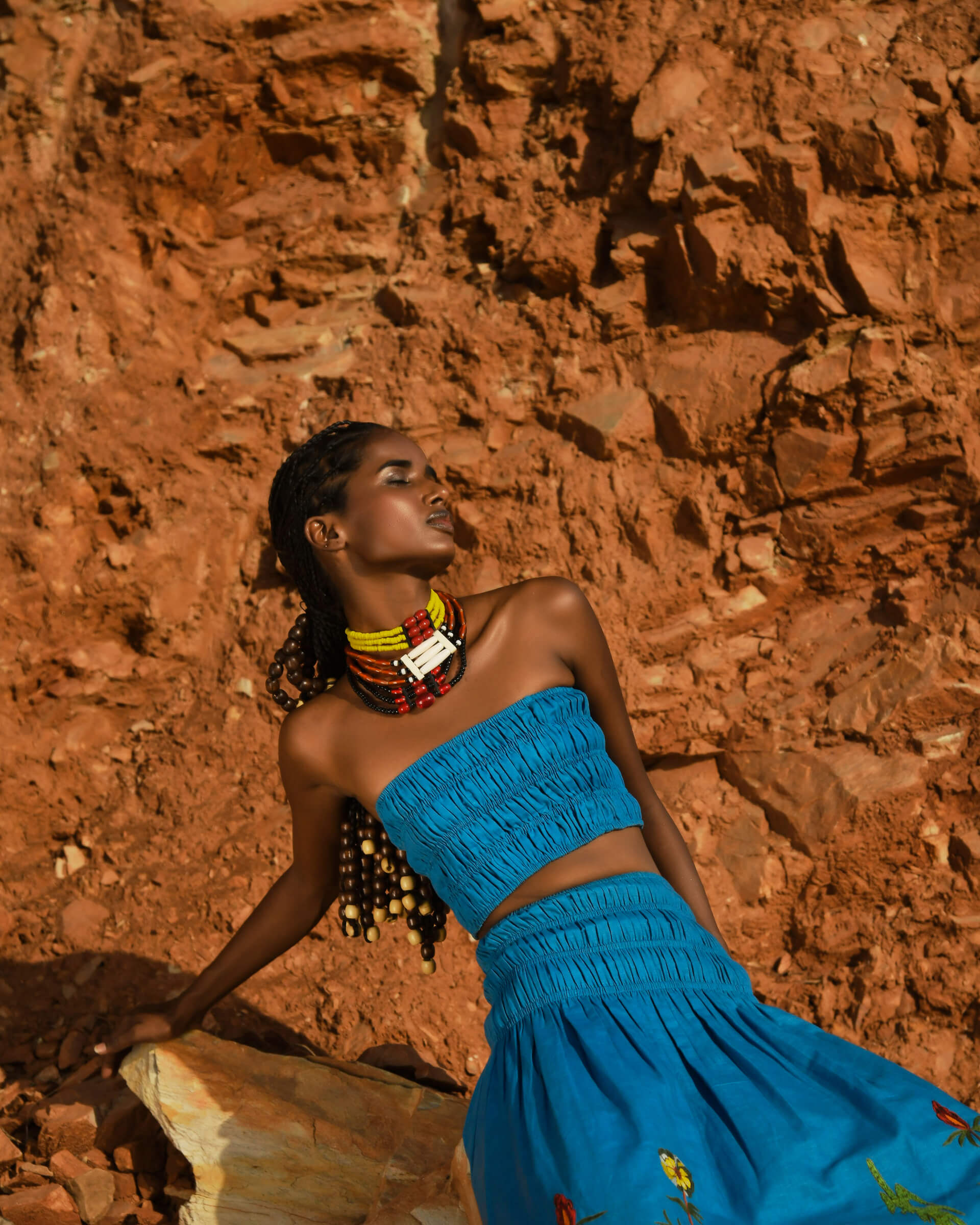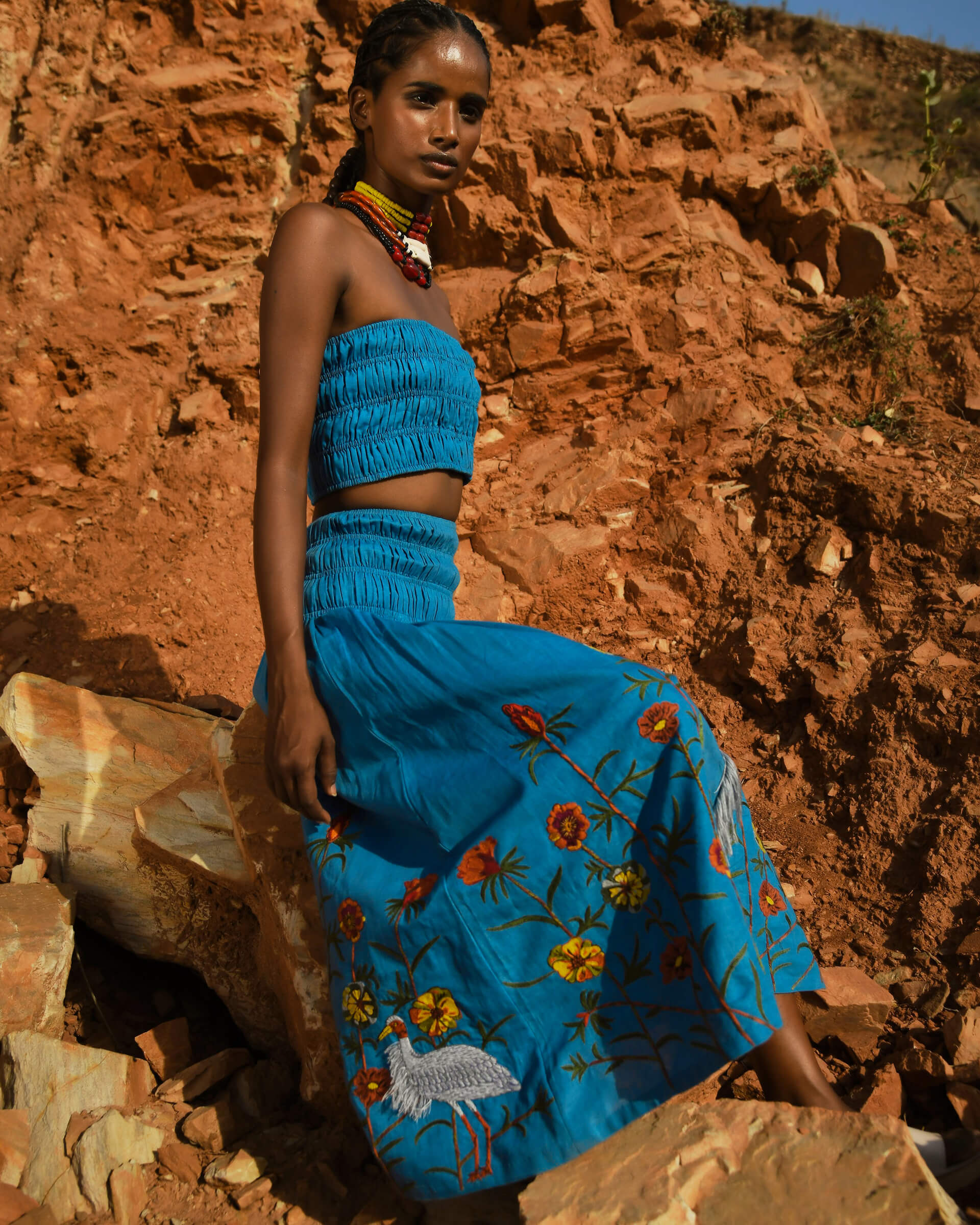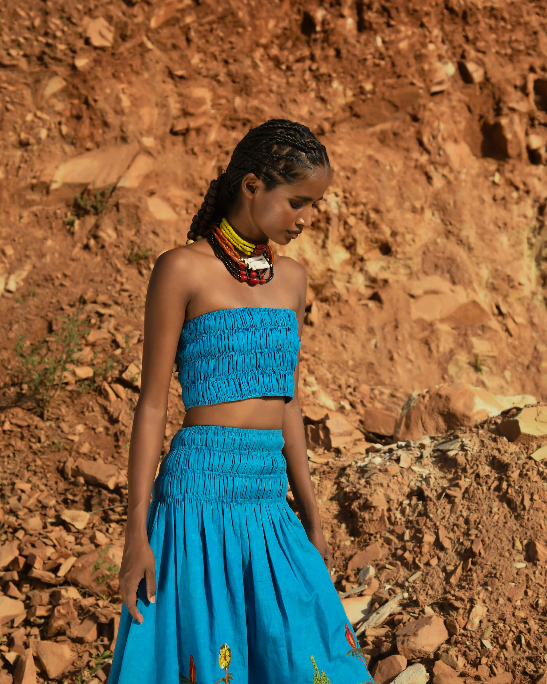 A smocked crop top, Anga is off-shouldered and comes in a gorgeous sky blue colour. Wear this piece with a variety of ensembles, as an inner under an overlay top, or in combination with the Anga Skirt.