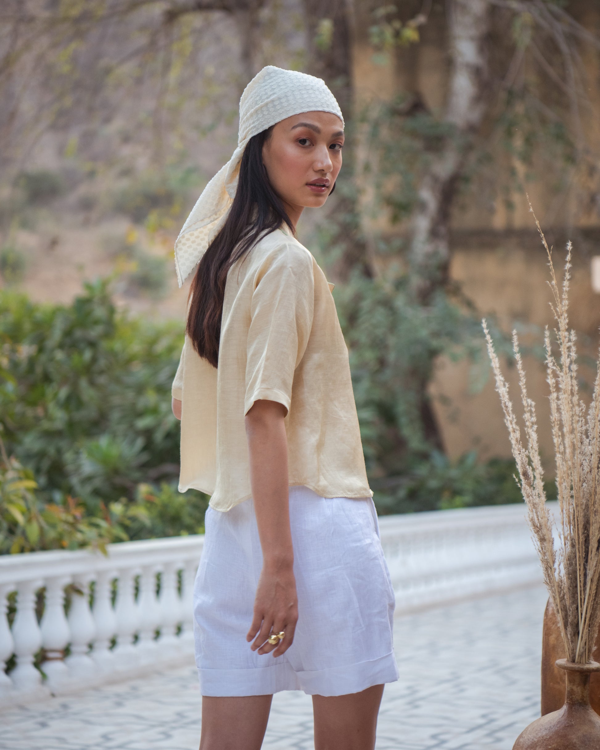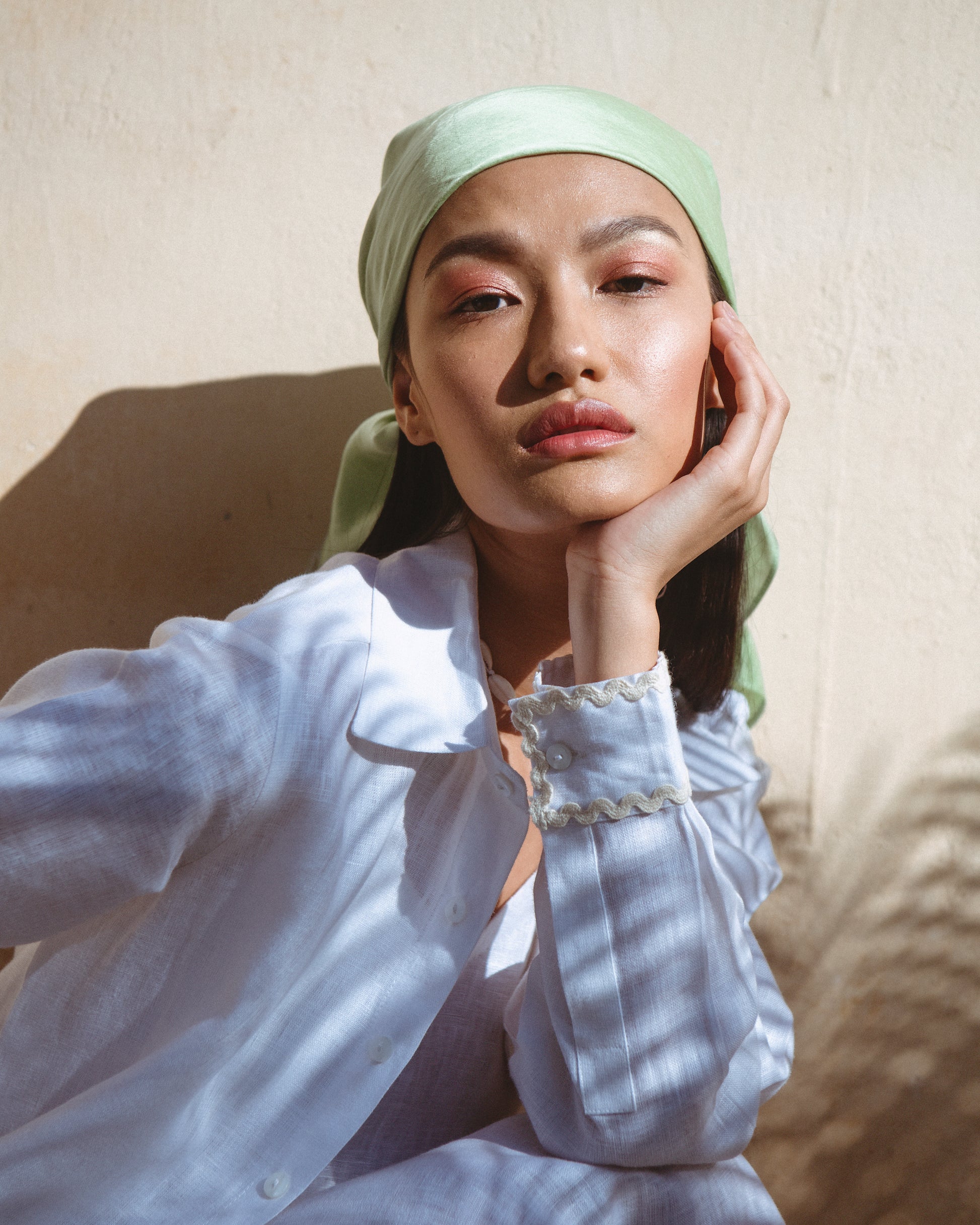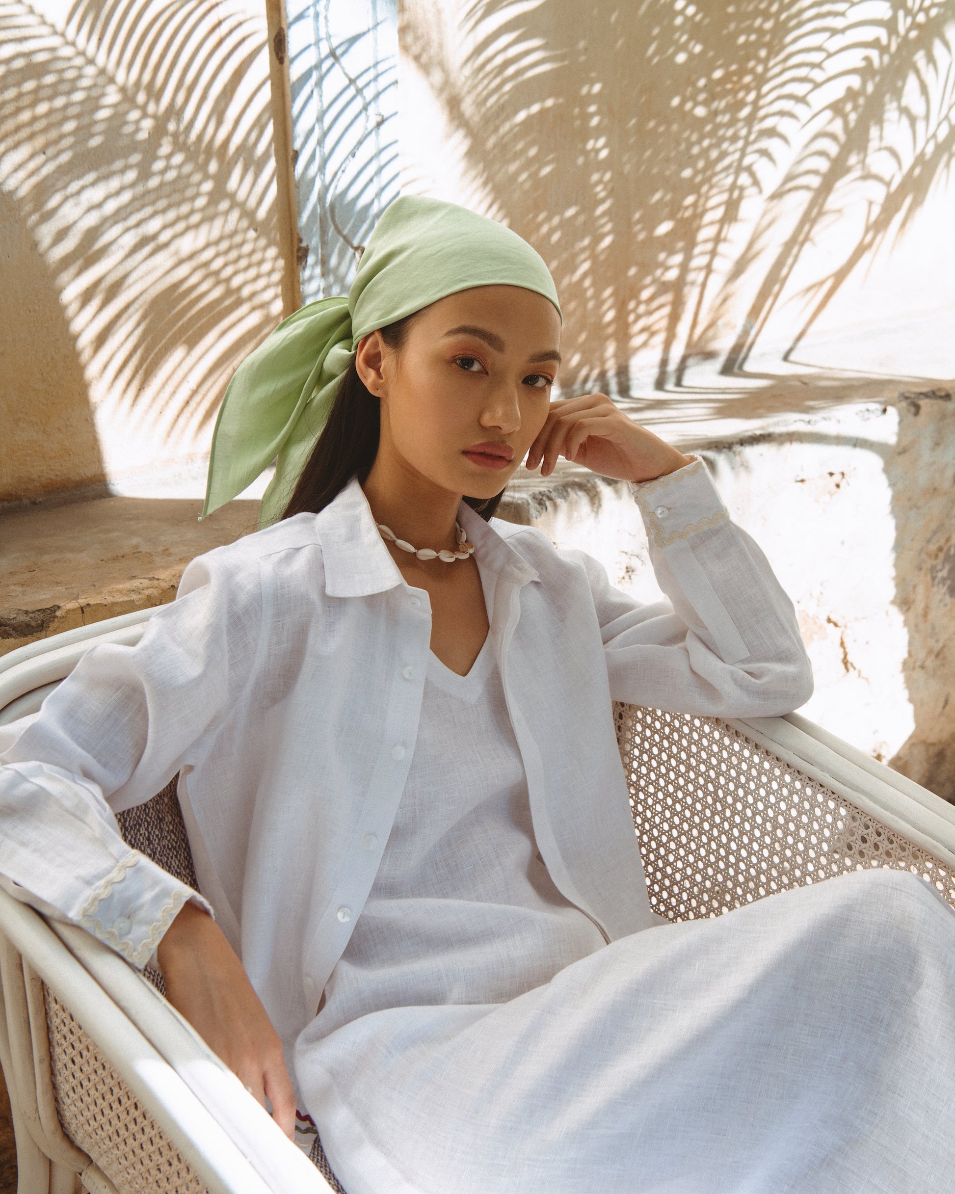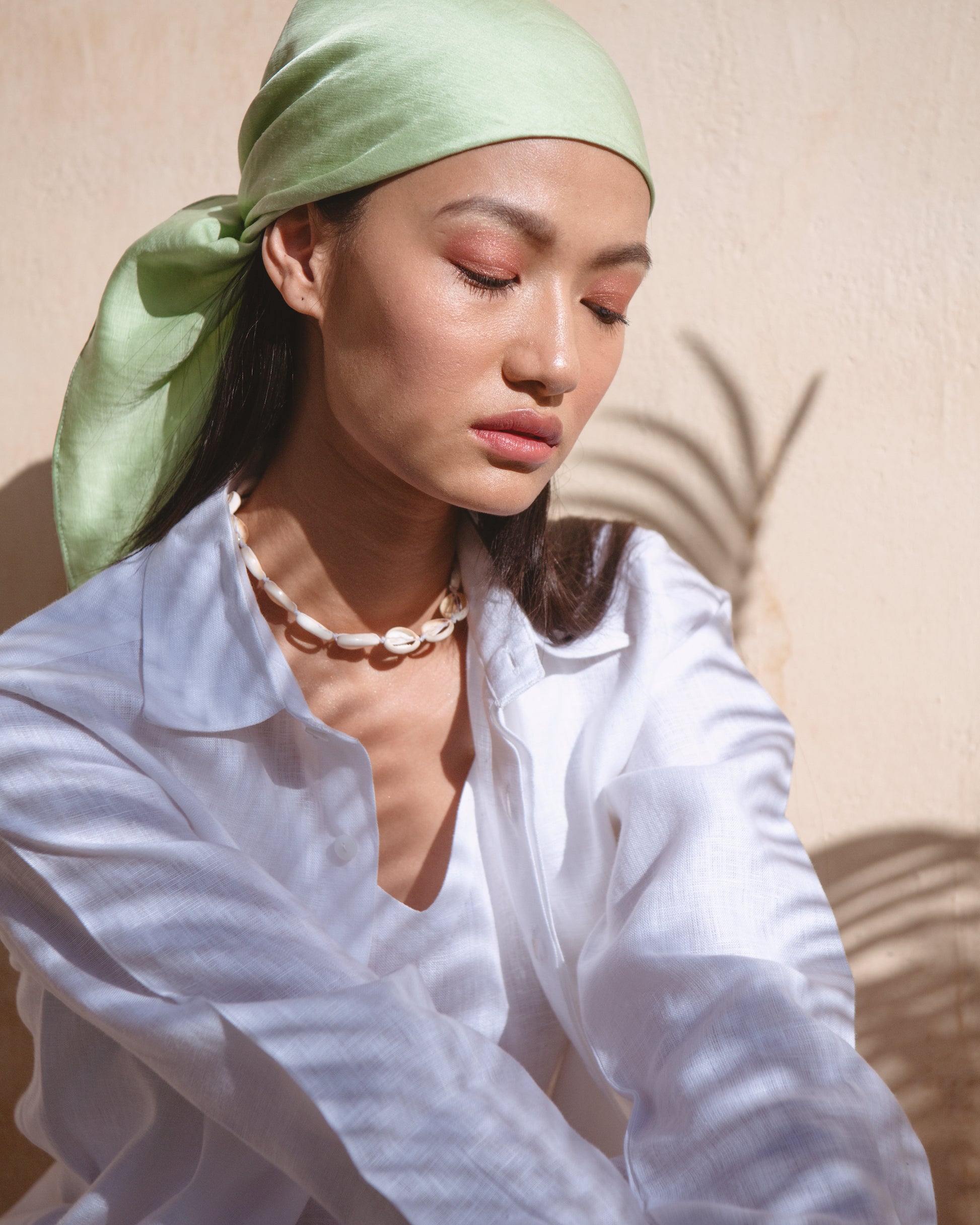 Accessorise your ensemble with the classic Ariana Scarf. This functions as both a usual scarf as well as a bandana. Choose from two fun colour options - a silky green, and a subtle off-white.