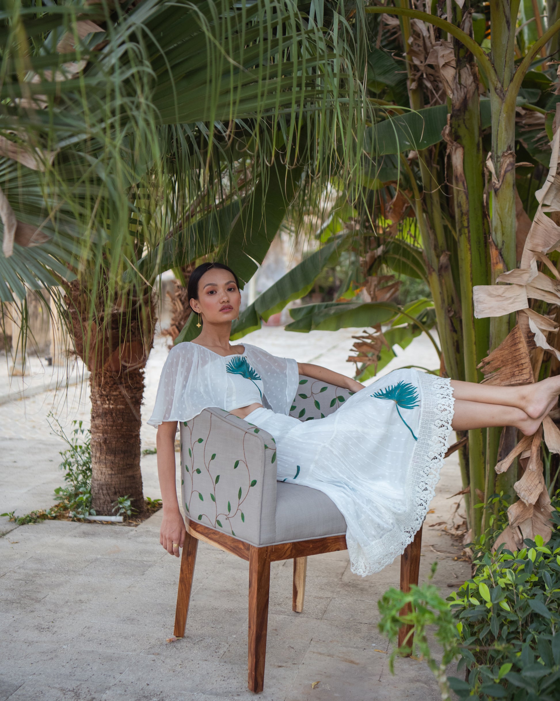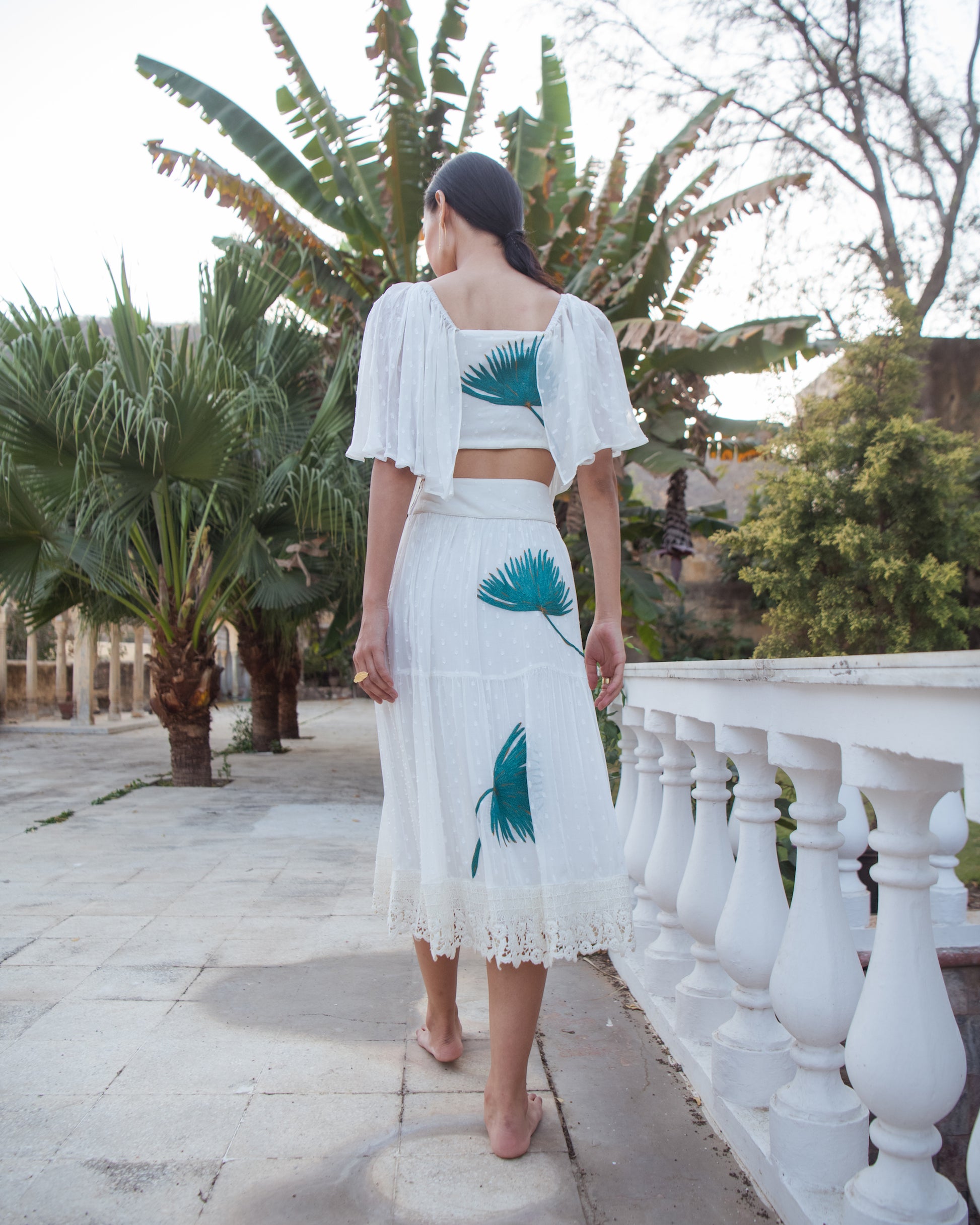 A resortwear attire, Cameron is a garment for breezy and lazy days. This laid-back, A-line skirt is extremely wearable. It is also high-waisted and comes with embroidered palm leaves, reminiscent of a holiday spent well, wherever you may be.