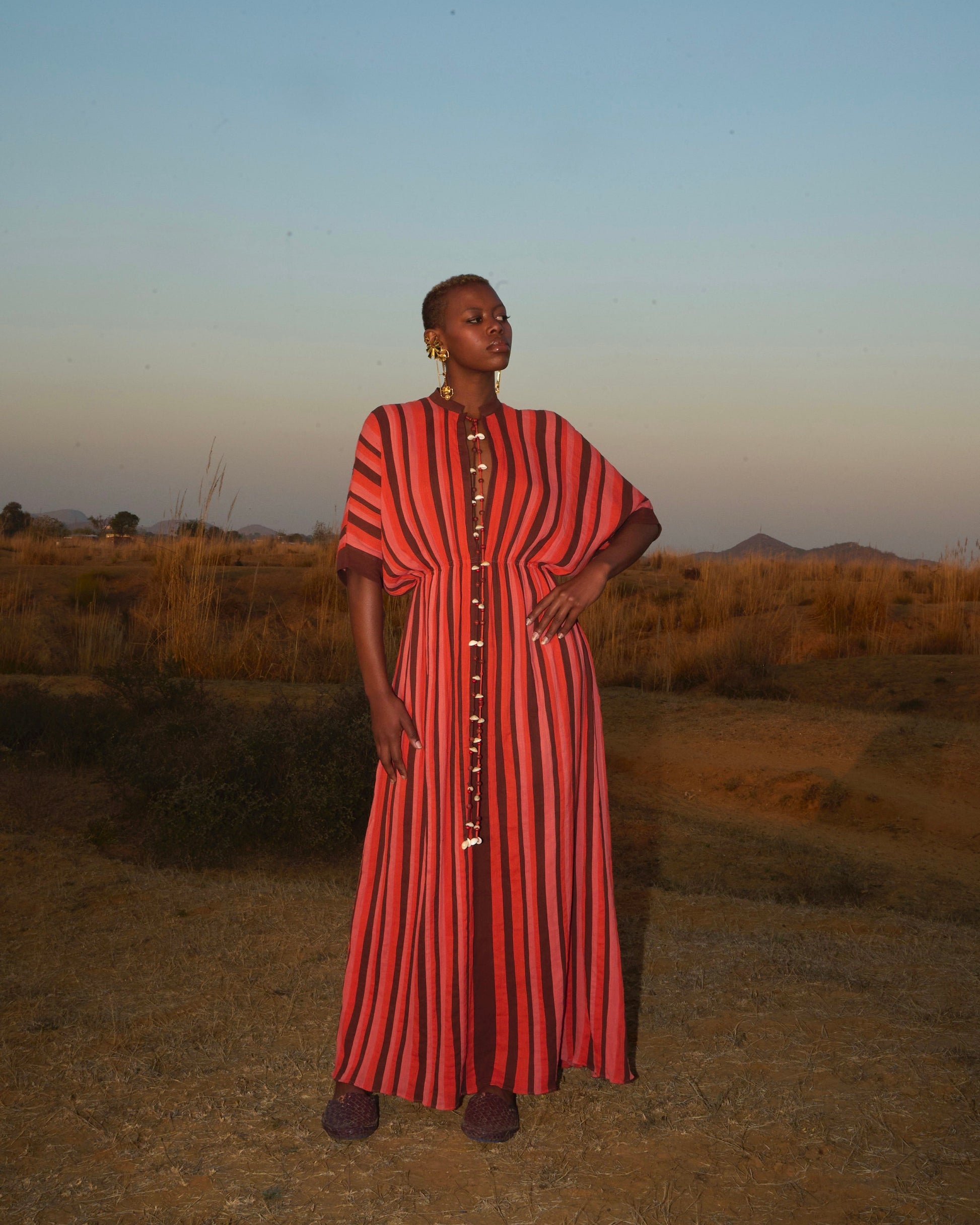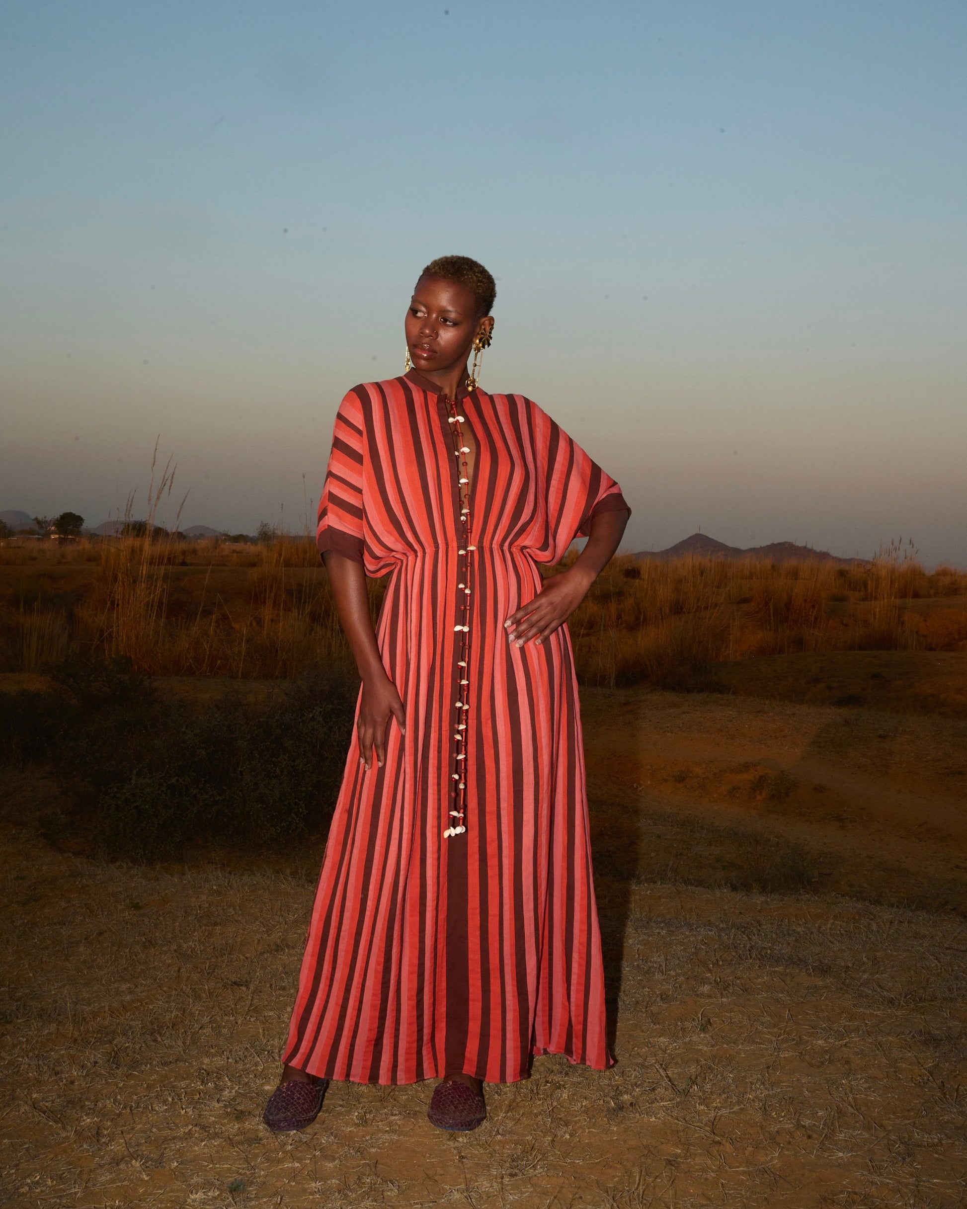 Pink and striped, with shell beads for adornment and a cinched waist, the Chinua Dress is gorgeous. It both feels and looks great. Pair it with sneakers, sandals or heels. Wear it anywhere and everywhere.