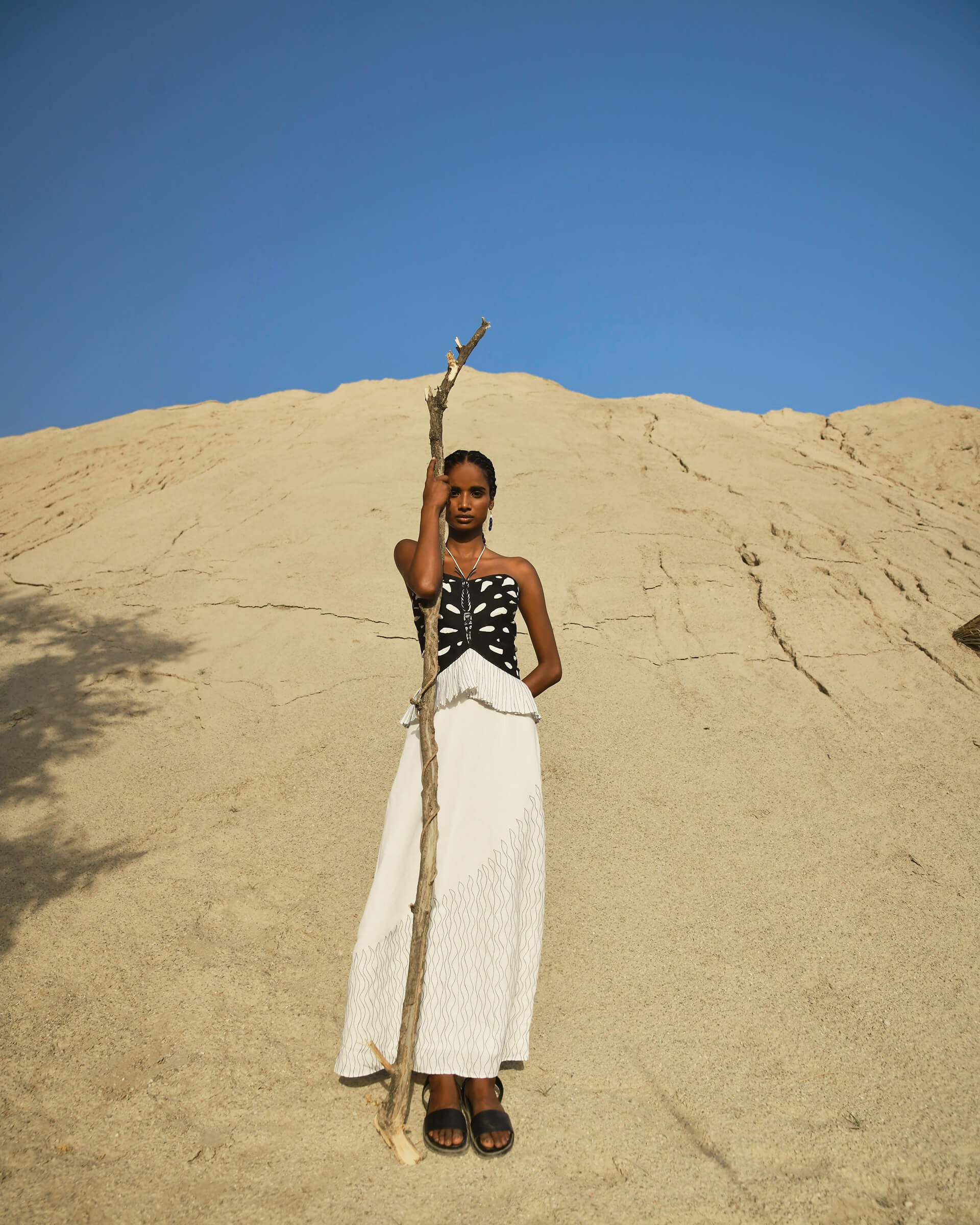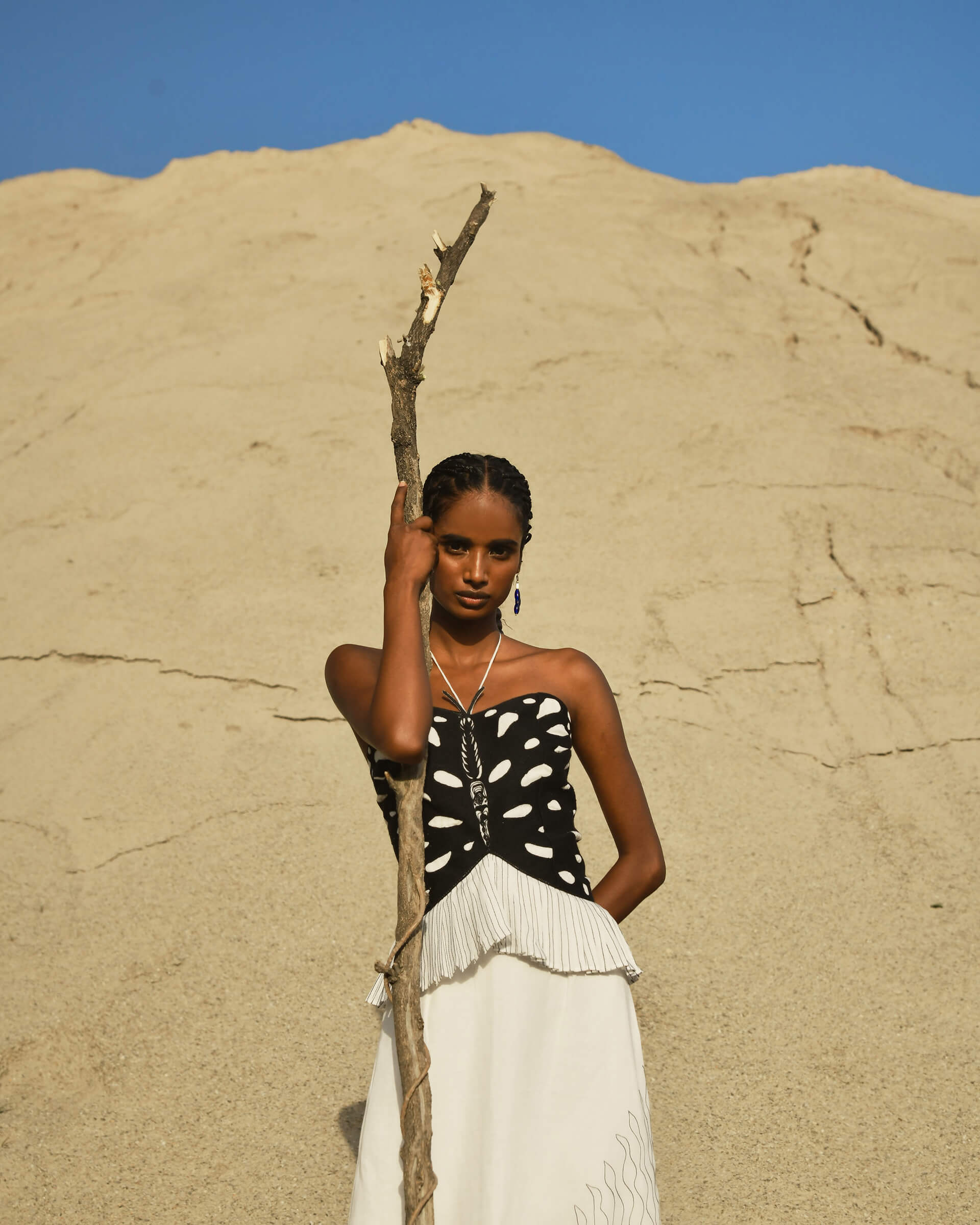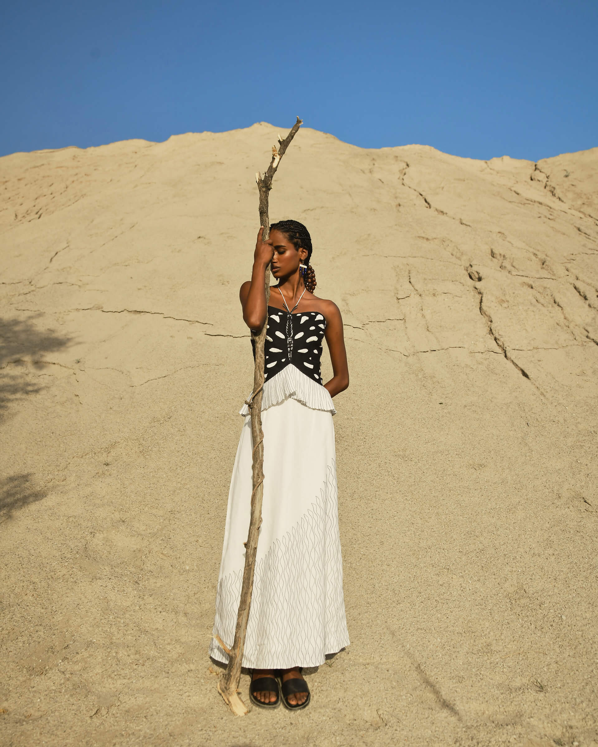 Wearing the Cleopatra Dress, you will feel like a beautiful moth traversing through a wild world. The speciality of Cleopatra lies in its carefully embroidered details. A moth completely fills up the richly crafted halter top, which you can adjust to your preference. Below, the dress features a hand-pleated waistline, a pleated frill and a long skirt in pure linen that falls beautifully to the ground. A statement piece, Cleopatra is a handmade garment to be loved and cherished for a long time.
