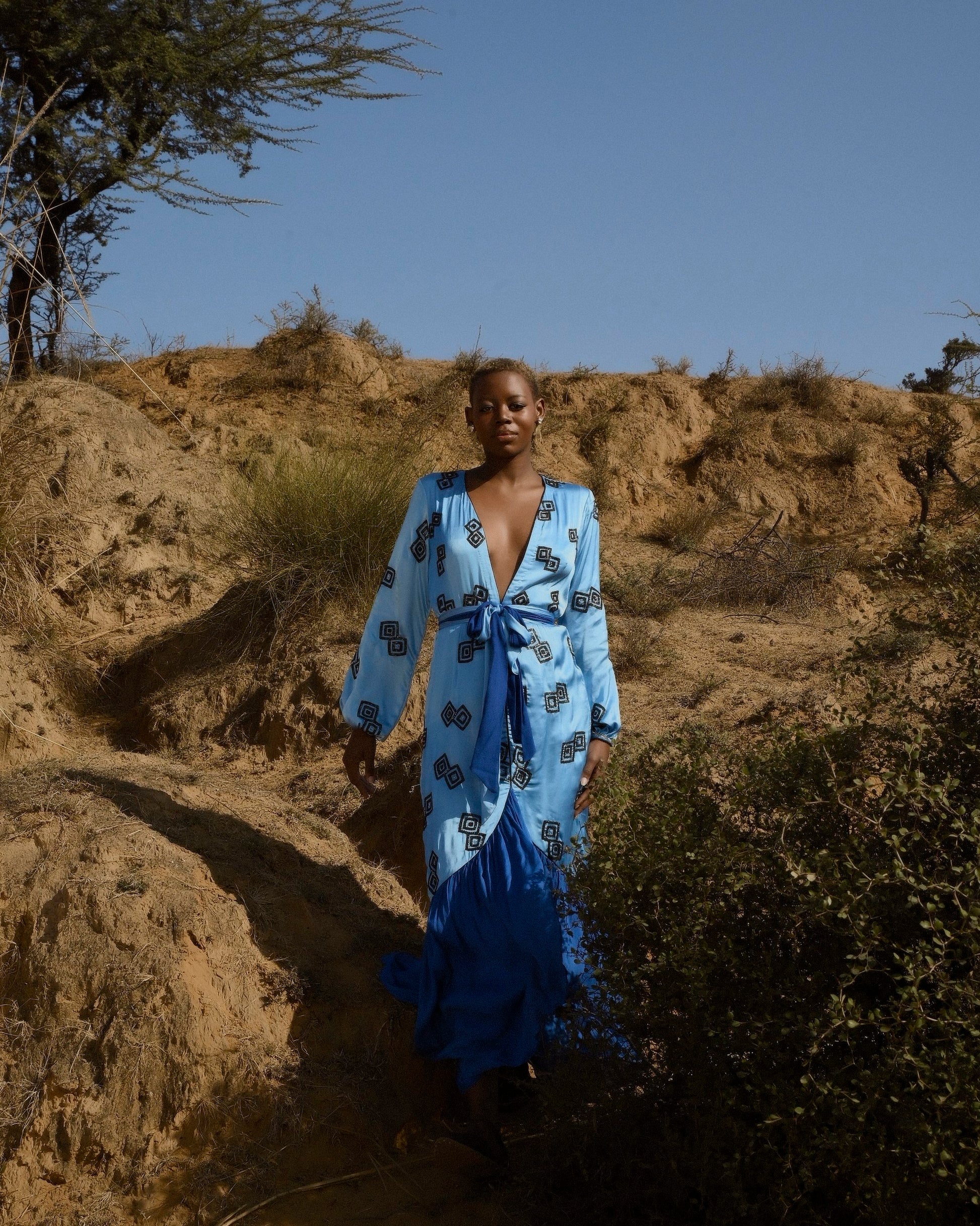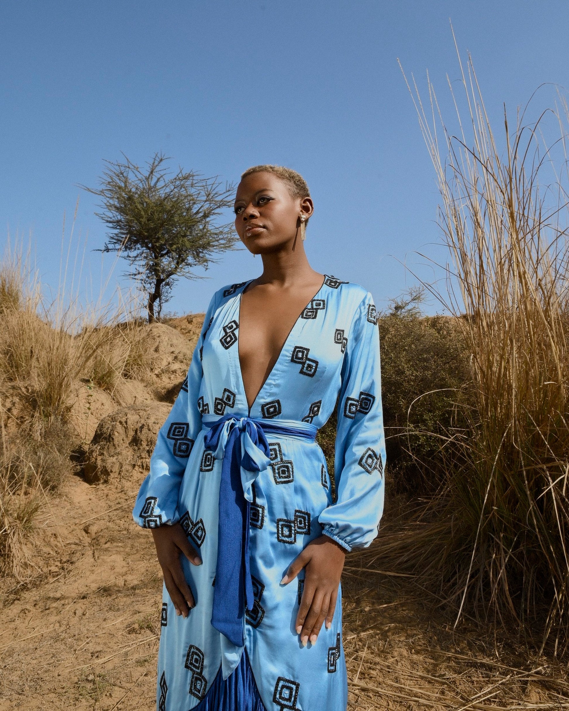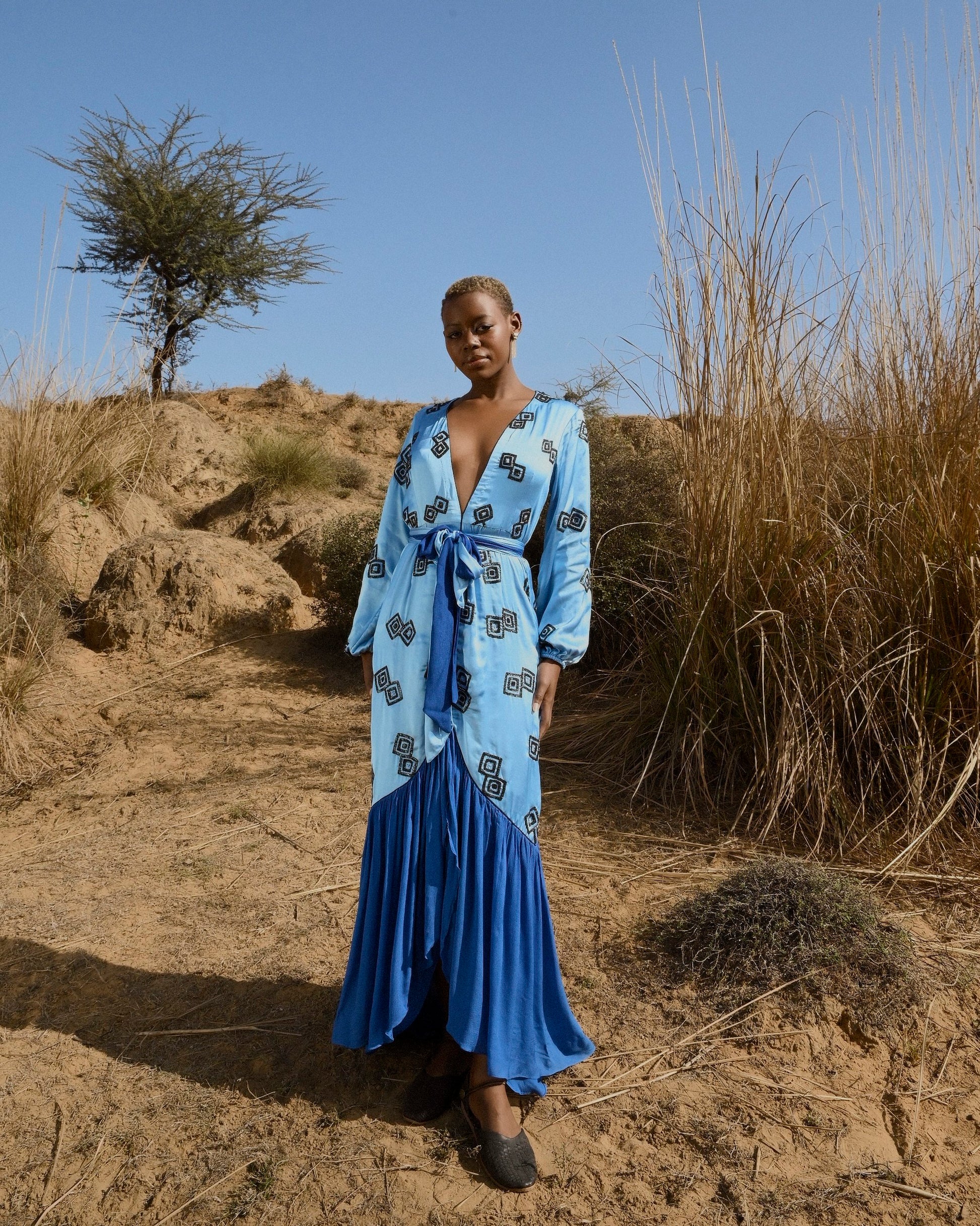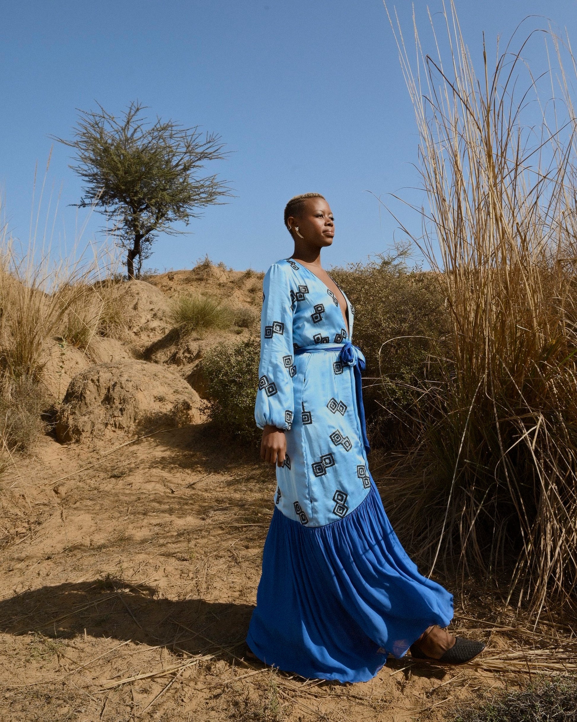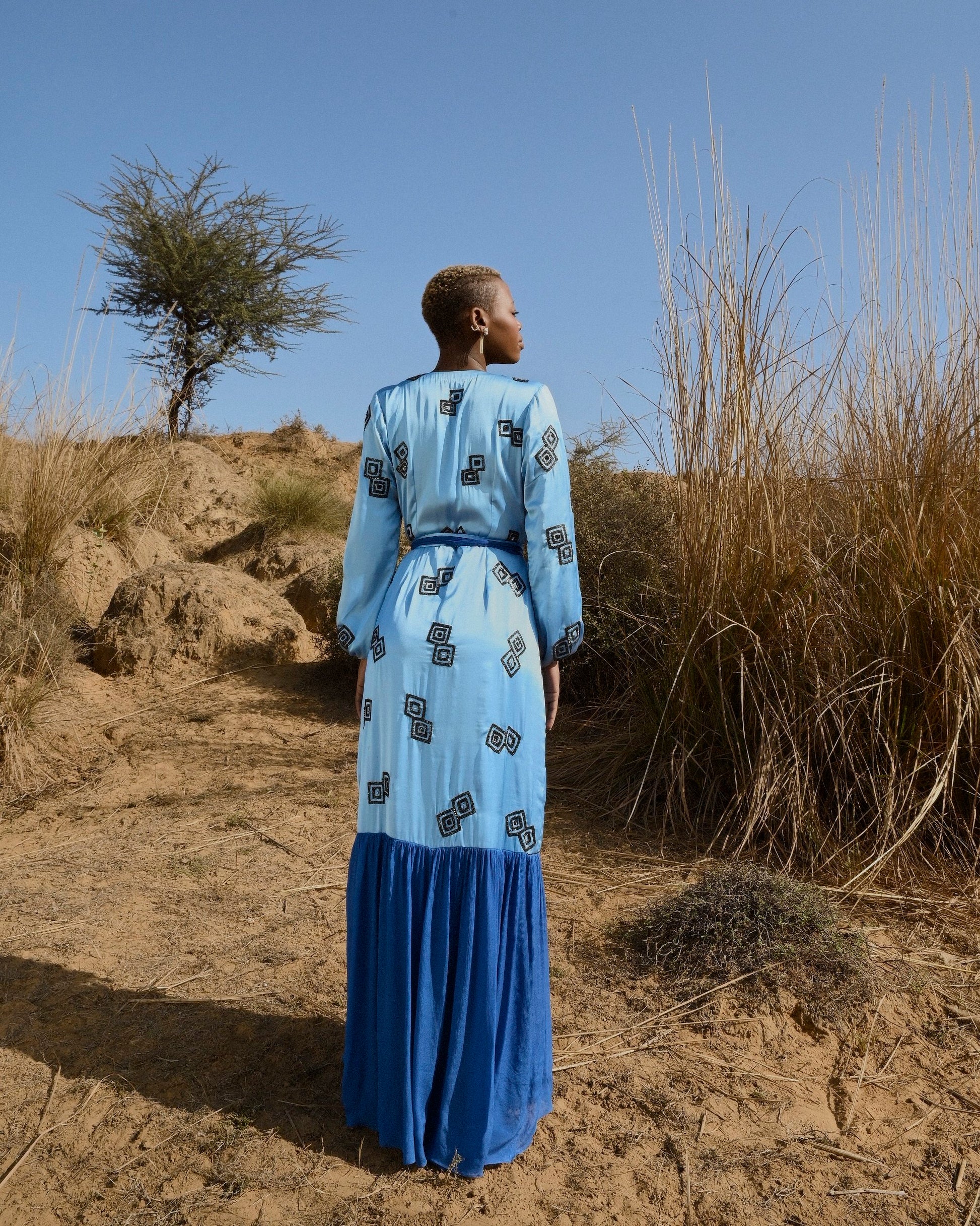 Pale blue, with a beautiful deep neckline and hand-embroidered geometrical motifs - the Donna Dress is a head - turner. Wear this for a special occasion or a date night.