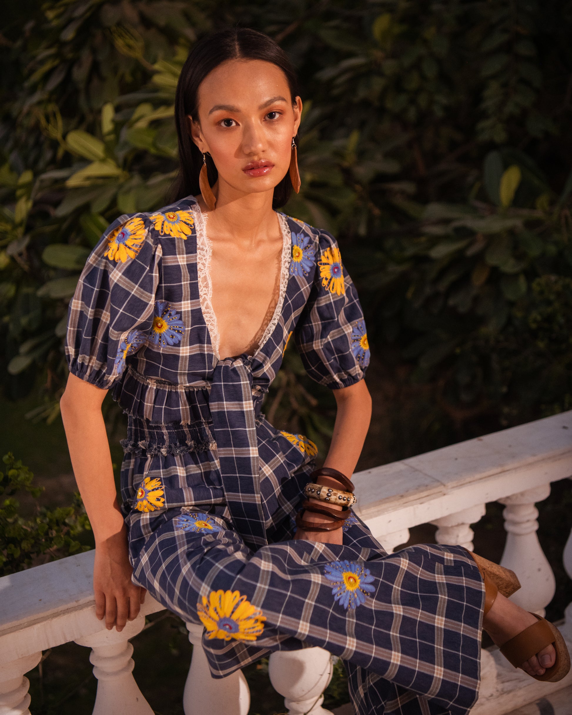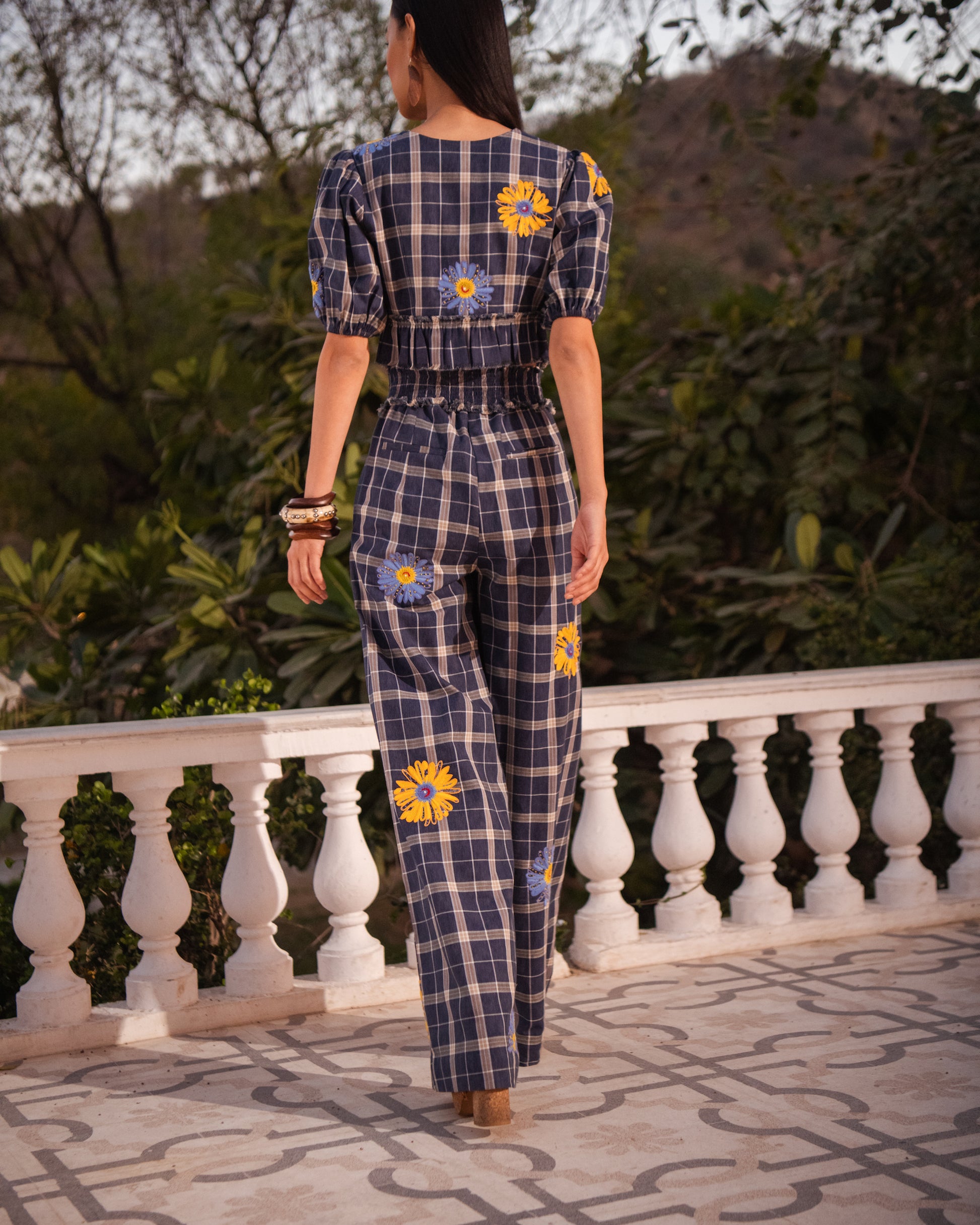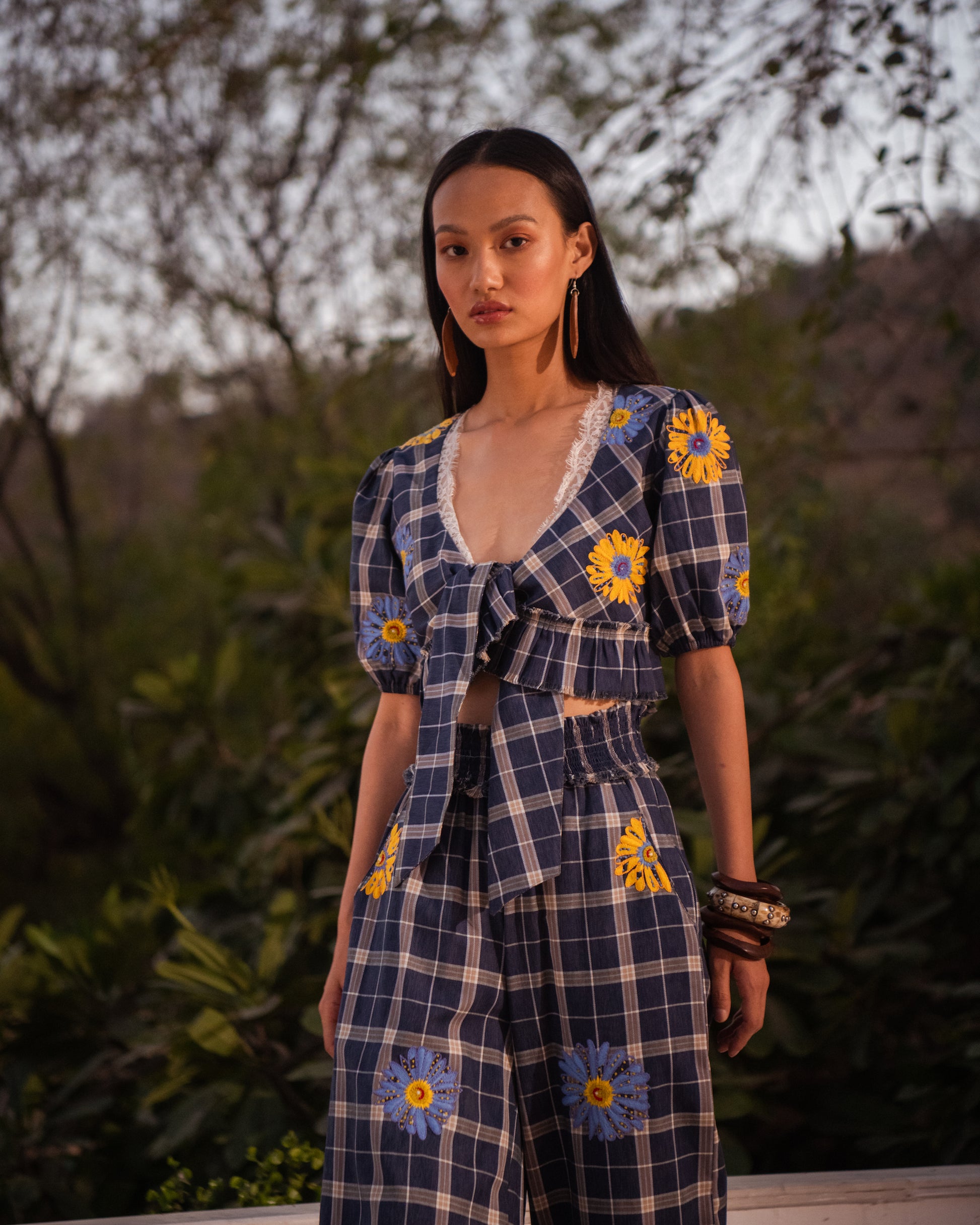Bohemian and chic, the Daisy Denim Crop Top is checked and features a tie-up front, lace detailing and bright, embroidered daisies. This outfit is inspired by all things pop art and retro, and takes you back to the fashionable eras of the 60s and 70s.