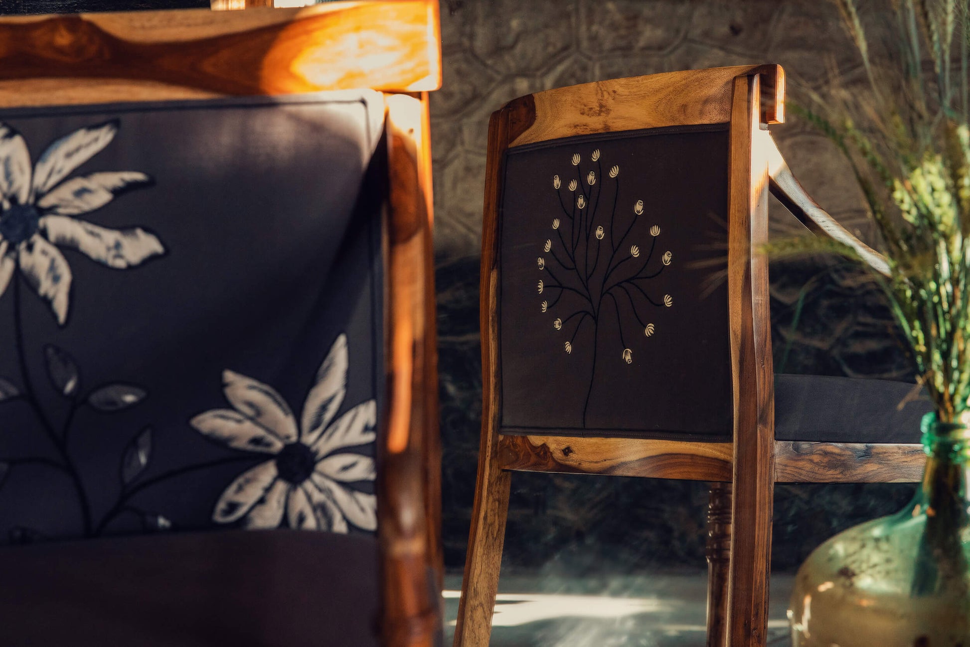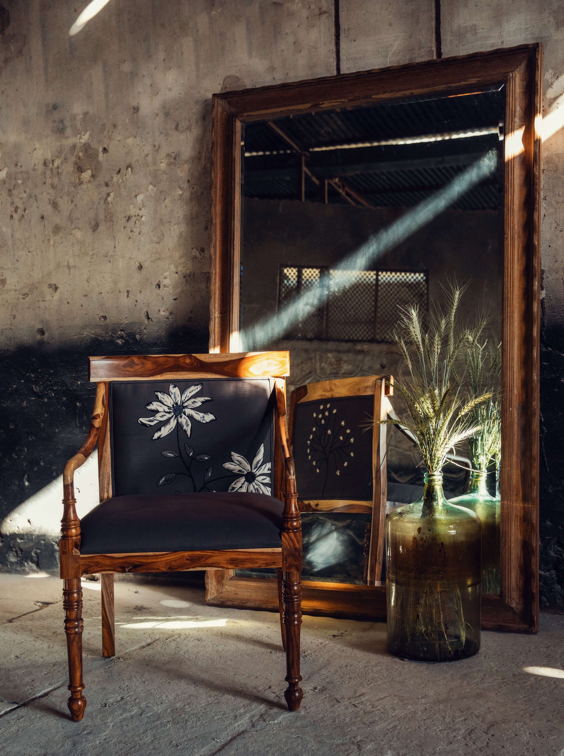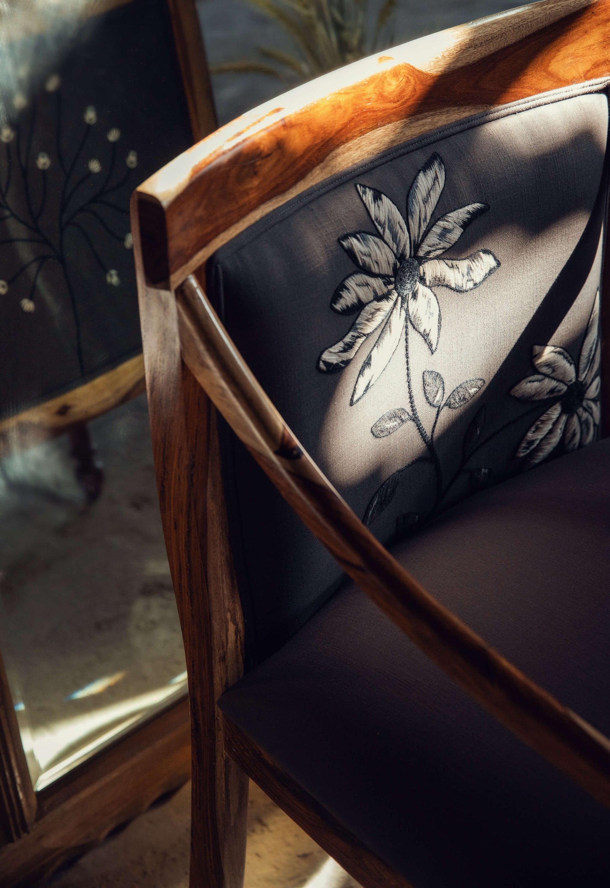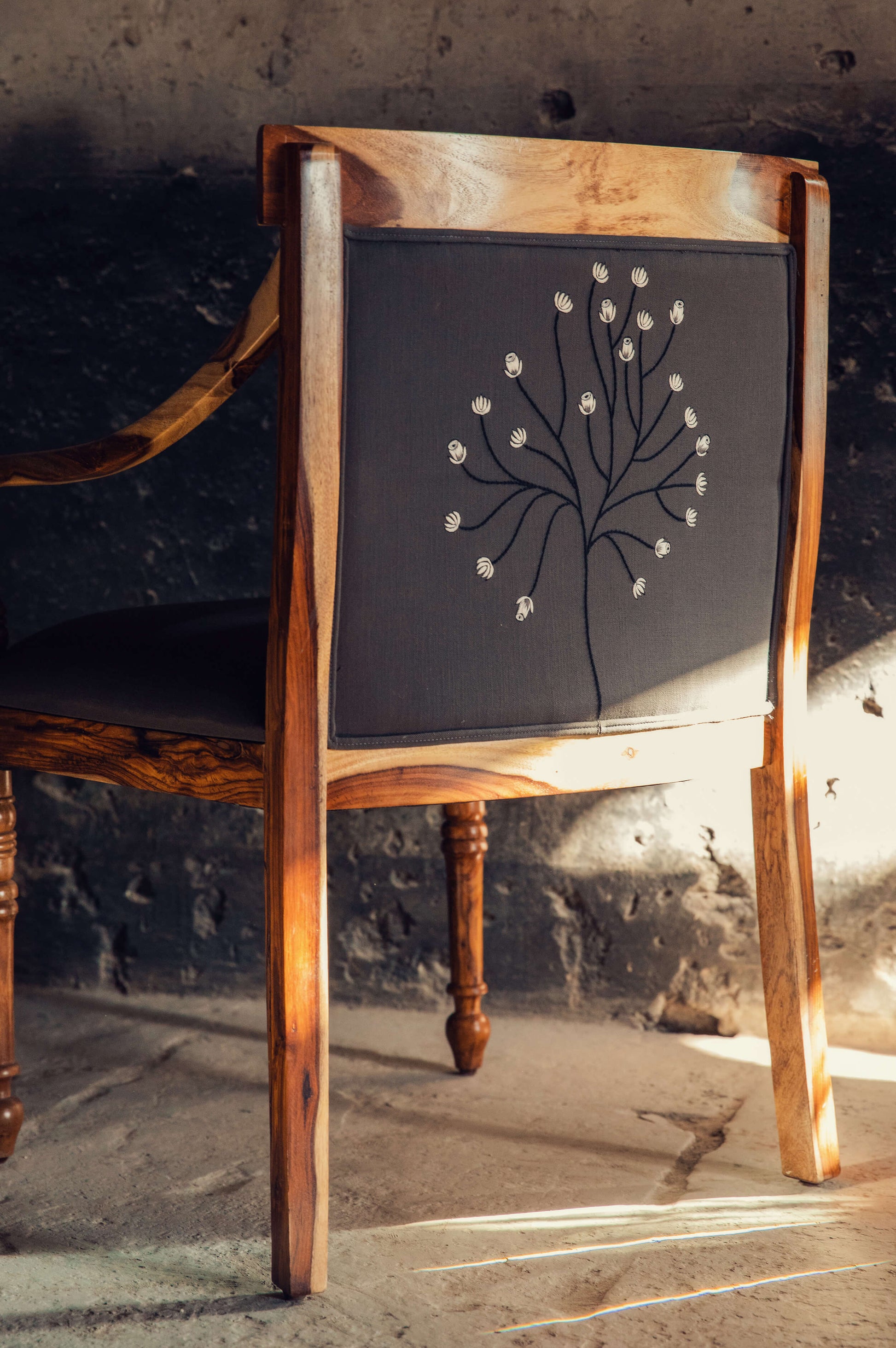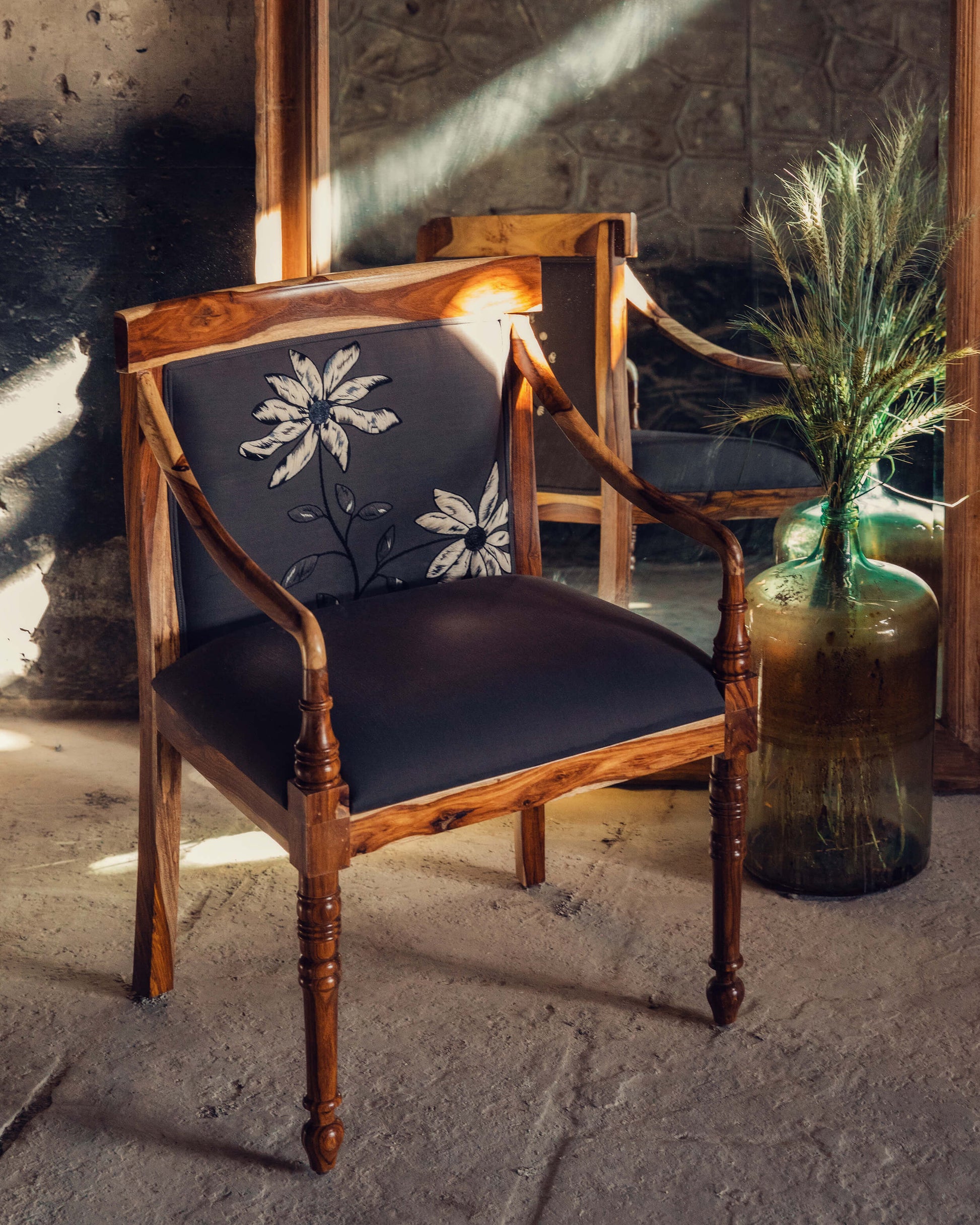 The Damien Chair is bold and stately. African daisies, drawn on paper with charcoal, have been recreated in embroidered form on this furniture product. It is made using sheesham wood and a linen-cotton back and seat. Use it as a dining chair, seating for your living room, or a standalone chair for your bedroom or walk-in closet.