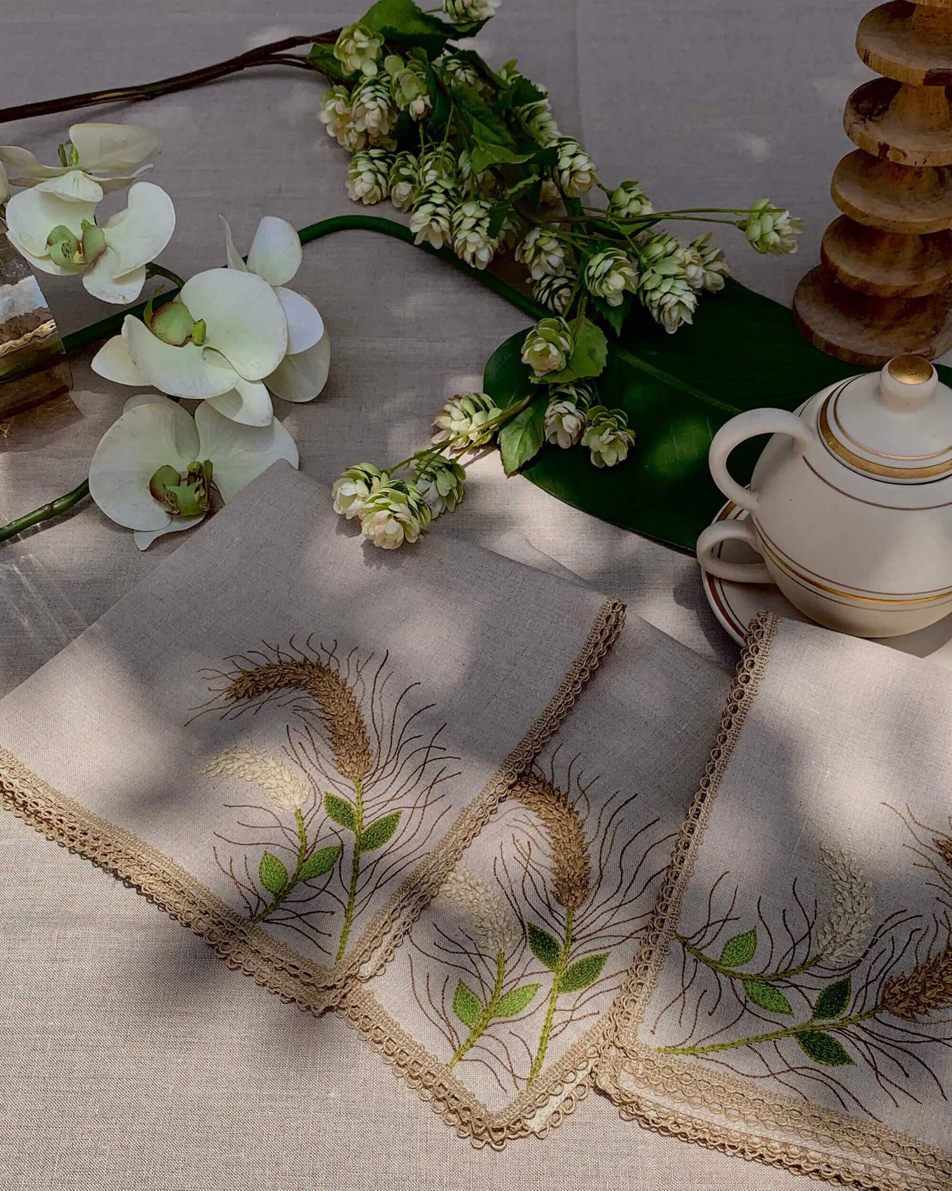 Meticulously embroidered by hand, the Darla Table Napkins are beautiful additions to your table linen collection. These beige coloured napkins feature natural motifs, and come hemmed with pretty lace.
