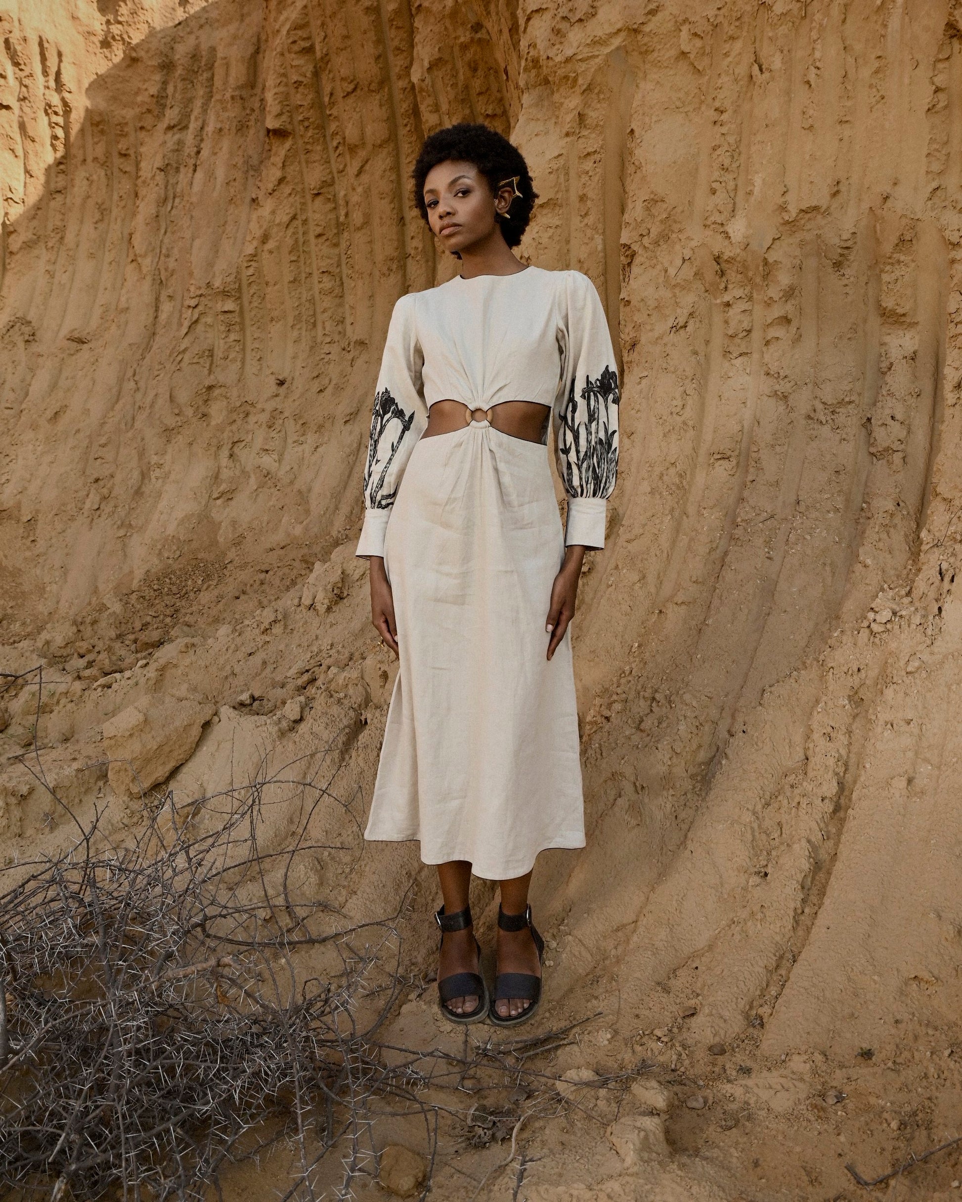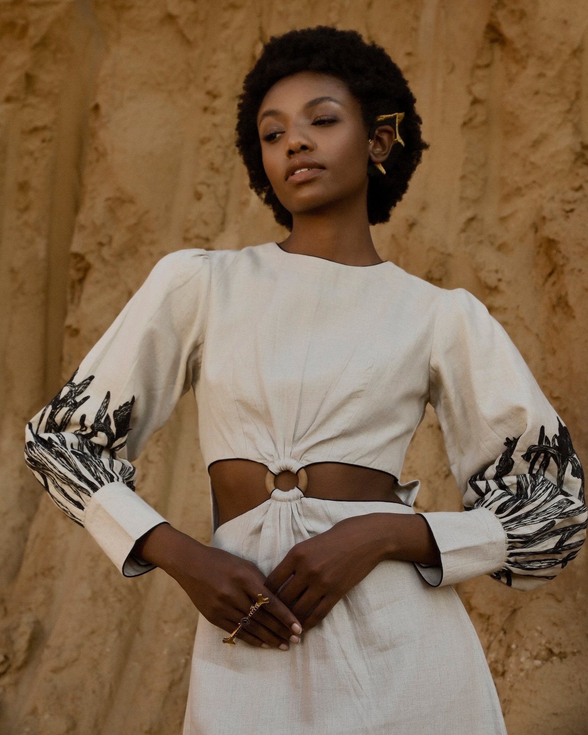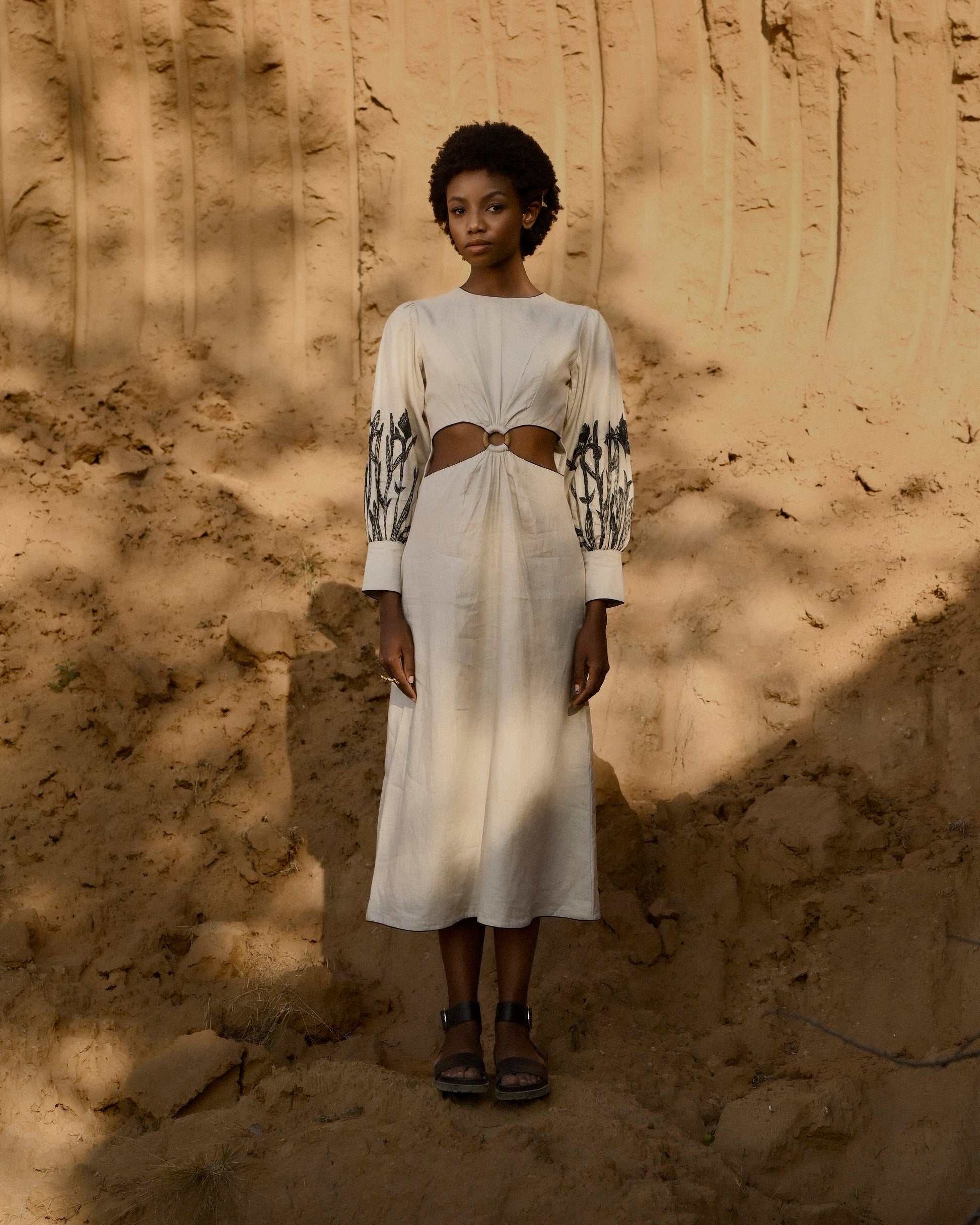 The Dora Dress is a minimalist garment that features hand-embroidered details on its pretty sleeves. The mid - riff comprises cut-out elements. Wear this easy breezy dress for a day out or at home.