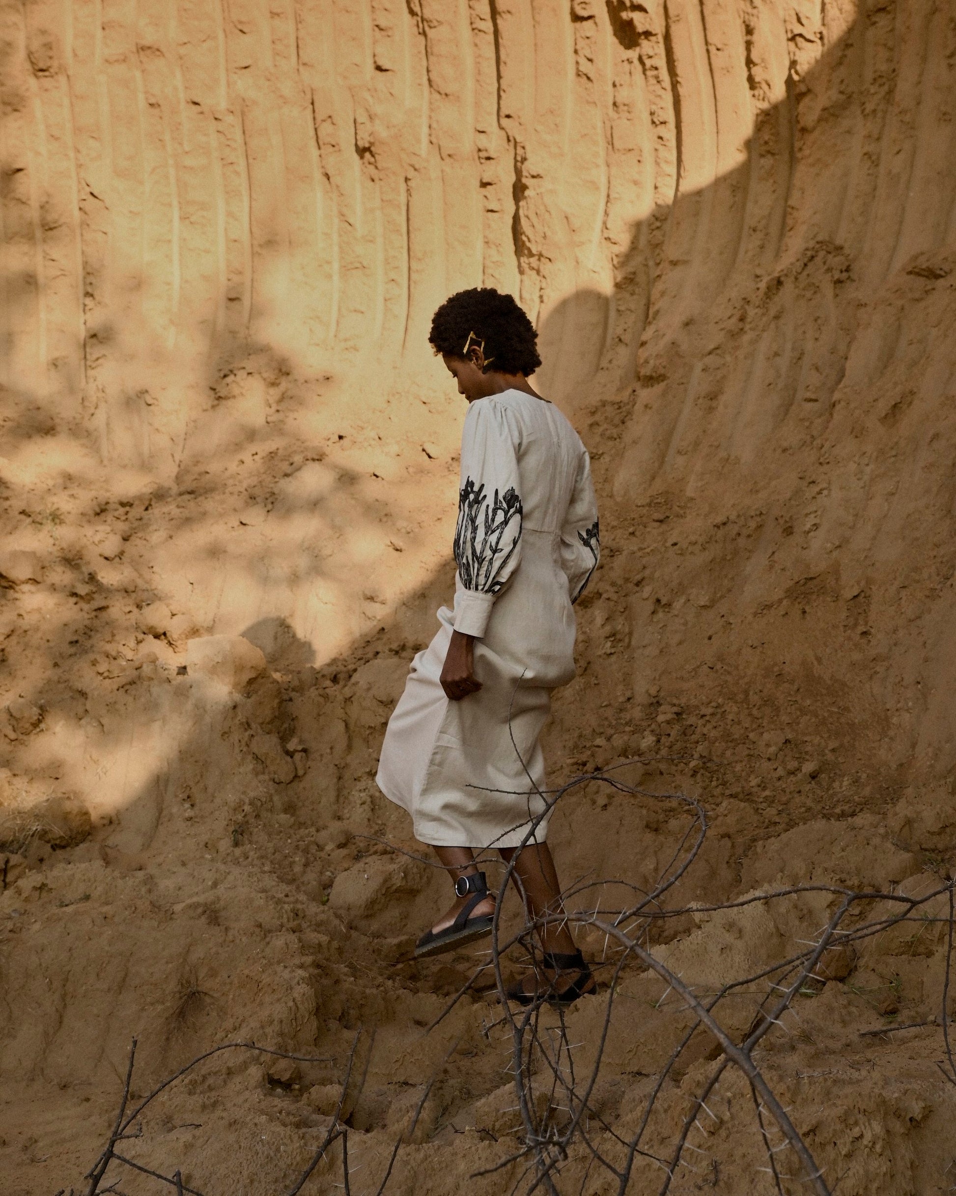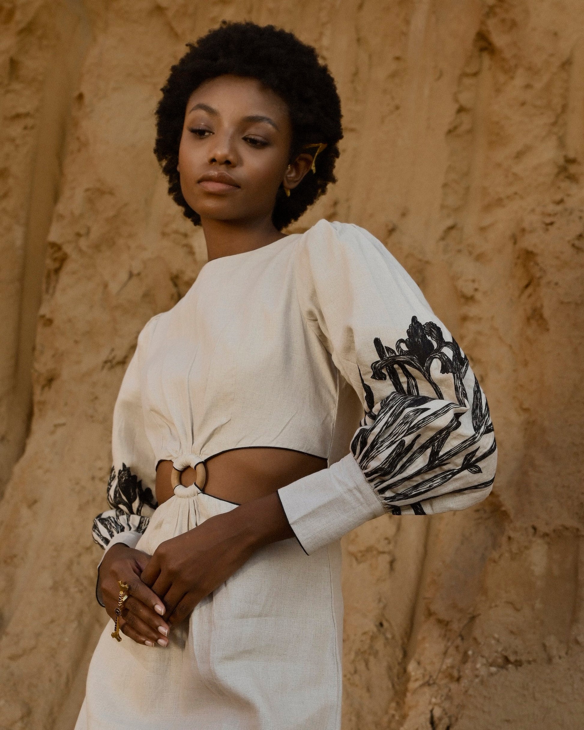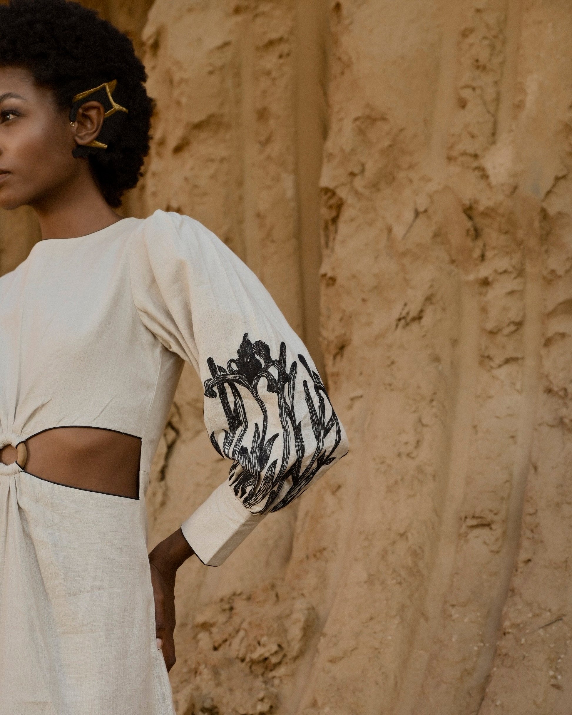 The Dora Dress is a minimalist garment that features hand-embroidered details on its pretty sleeves. The mid - riff comprises cut-out elements. Wear this easy breezy dress for a day out or at home.