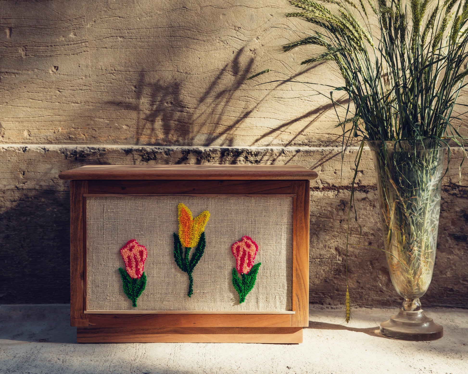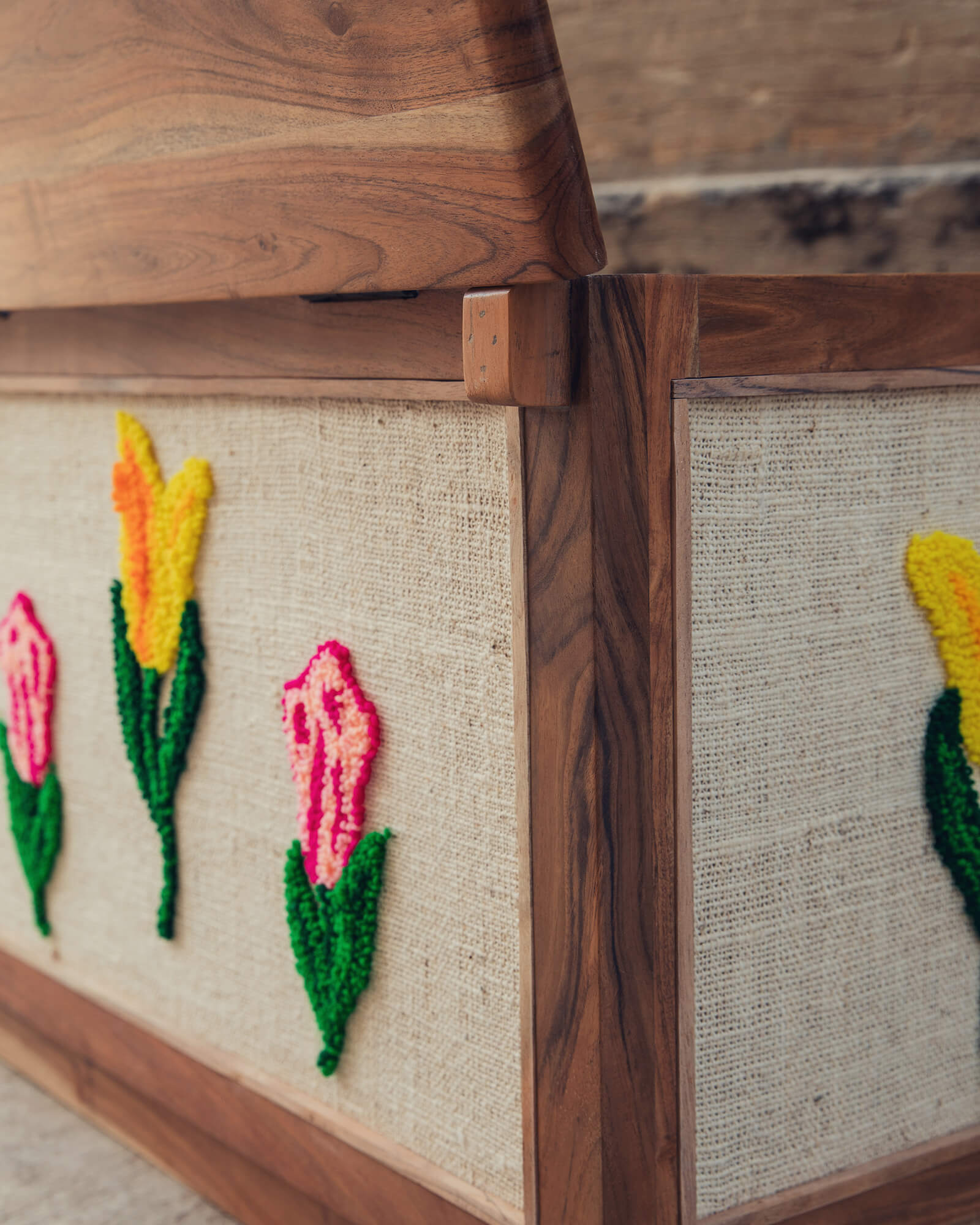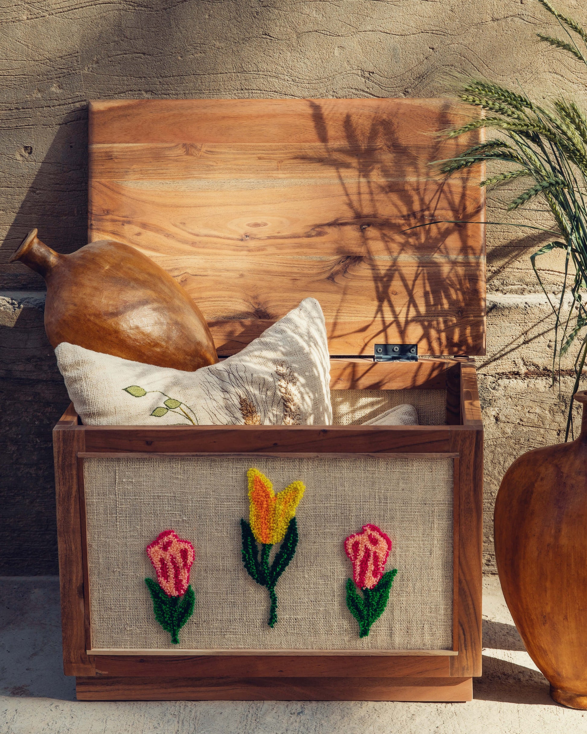 This is the storage box of your dreams. It comes with embroidered tulips on khadi, and just enough space for your essential things. Made using solid acacia wood in a natural finish, the Eden Box can be a whimsical treasure trove, providing both utility and beauty. Brighten up any space in your home with this unique product.