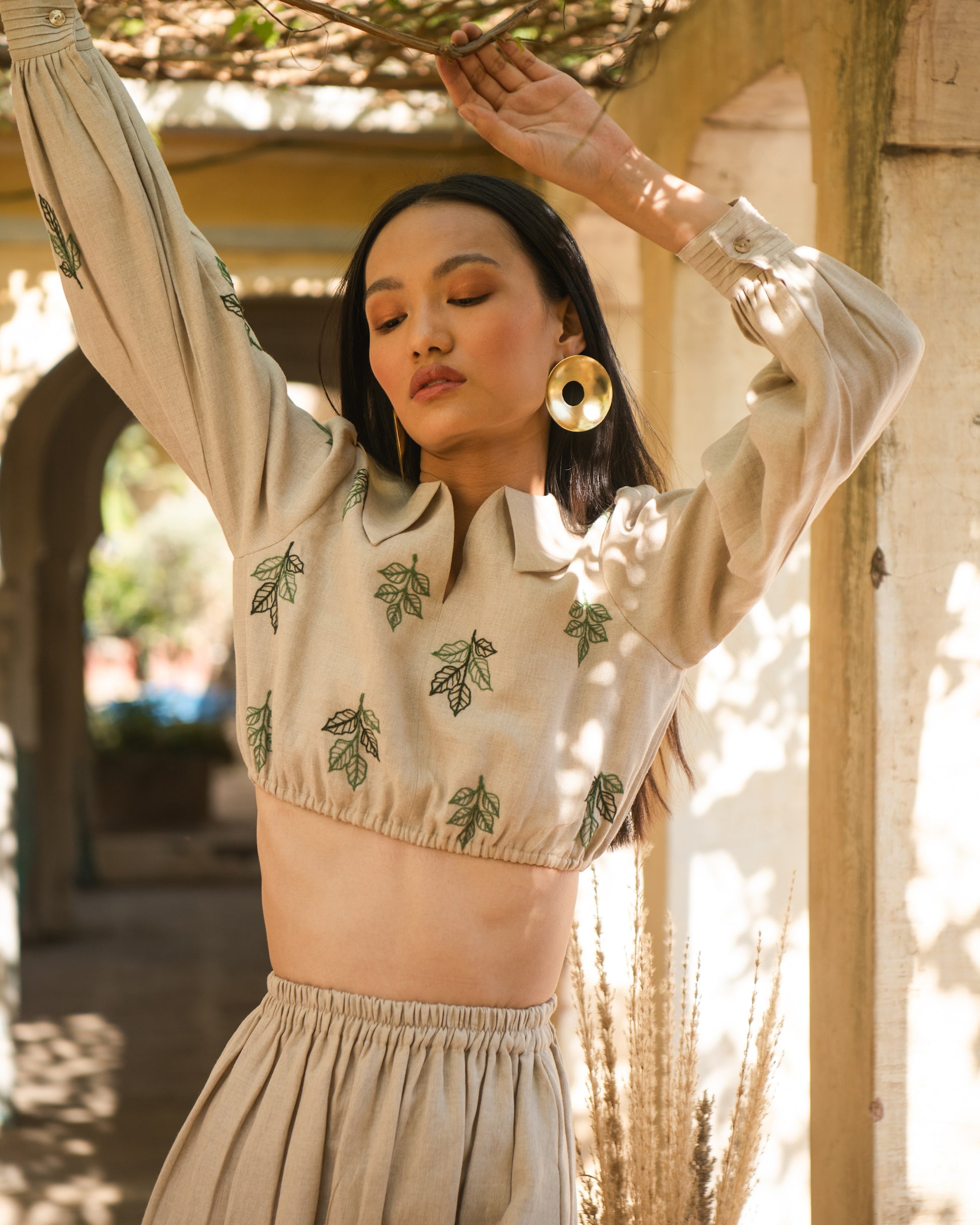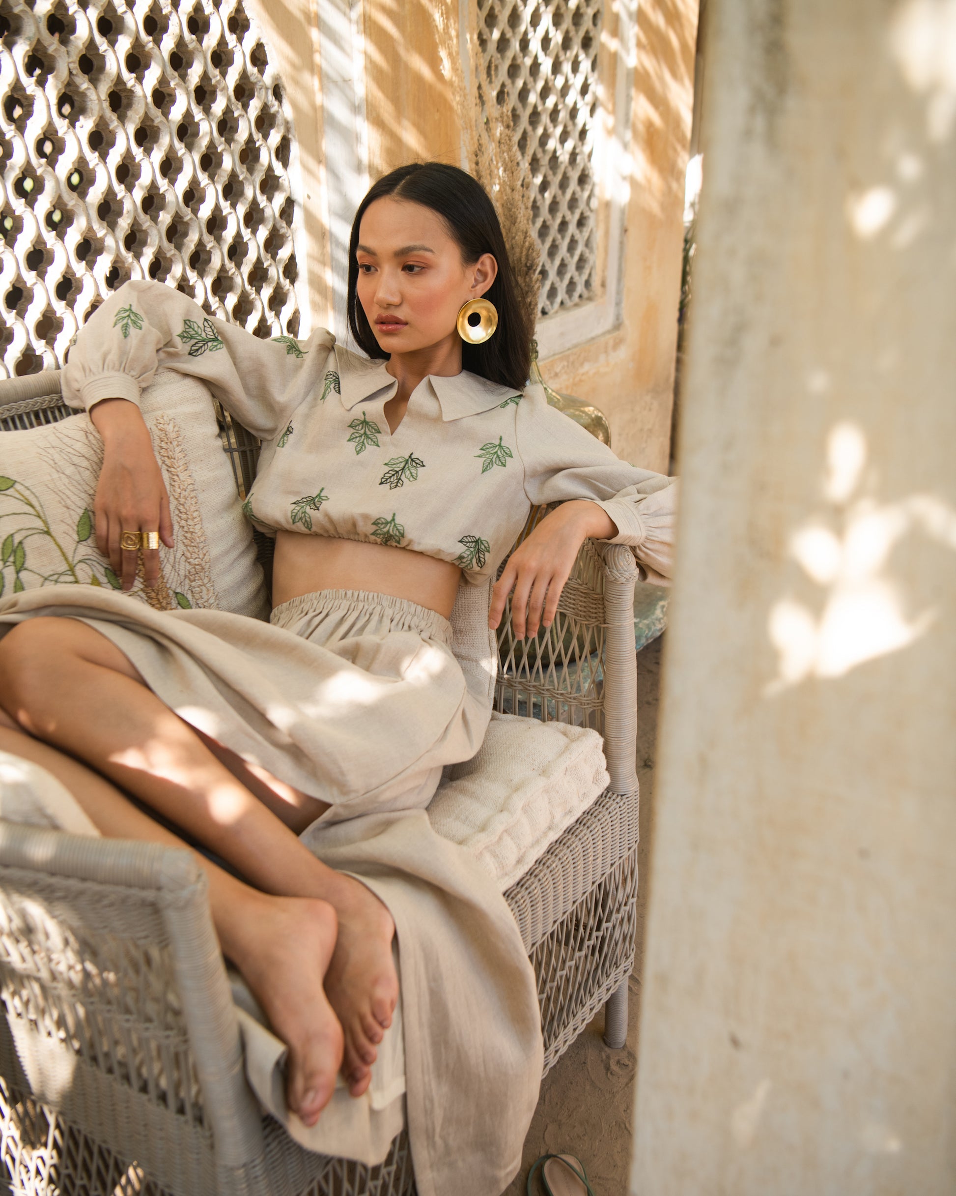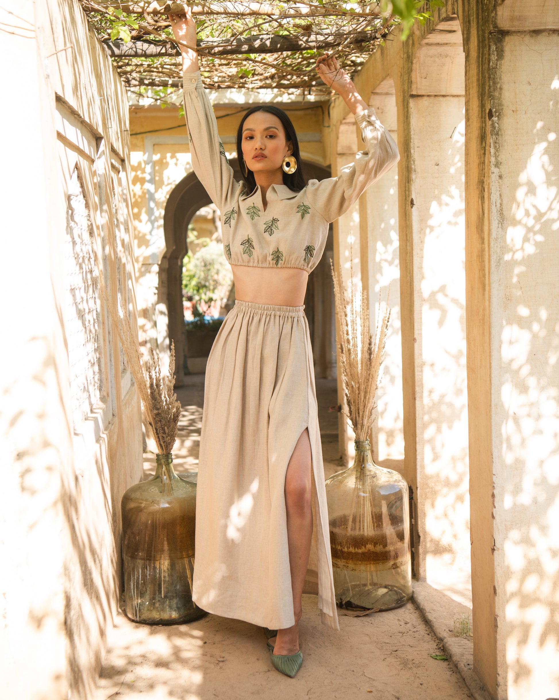 High-waisted, long skirt with a side slit. The skirt's neutral beige tone makes it an easy garment to pair with a large variety of tops and shirts.