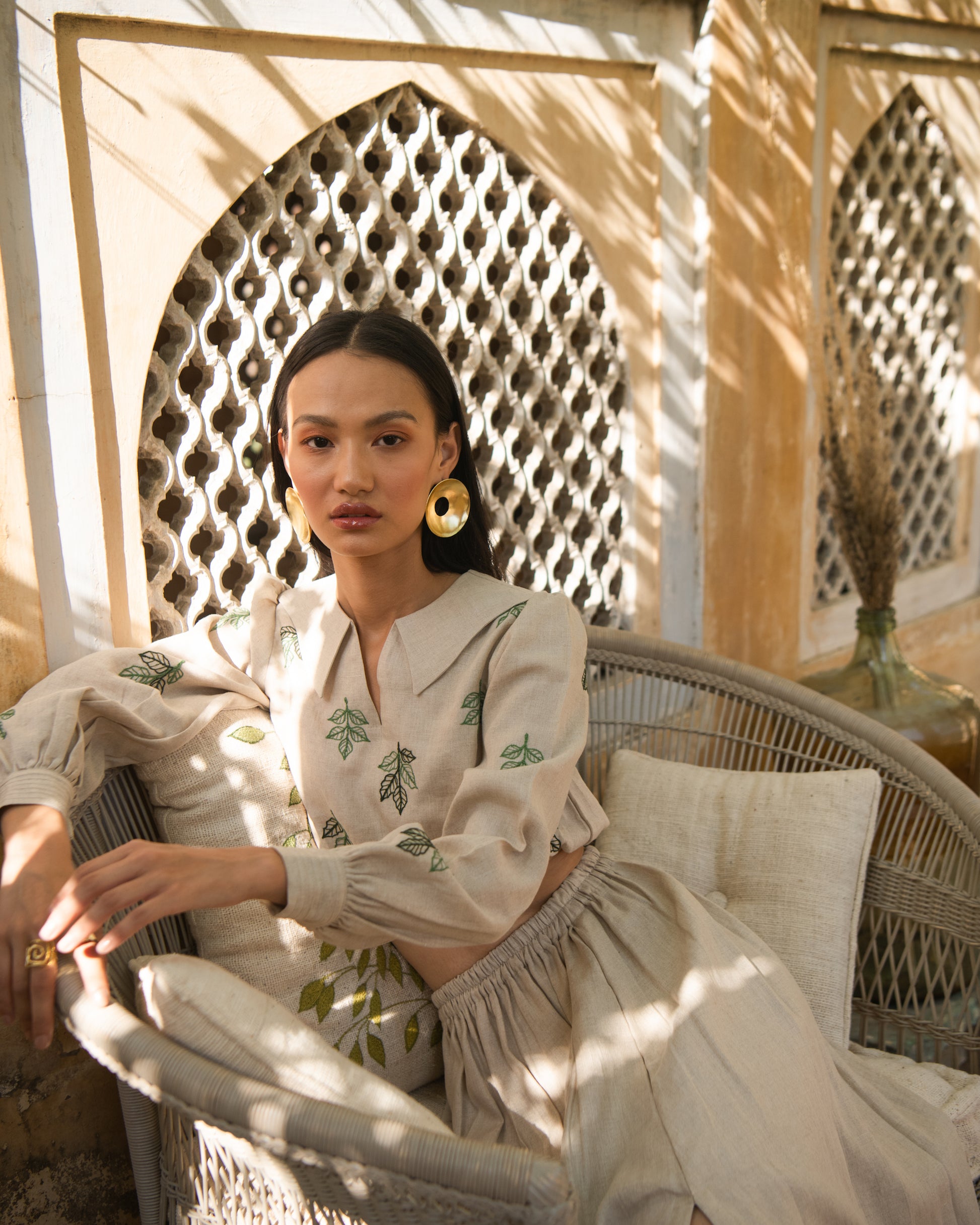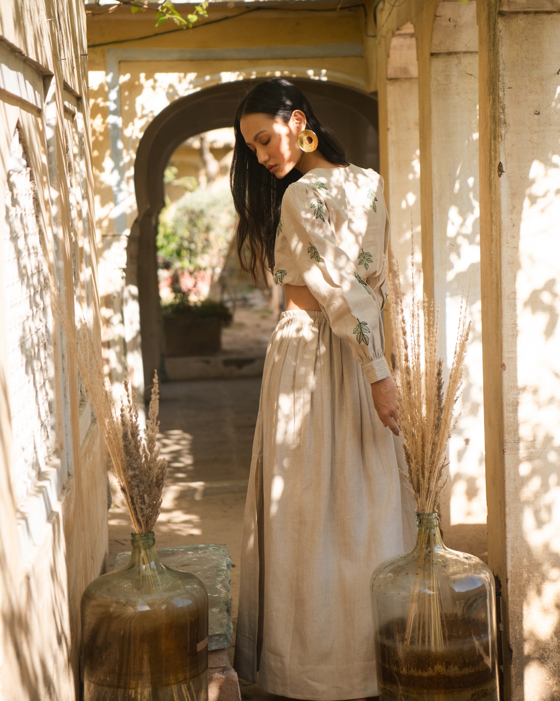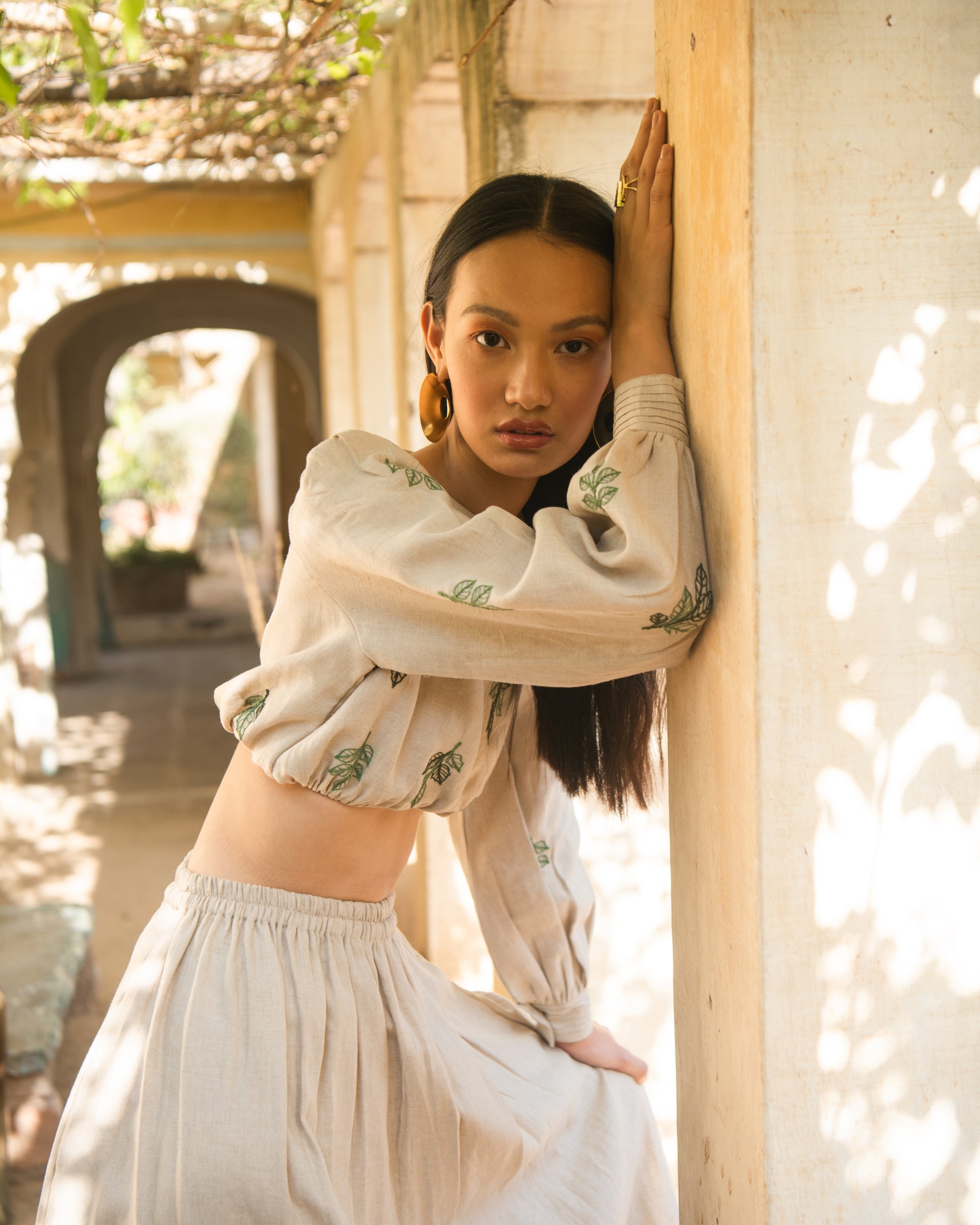 Collared crop top with embroidered leaves, in an evergreen beige colour that can be paired with a large variety of ensembles.