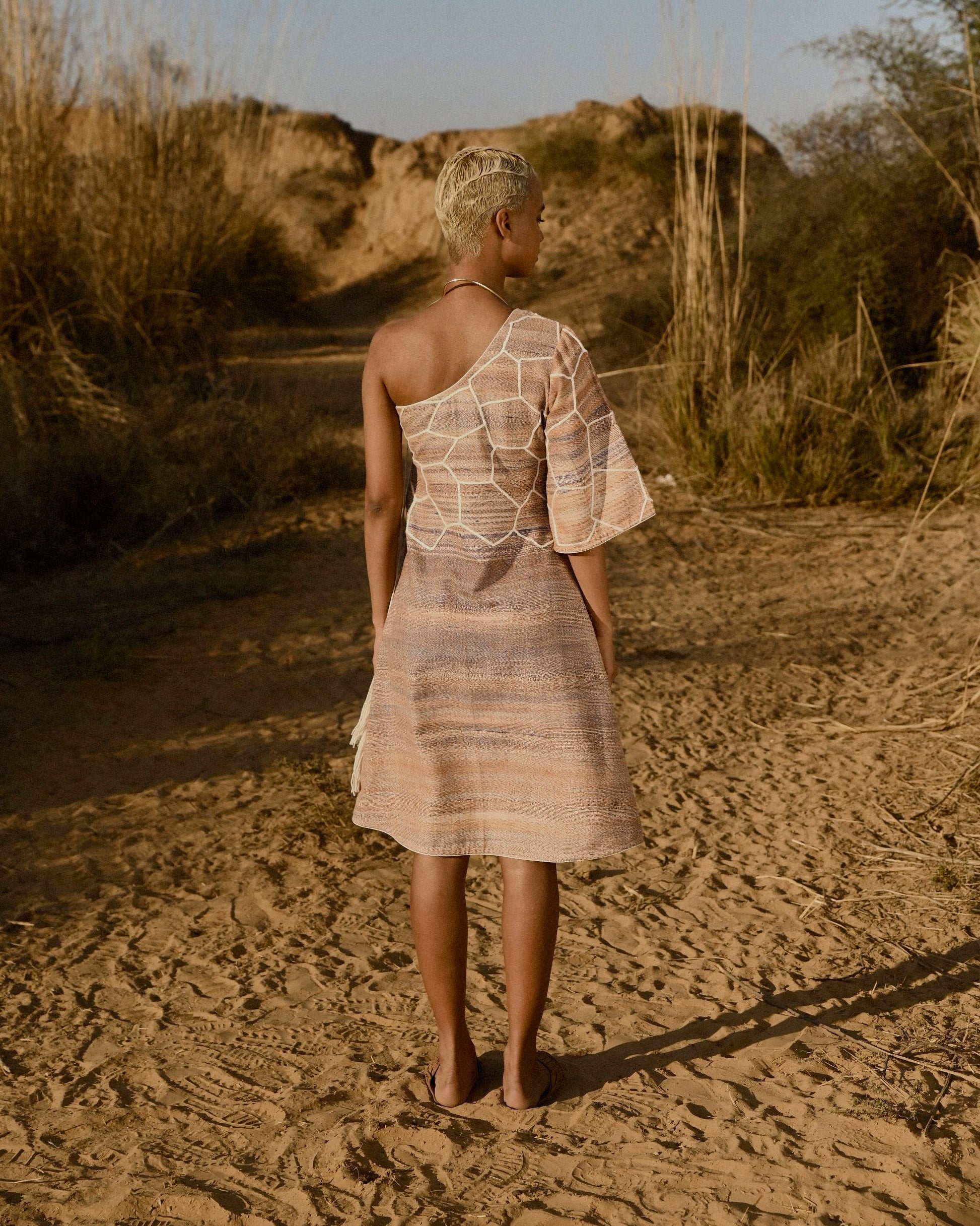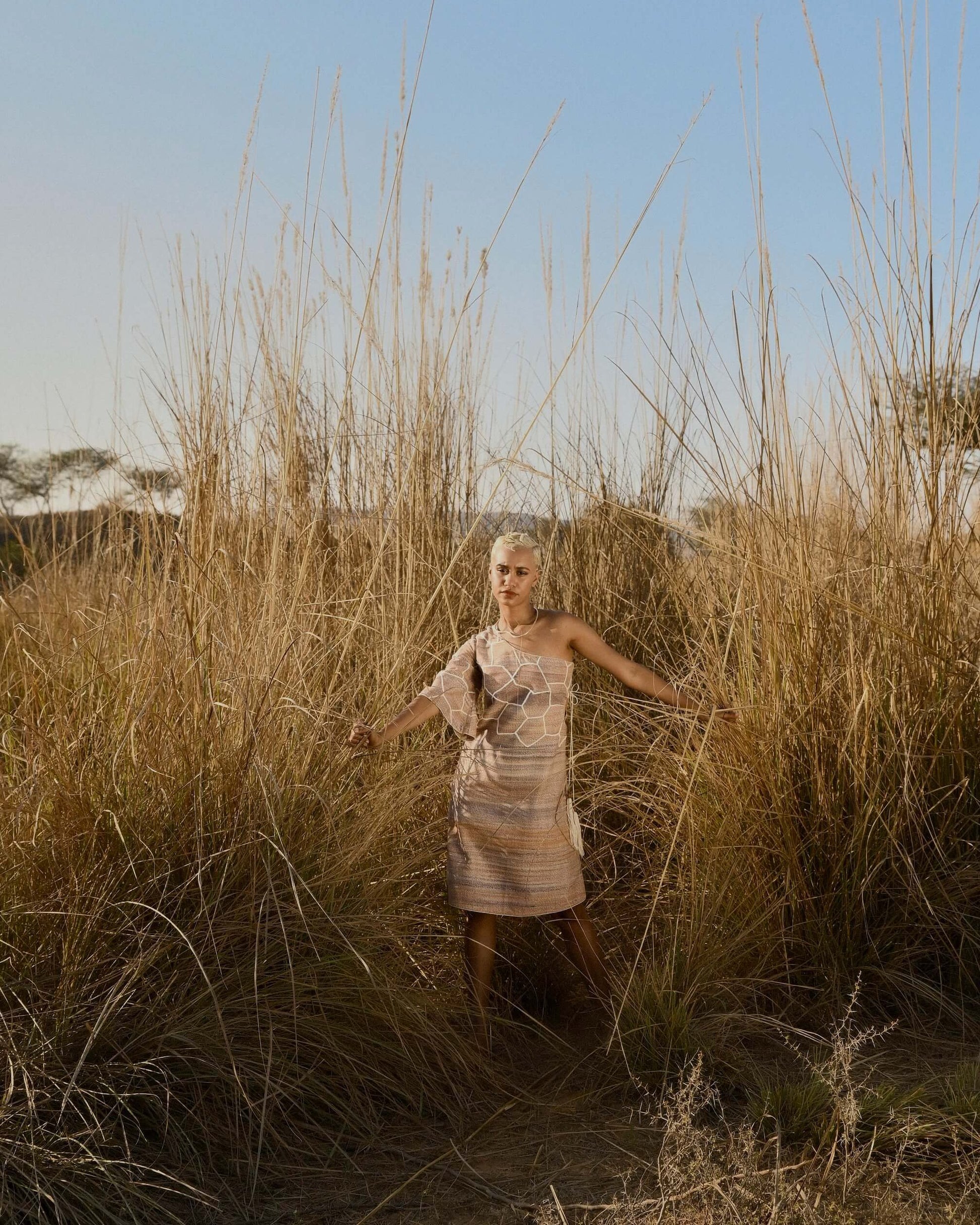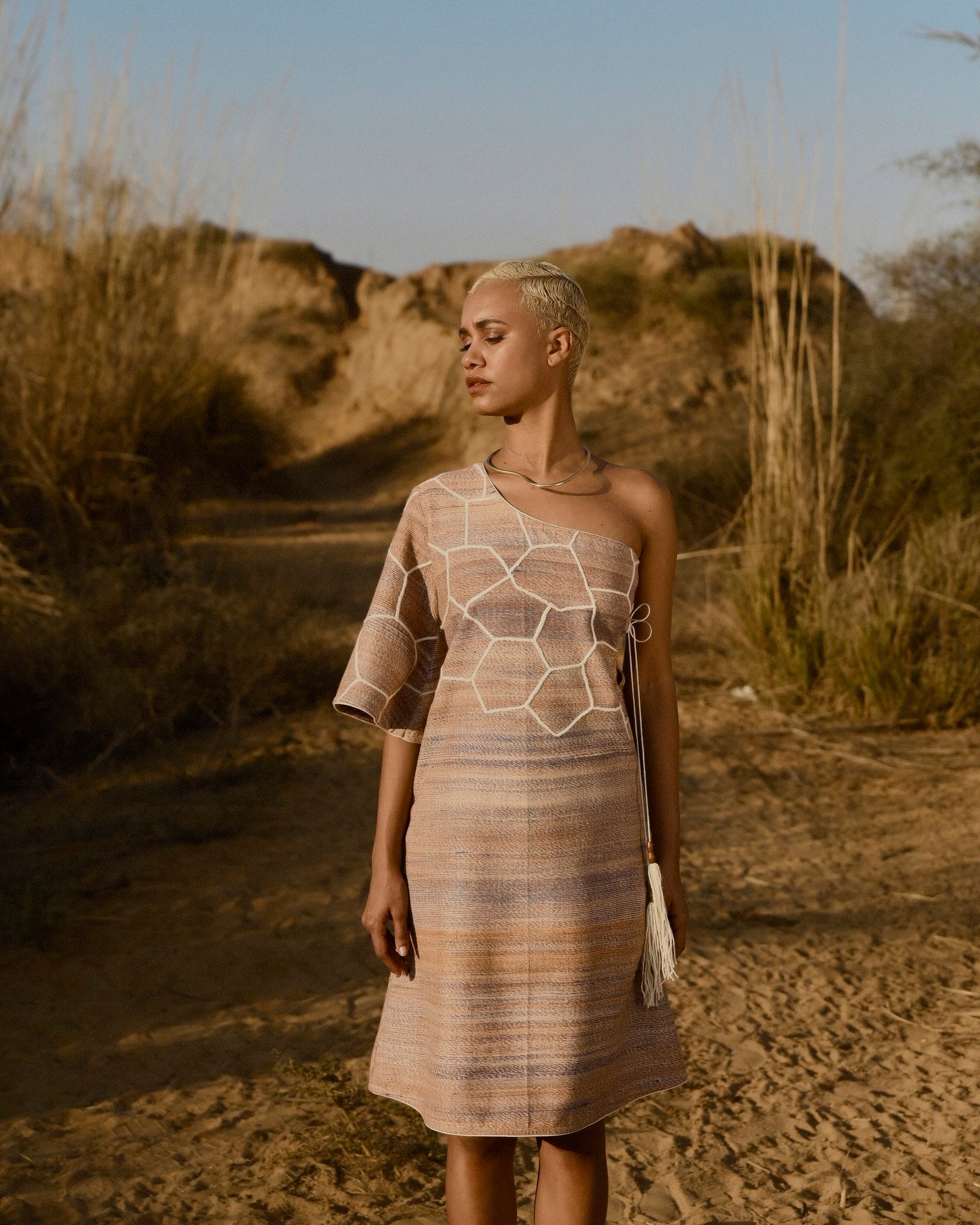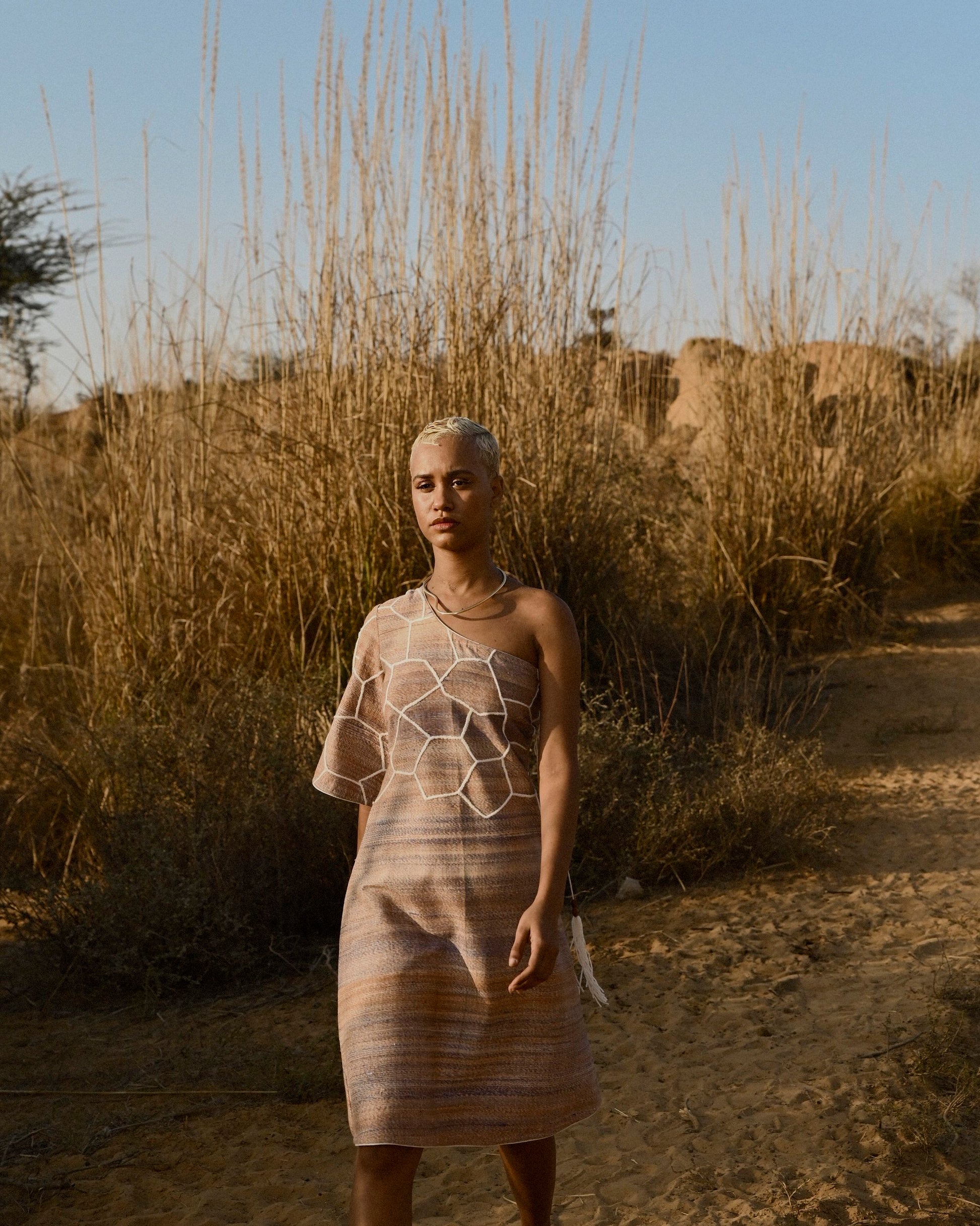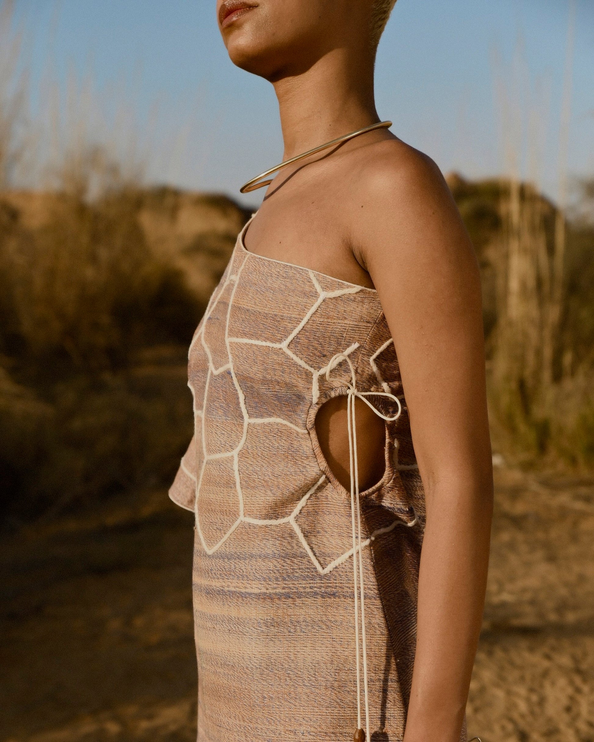 The Gazelle Dress draws inspiration from the African landscape. Patterns found on giraffes have been delicately embroidered on the top, while tassels adorn the dress on the side.