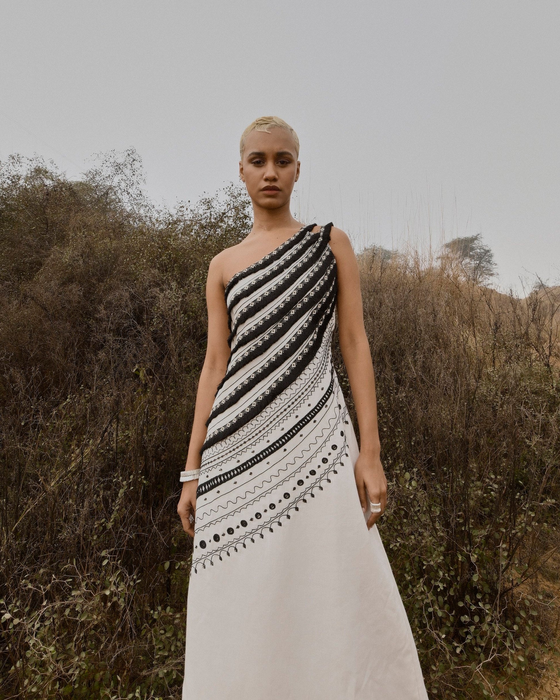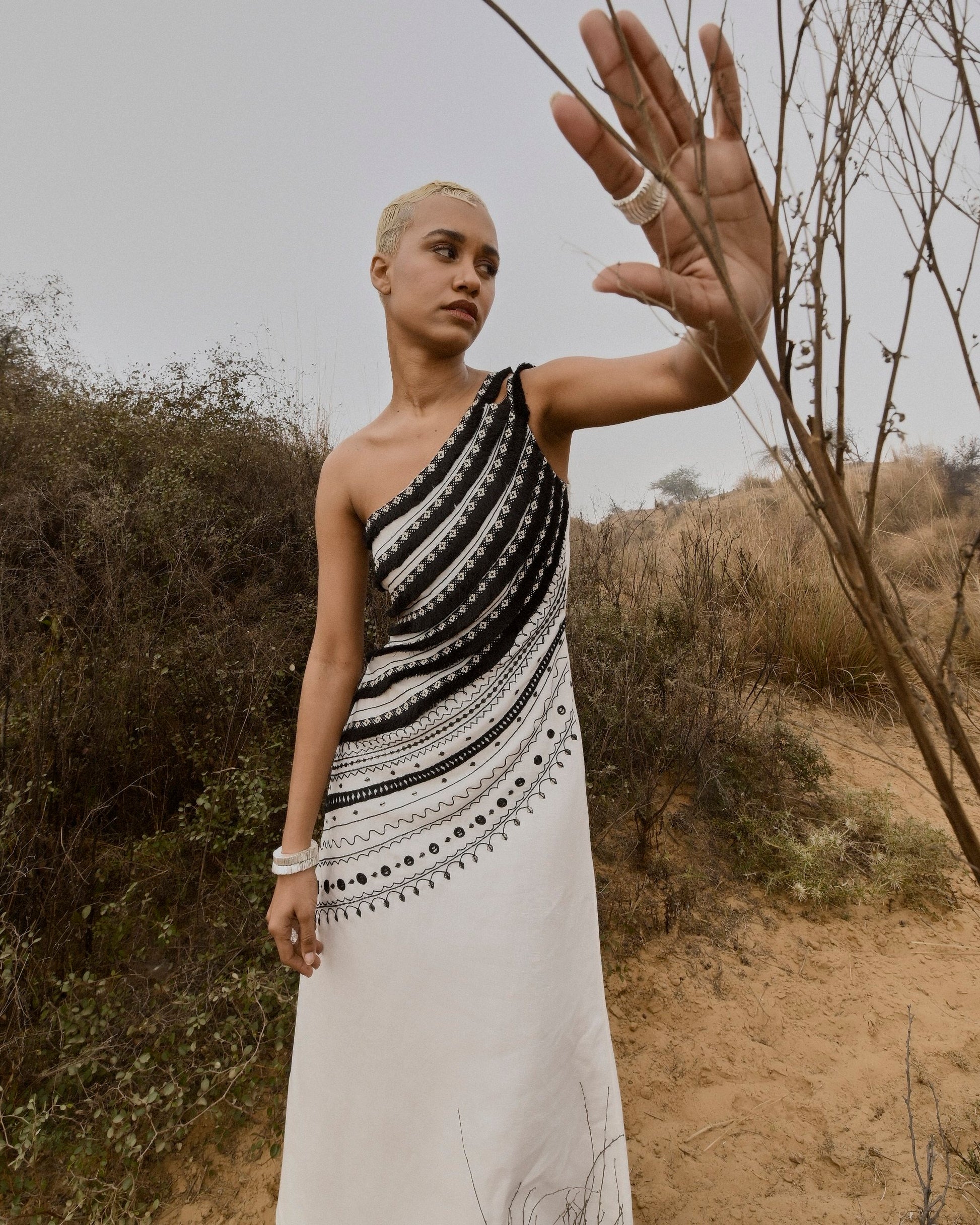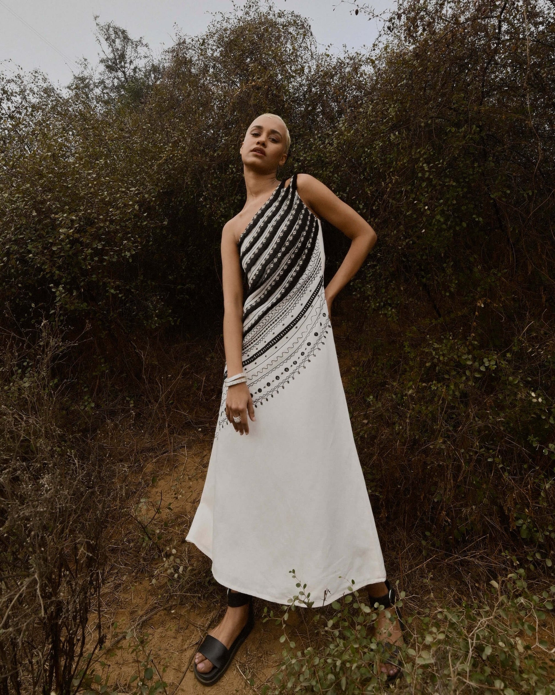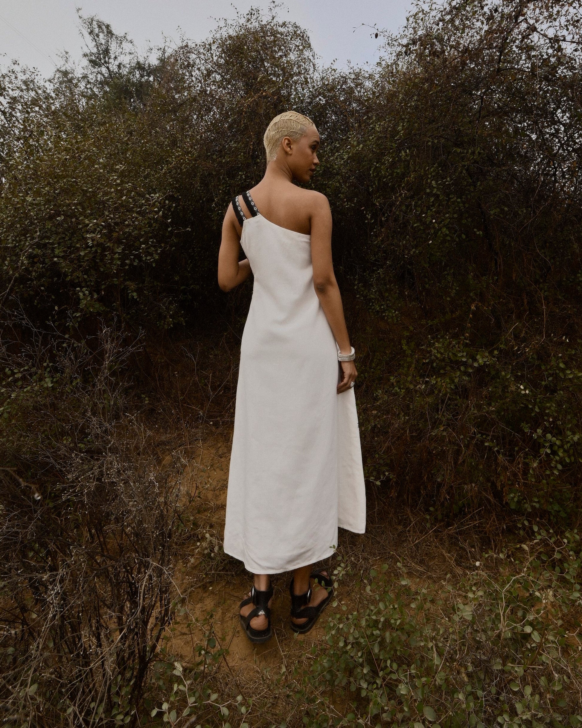 Mirrors, fringe elements and an off-shoulder top are just some of the pretty details of the Ida Dress.Made in pure linen, this is luxe dress that offers immense comfort.