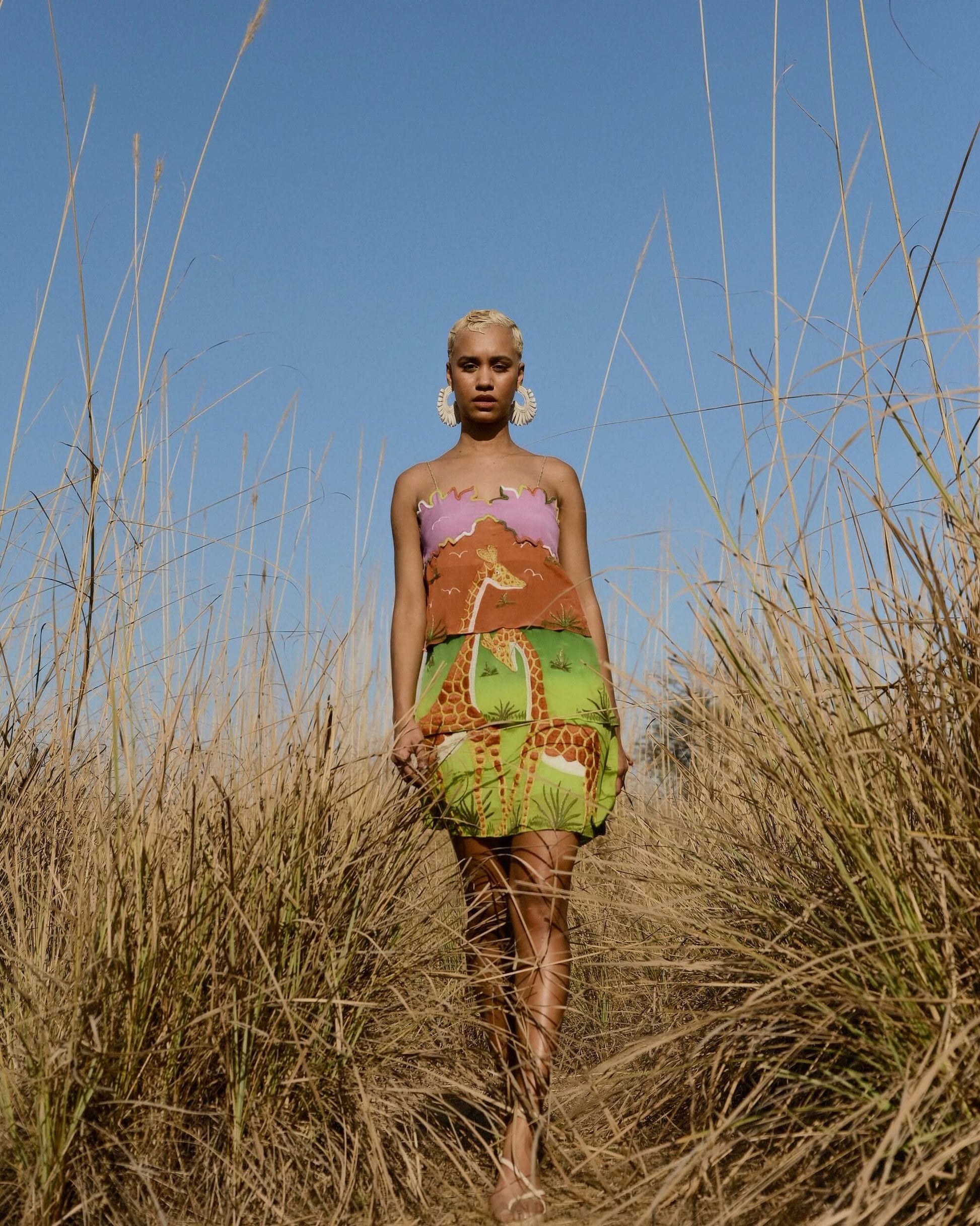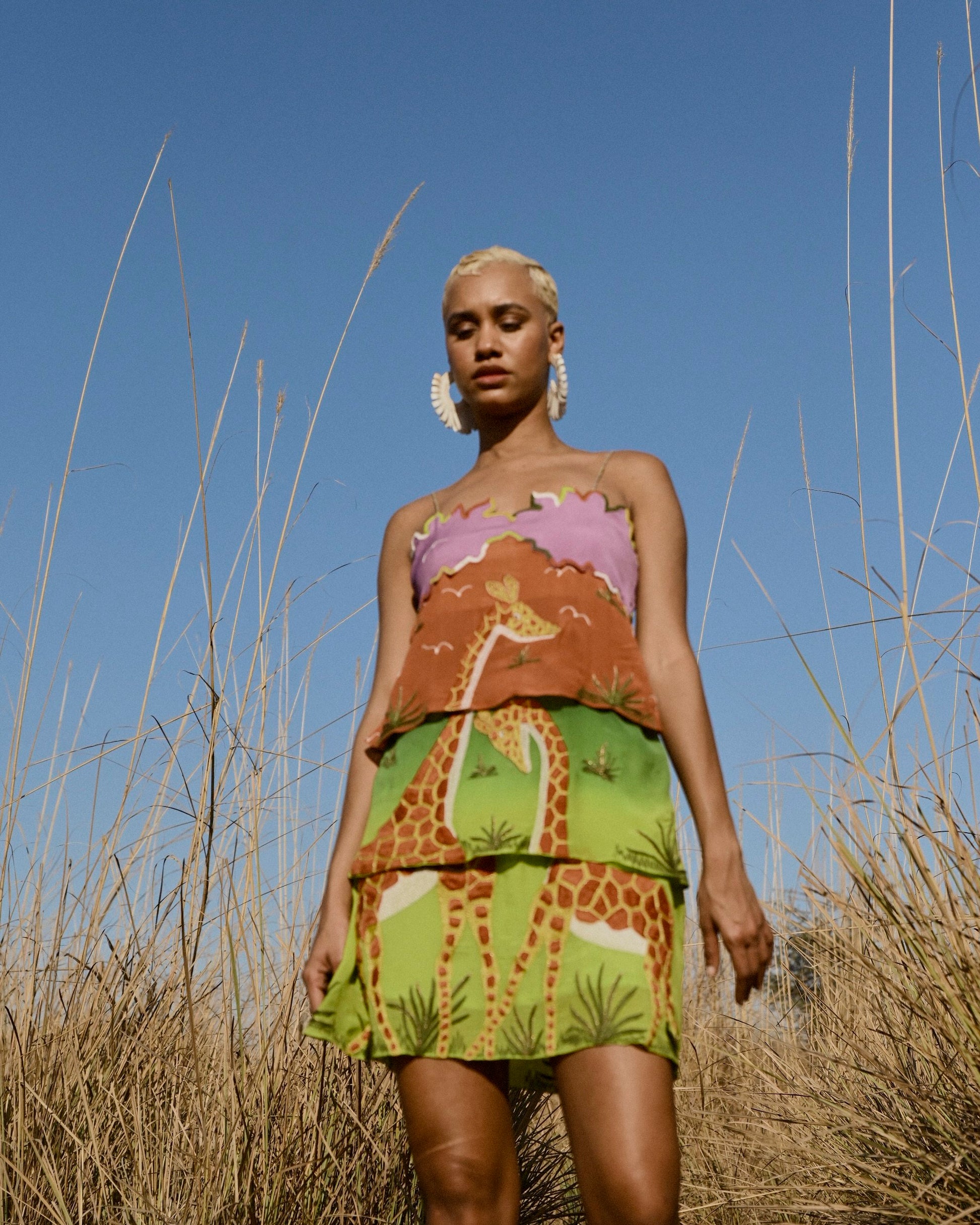 The multi-hued and many layered Jabari Dress is a riot of colours. It's a long canvas, with two giraffes in the African Savannah as its protagonists.Spaghetti straps and a simple silhouette make this ensemble easy to slip on.