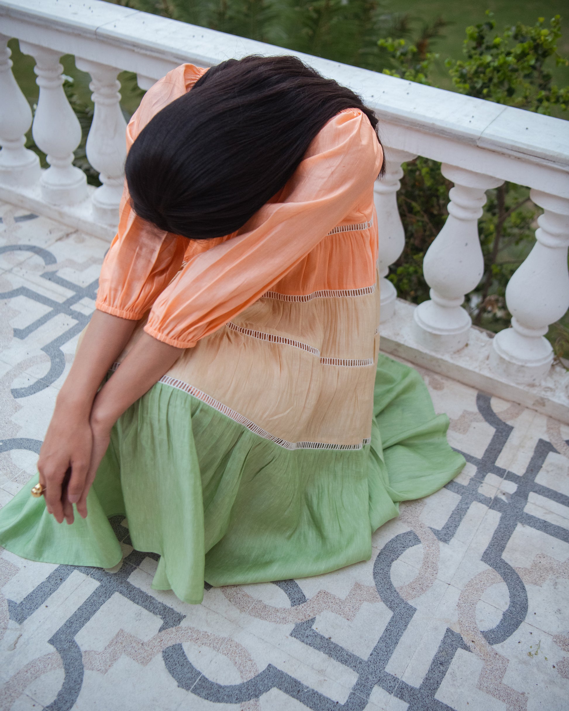 A classic A-line dress in linen silk, Jeune is a luxurious garment. It features three colours - a light orange, a golden beige and a pastel green. Be it for a dinner party at home or a vacation, you can wear this dress on multiple occasions.