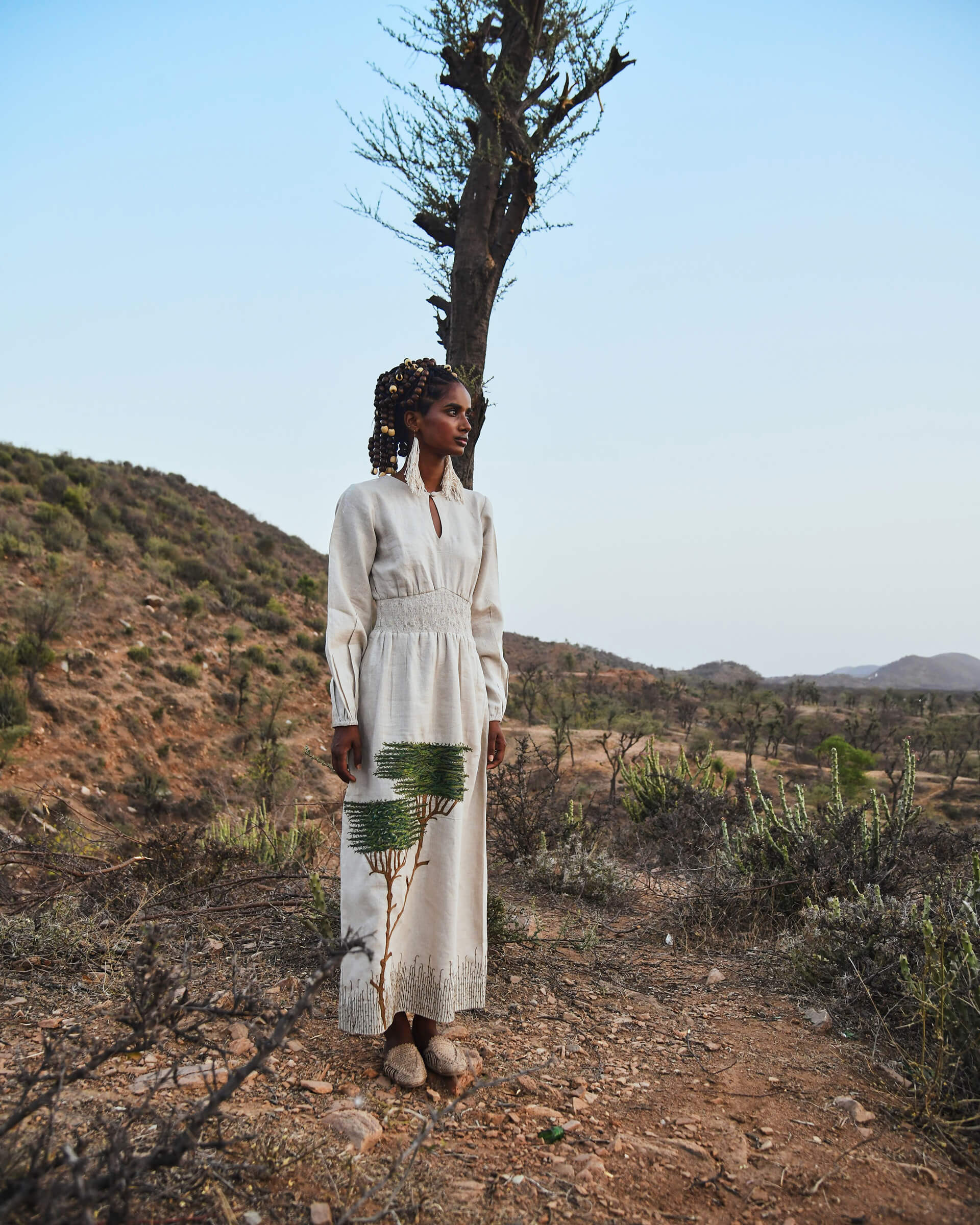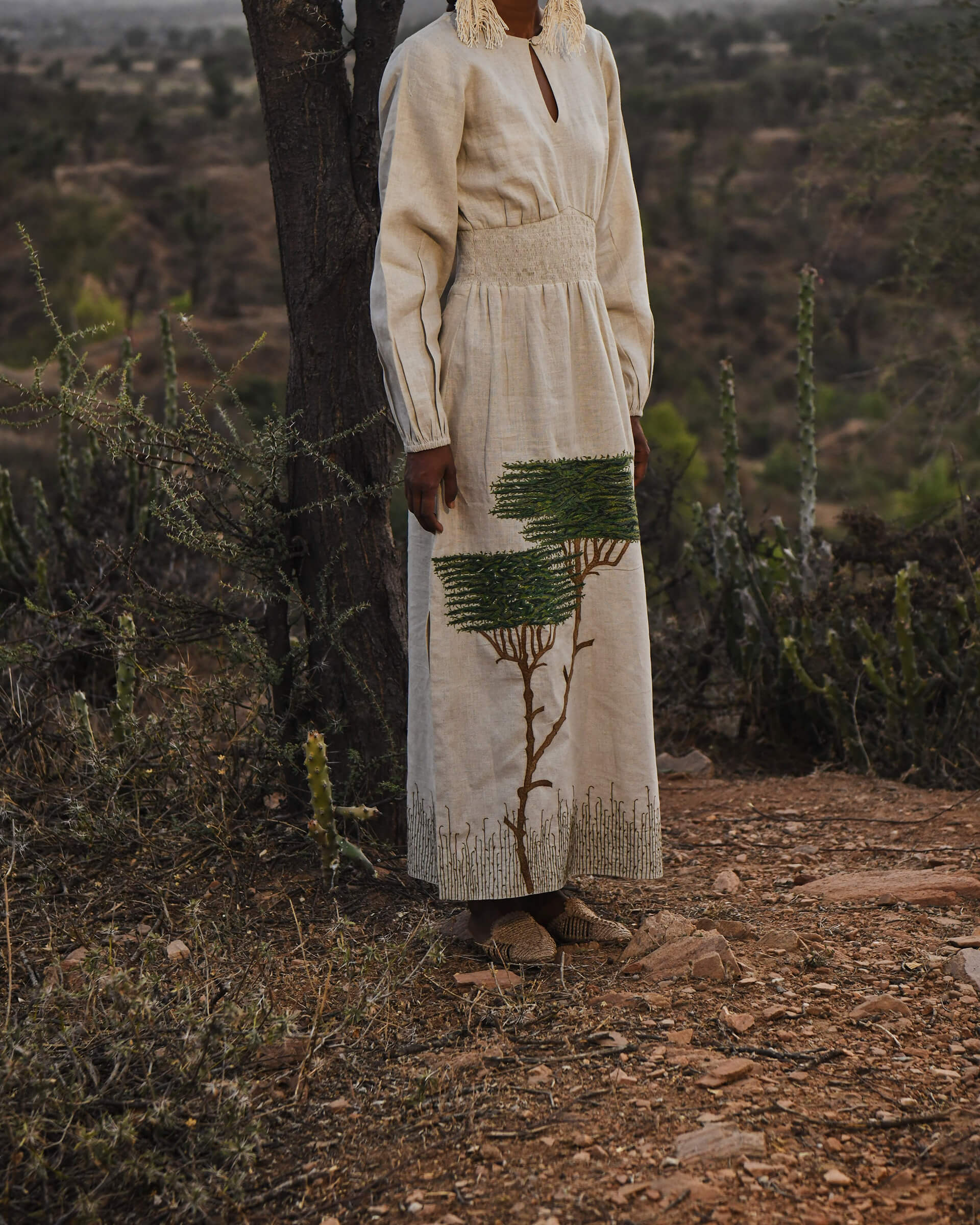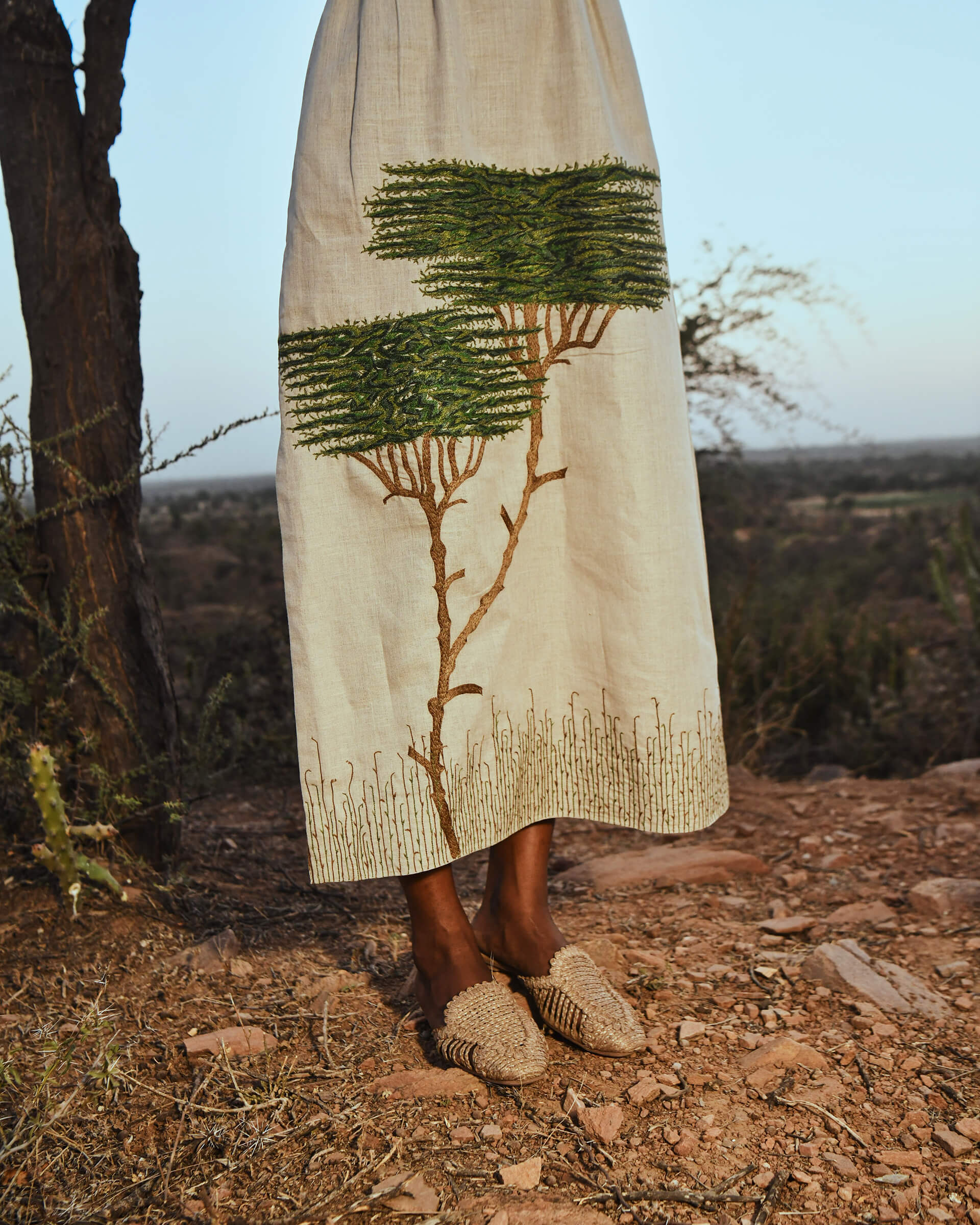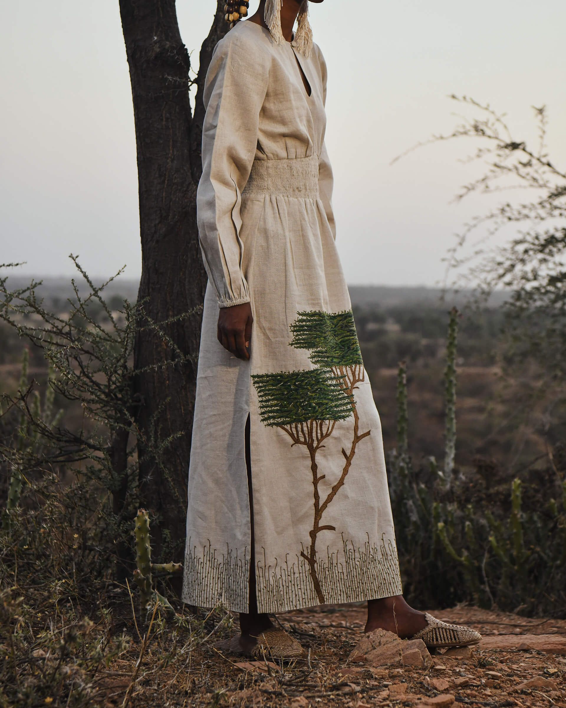 Nothing says 'Welcome to Africa' quite like the flat-topped Acacia Tree. It's the quintessential symbol of the African wild. Our Karibu Dress welcomes you to this beautilful landscape with its very own hand-embroidered acacia trees. Just as the tree always stands out, basking alone in the jungle, so will the wearer in this lovely linen dress.