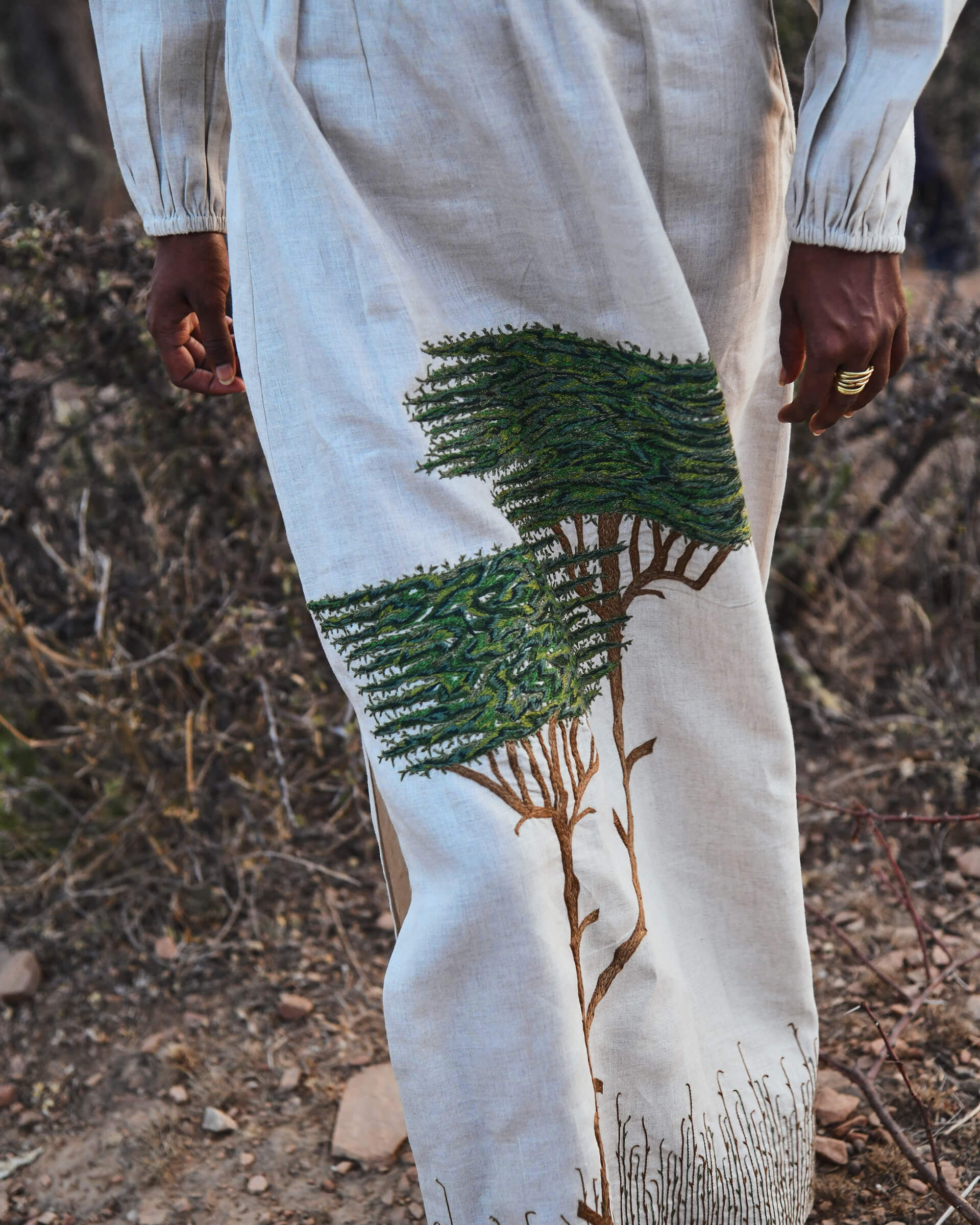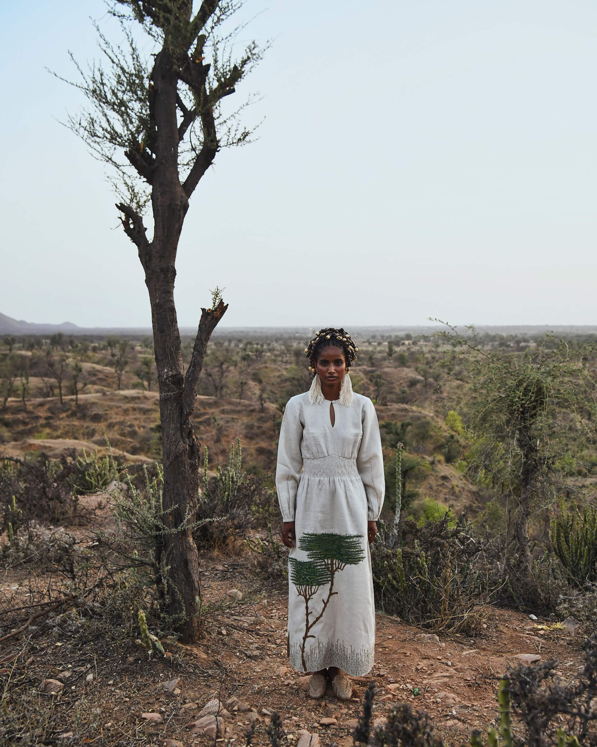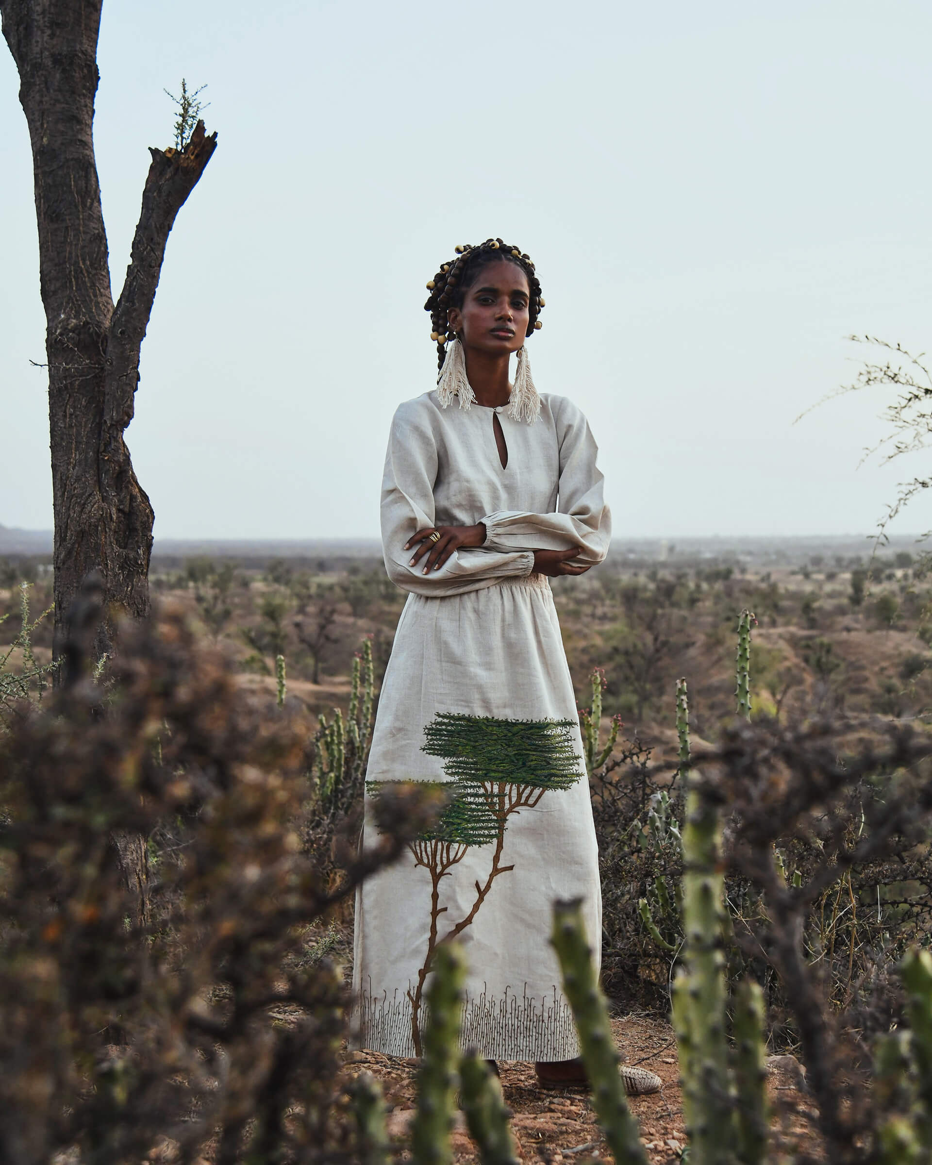 Nothing says 'Welcome to Africa' quite like the flat-topped Acacia Tree. It's the quintessential symbol of the African wild. Our Karibu Dress welcomes you to this beautilful landscape with its very own hand-embroidered acacia trees. Just as the tree always stands out, basking alone in the jungle, so will the wearer in this lovely linen dress.
