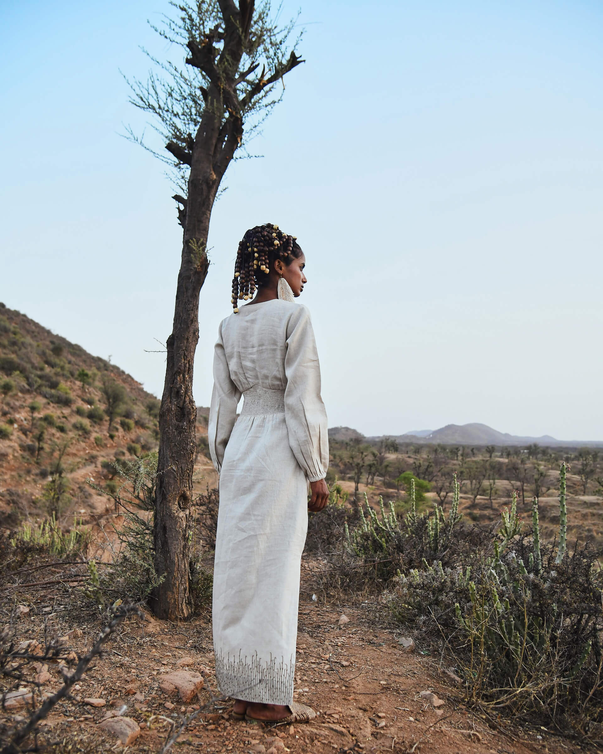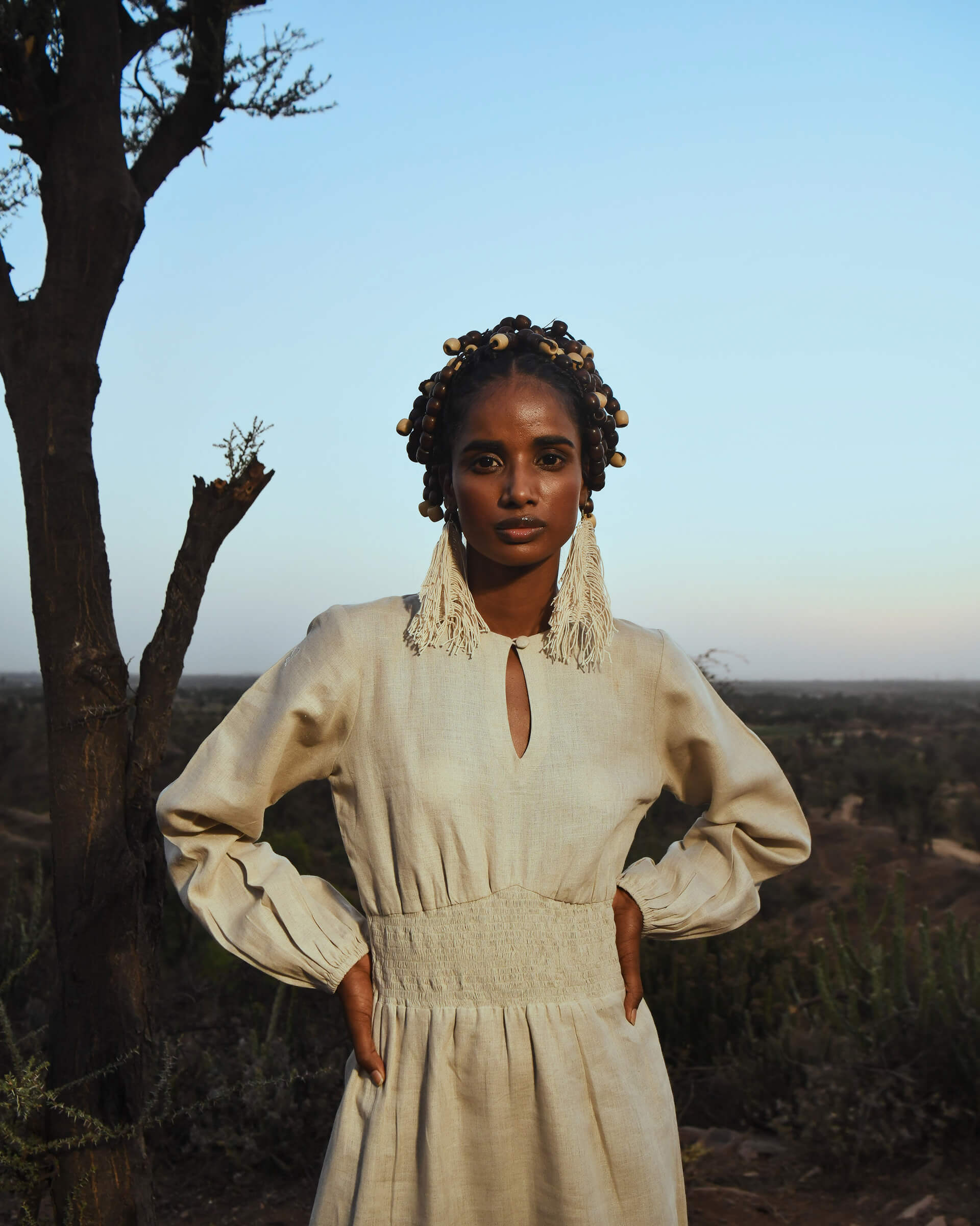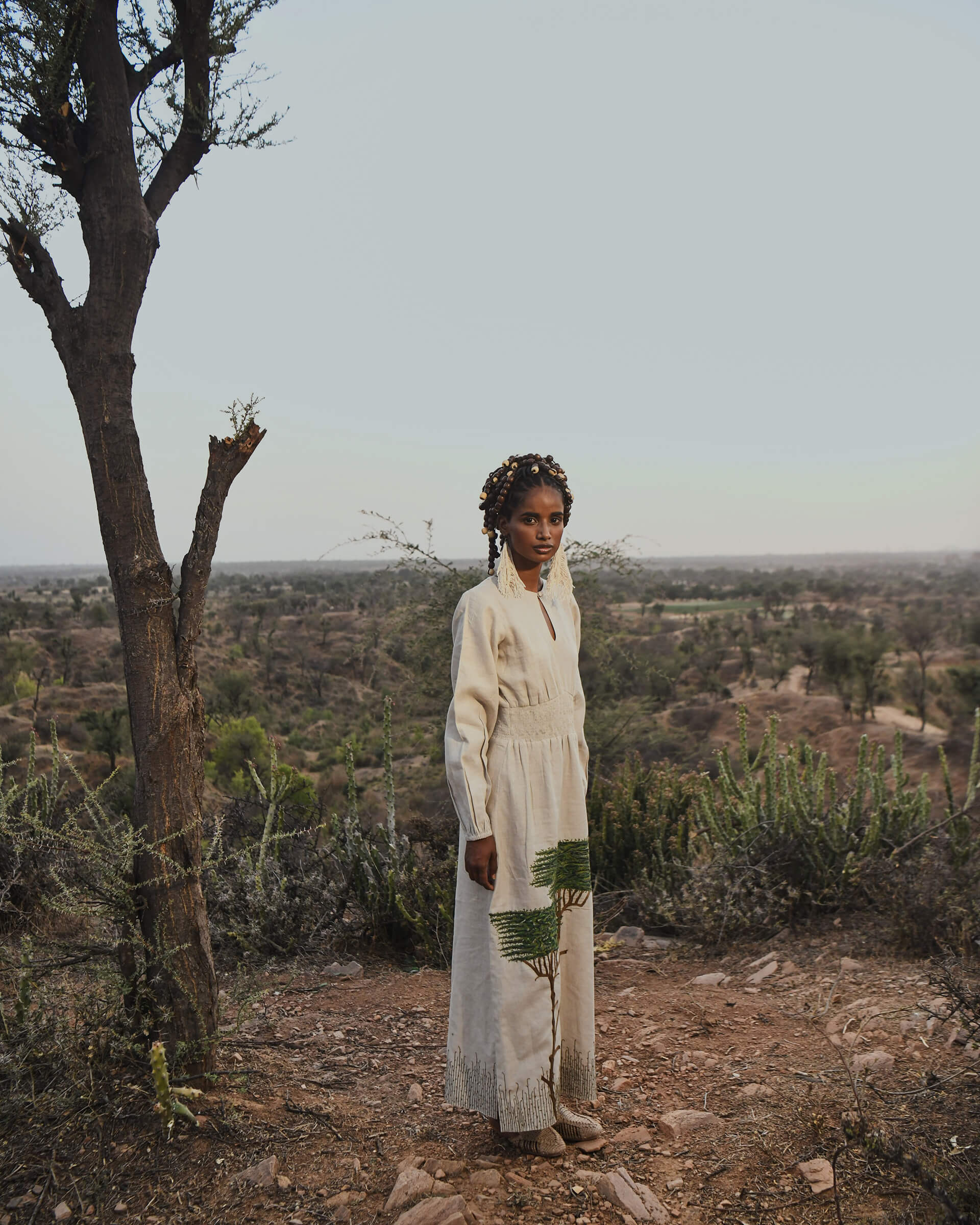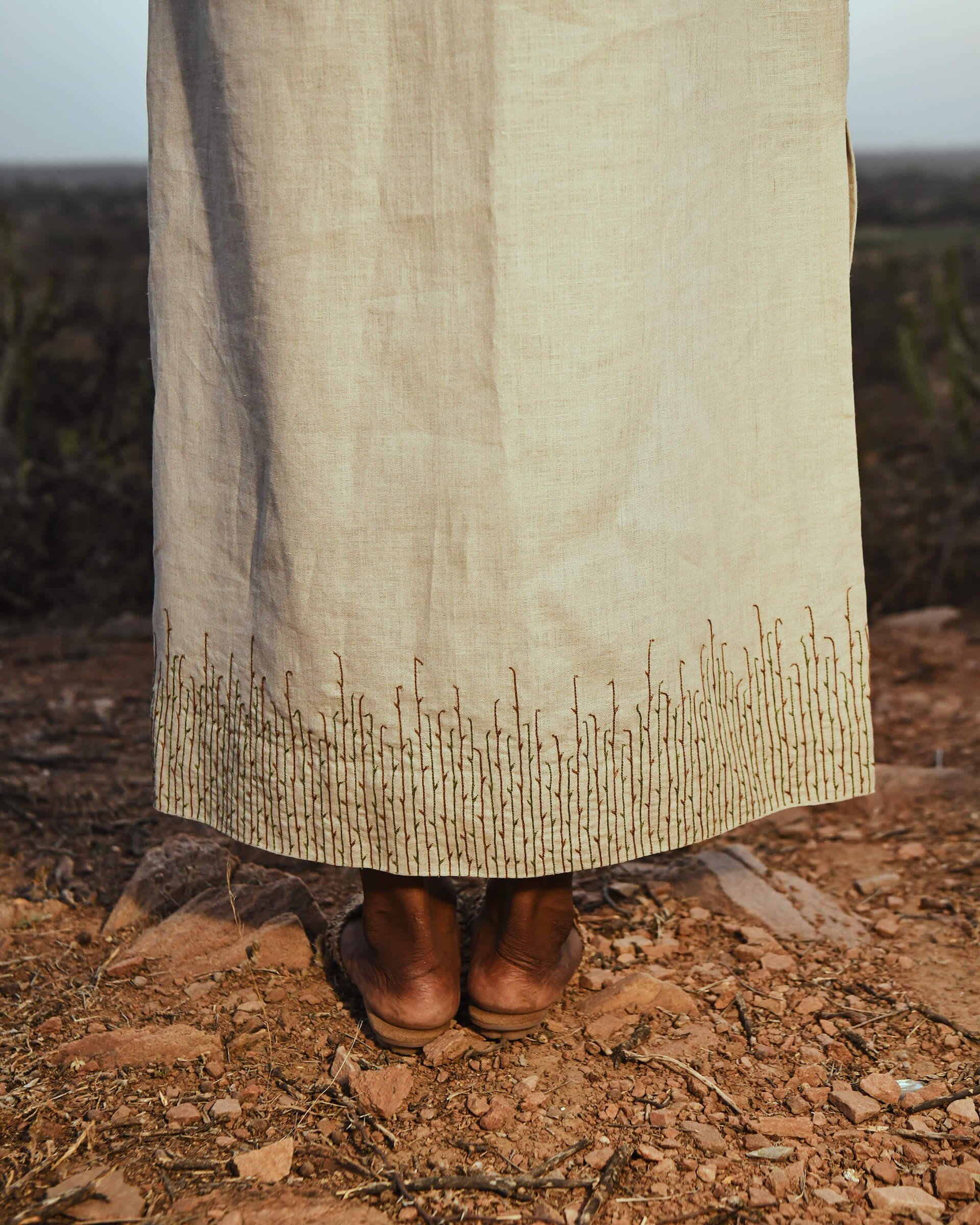 Nothing says 'Welcome to Africa' quite like the flat-topped Acacia Tree. It's the quintessential symbol of the African wild. Our Karibu Dress welcomes you to this beautilful landscape with its very own hand-embroidered acacia trees. Just as the tree always stands out, basking alone in the jungle, so will the wearer in this lovely linen dress.
