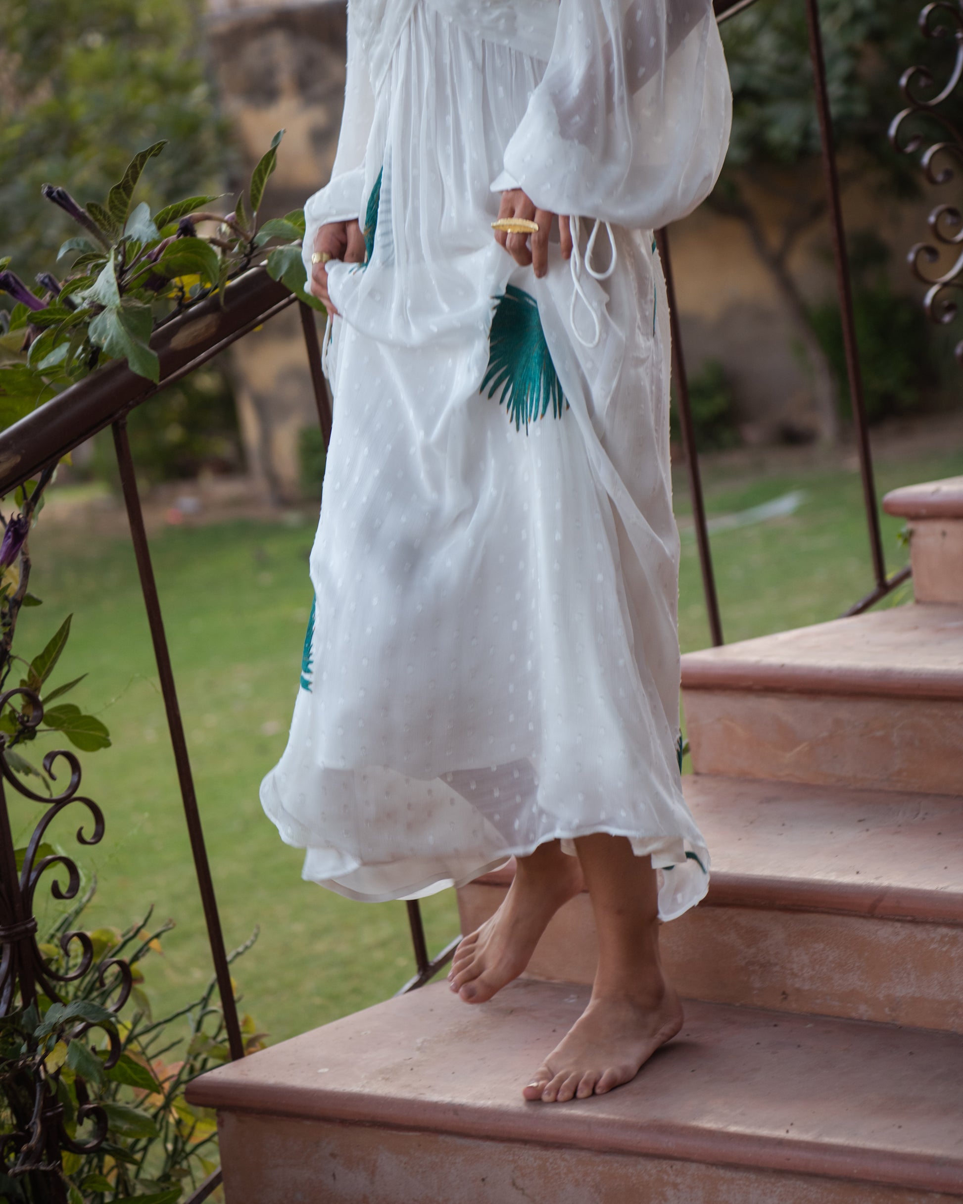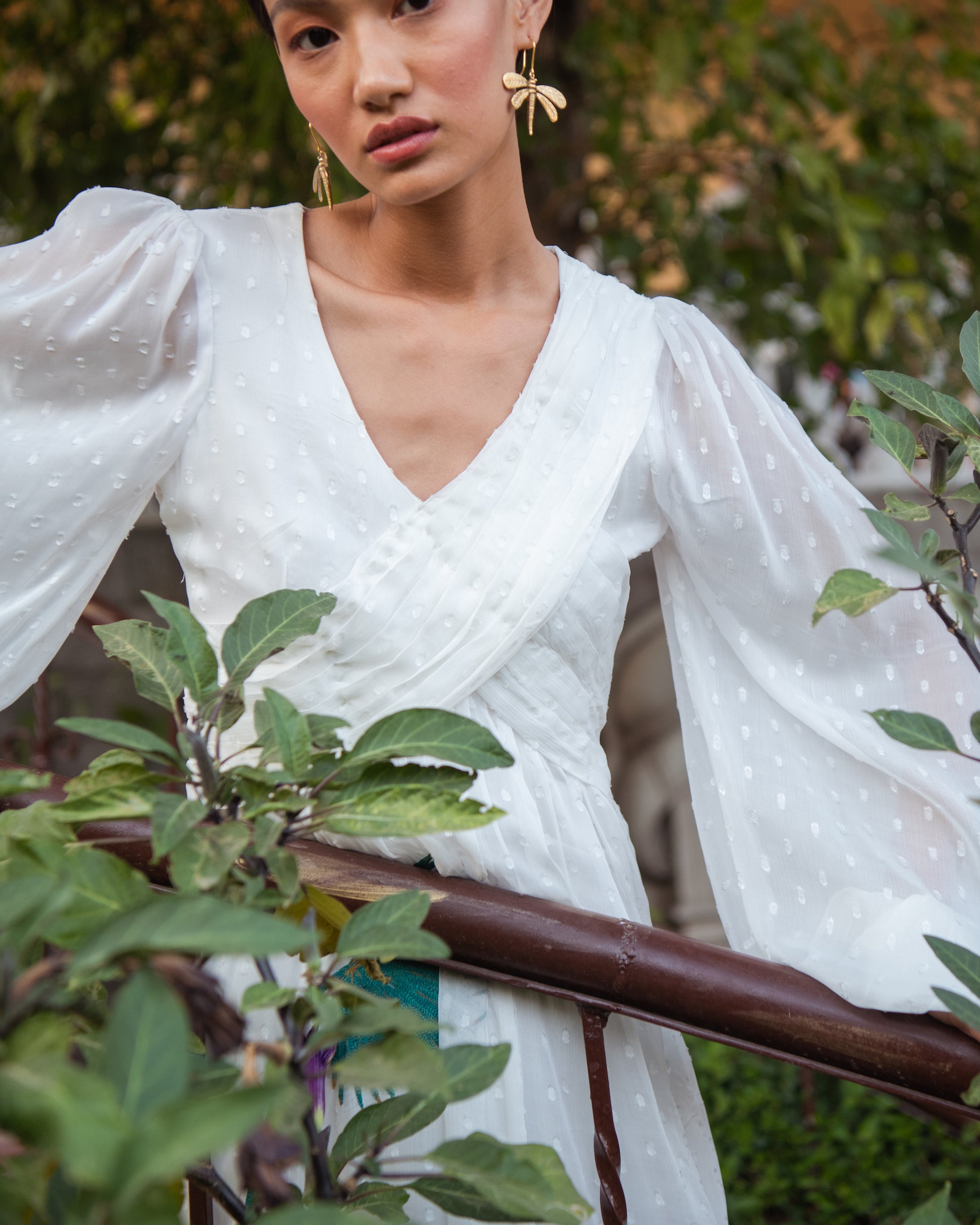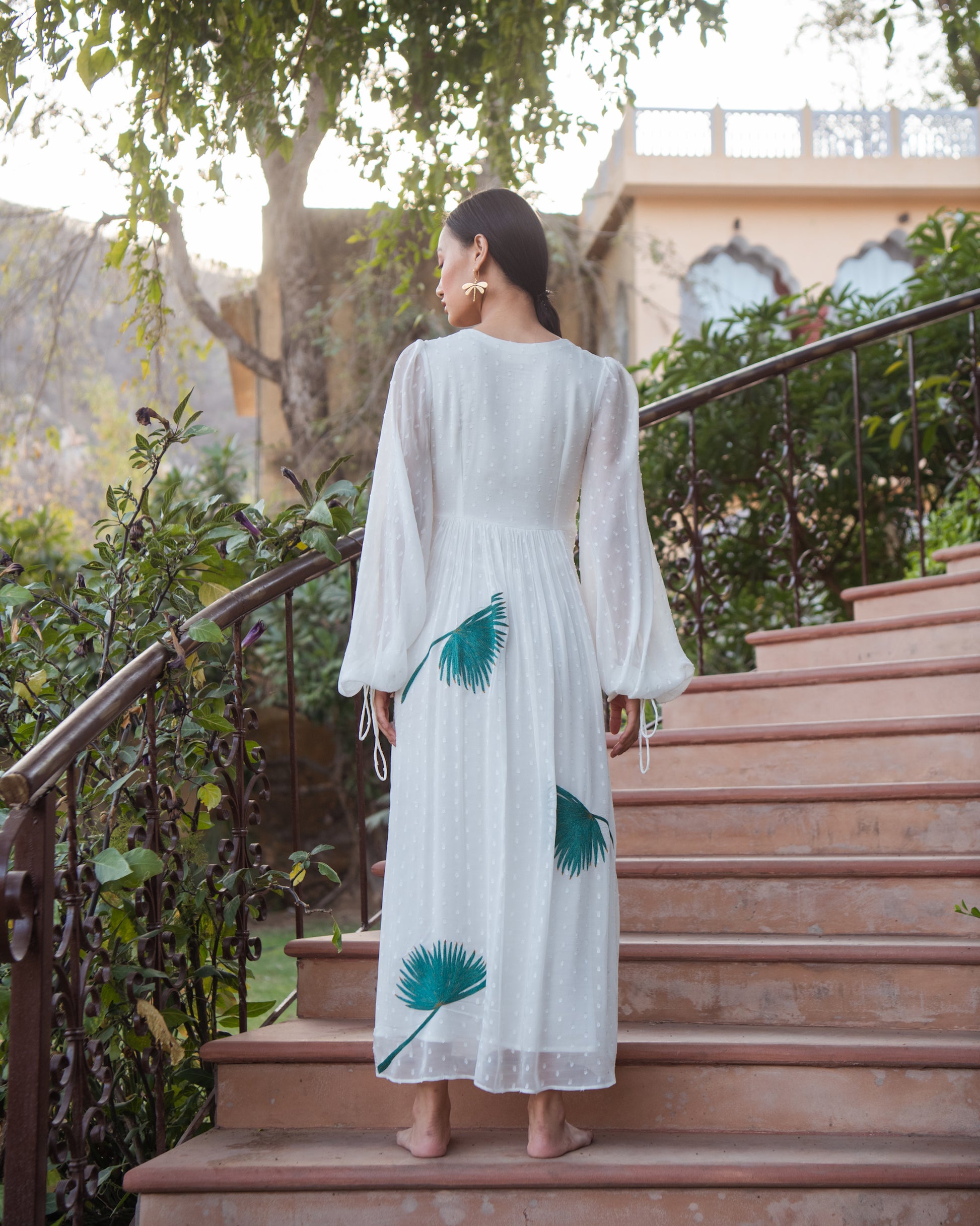 A pleated V-shaped neckline, large embroidered palm leaves and billowing chiffon sleeves define the easybreezy Karlie Dress. Hop, skip and jump in this serene outfit that always makes you feel like you're on vacation.