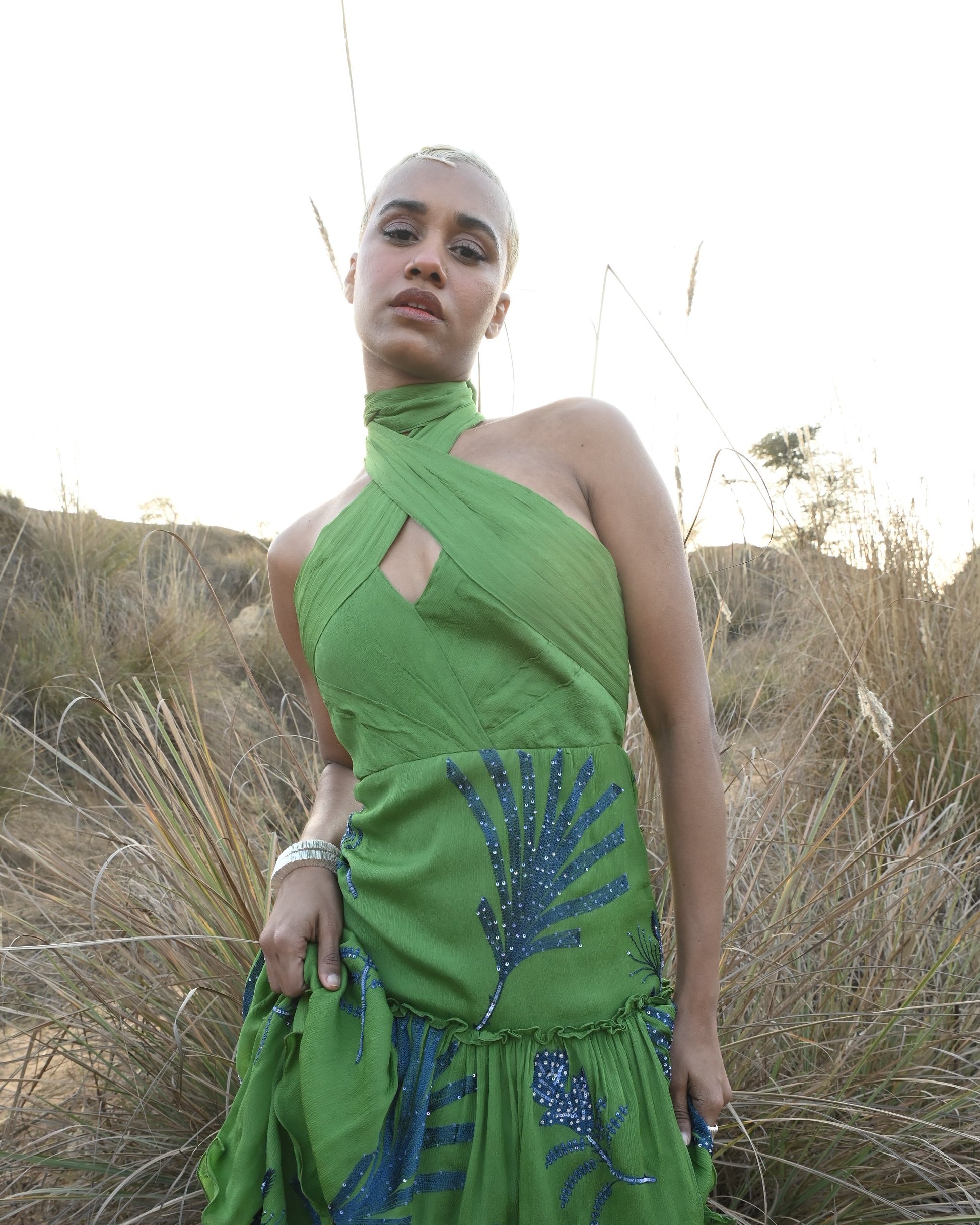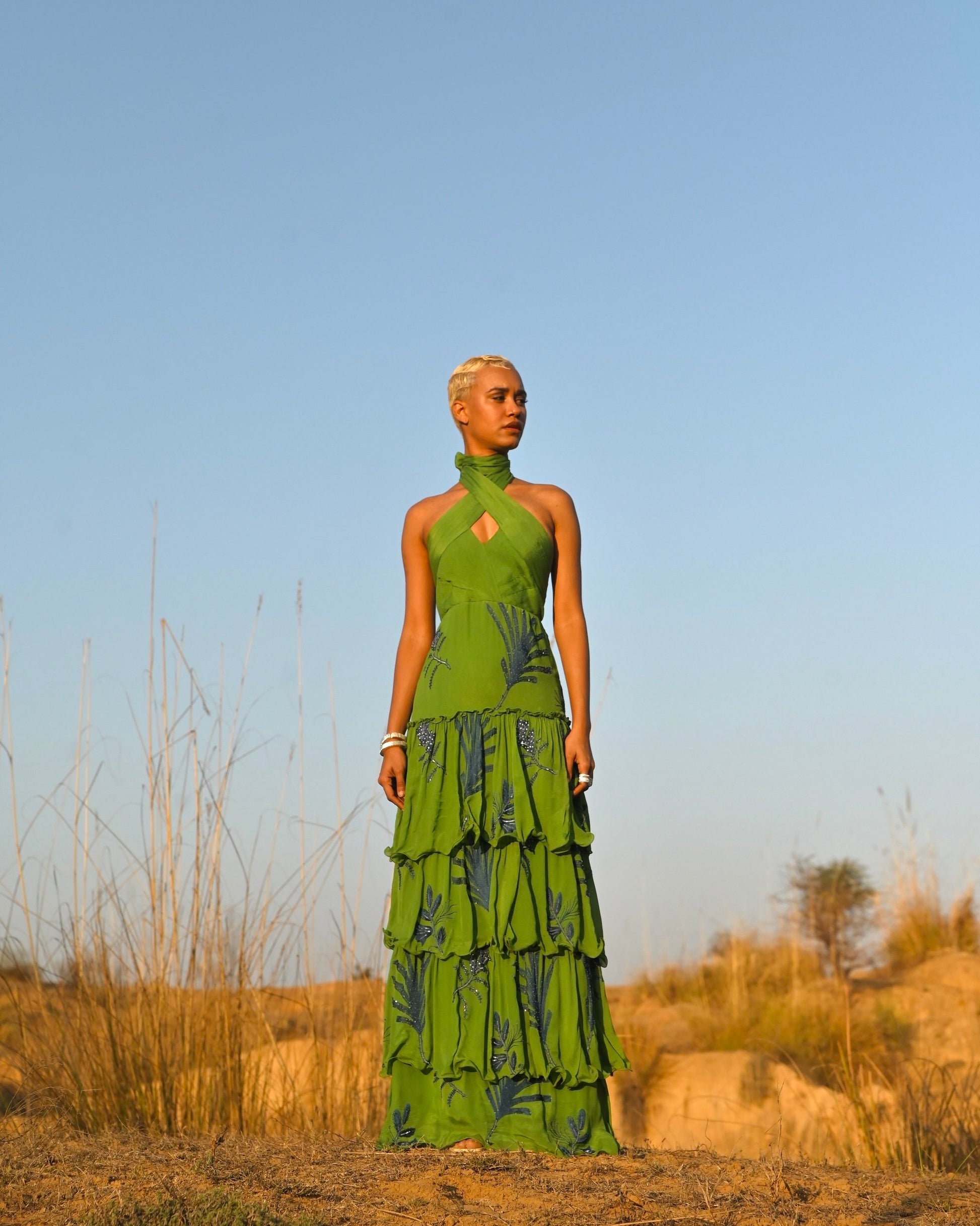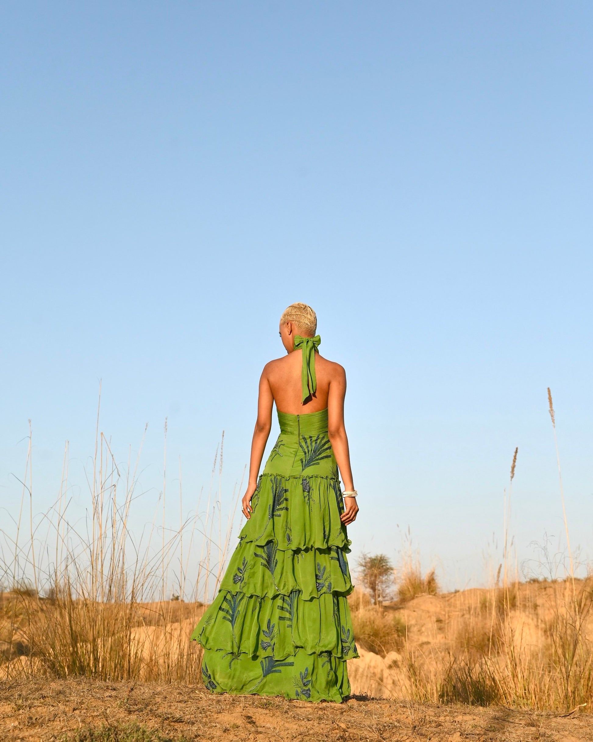 Grand and green, the Makeba Dress is unique and unforgettable. It features extensive hand-embroidery, and its halter top adds a beautiful element to the garments flattering silhouette.