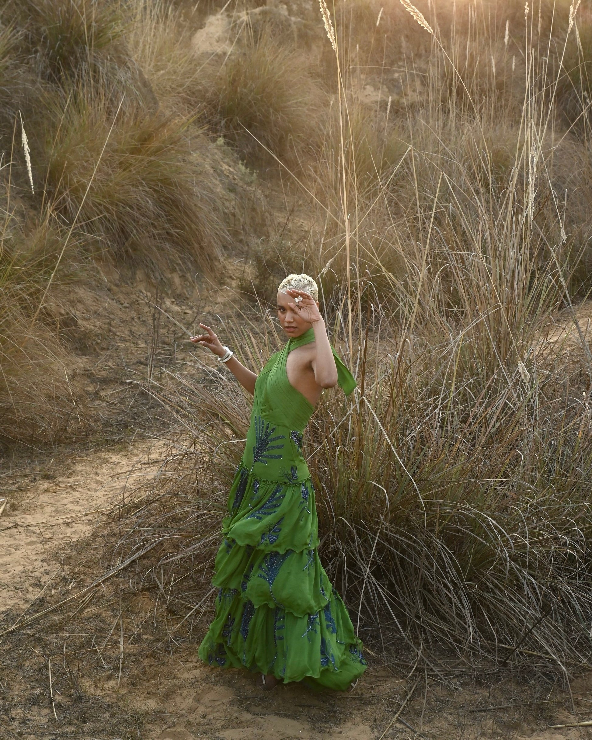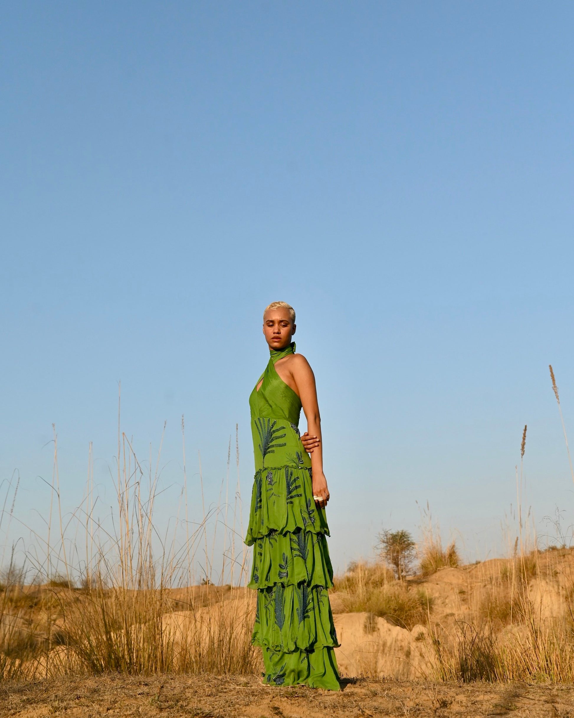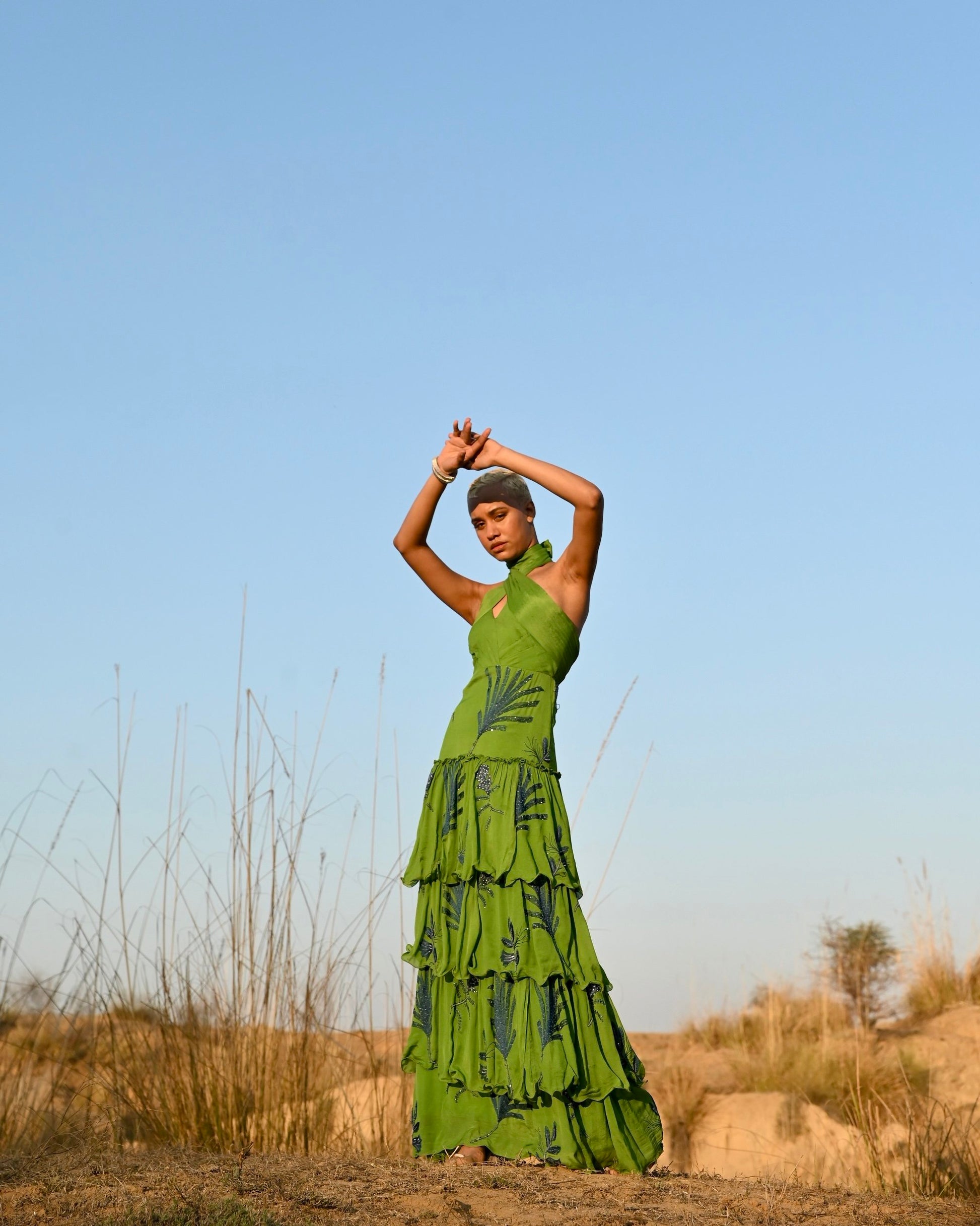 Grand and green, the Makeba Dress is unique and unforgettable. It features extensive hand-embroidery, and its halter top adds a beautiful element to the garments flattering silhouette.