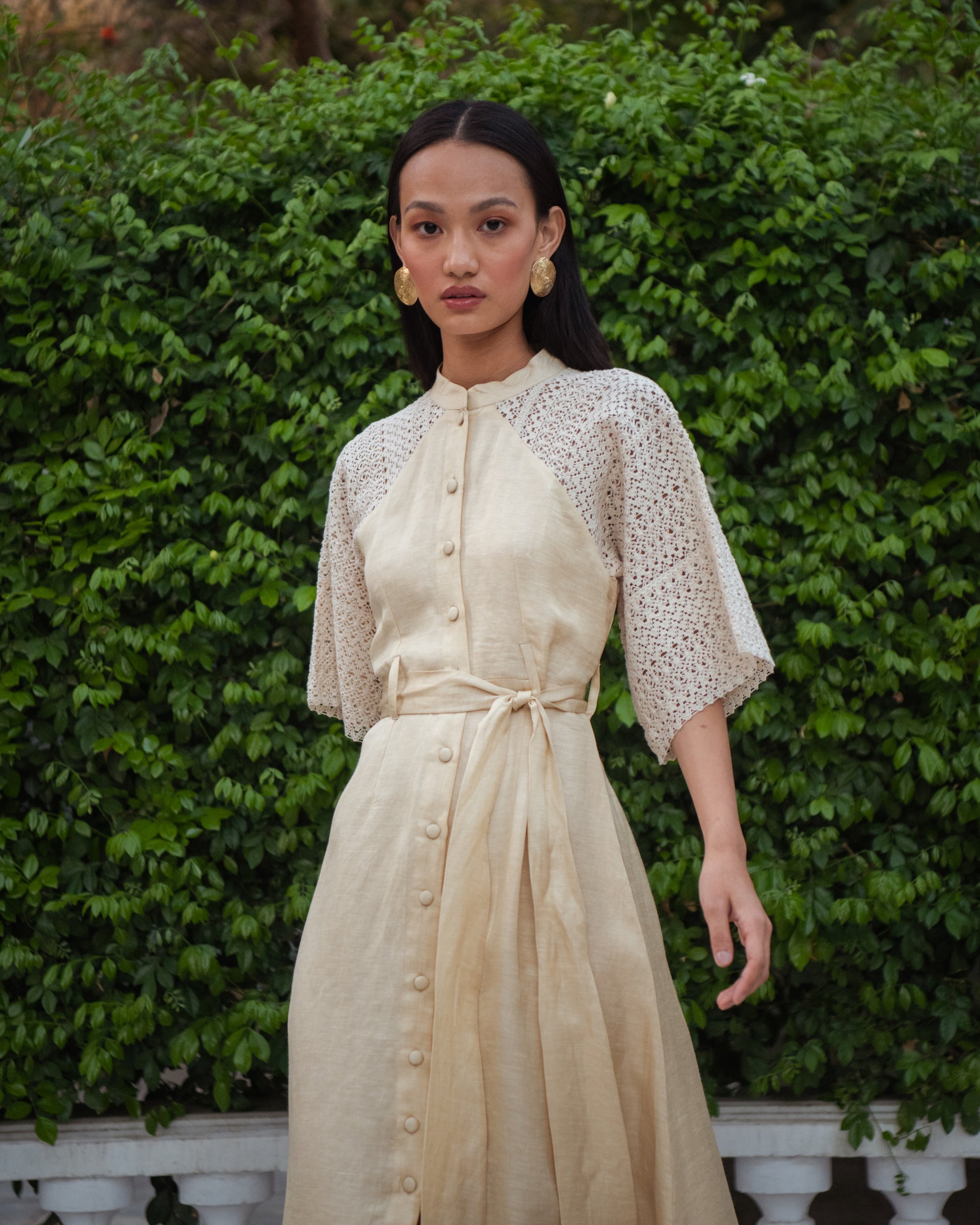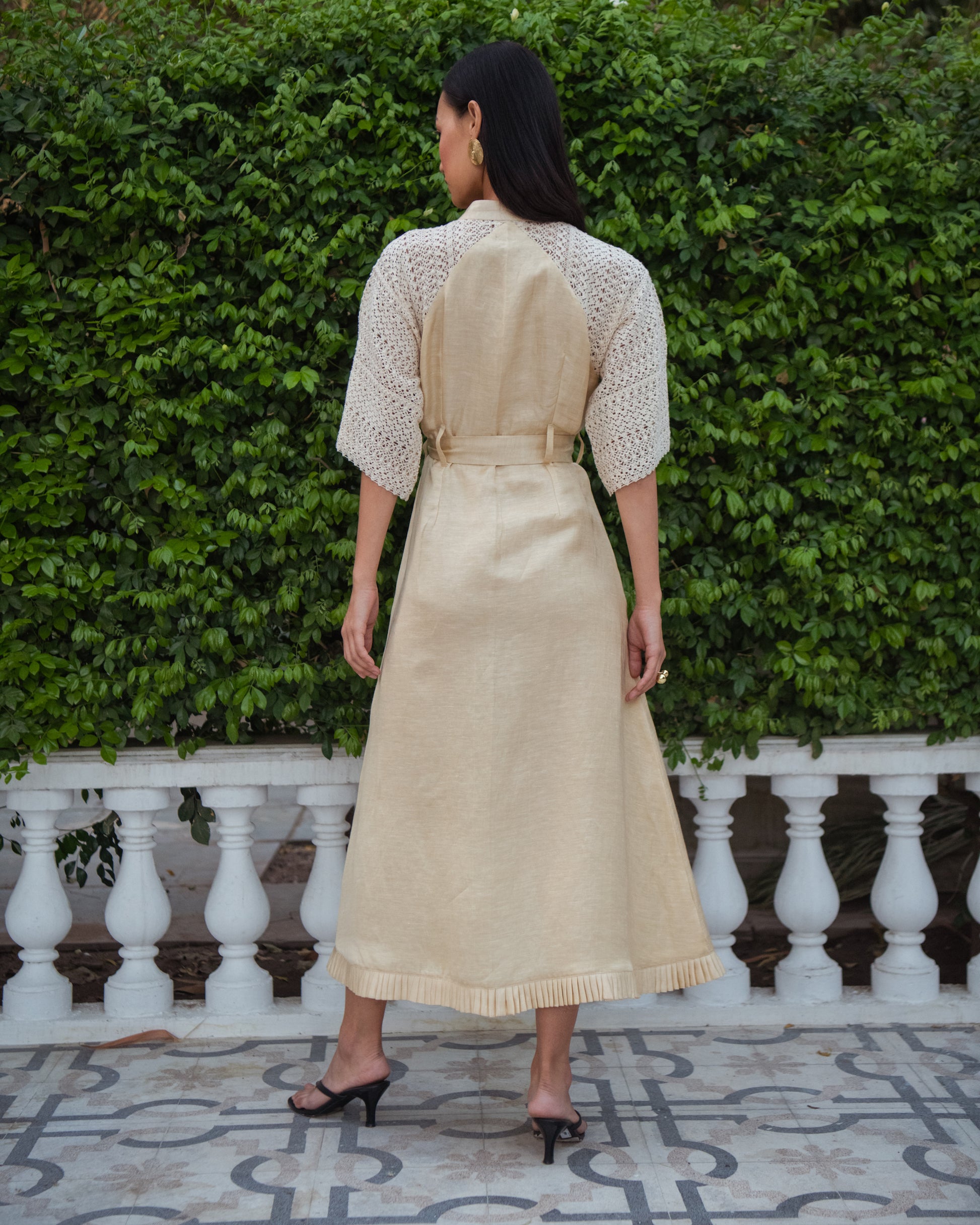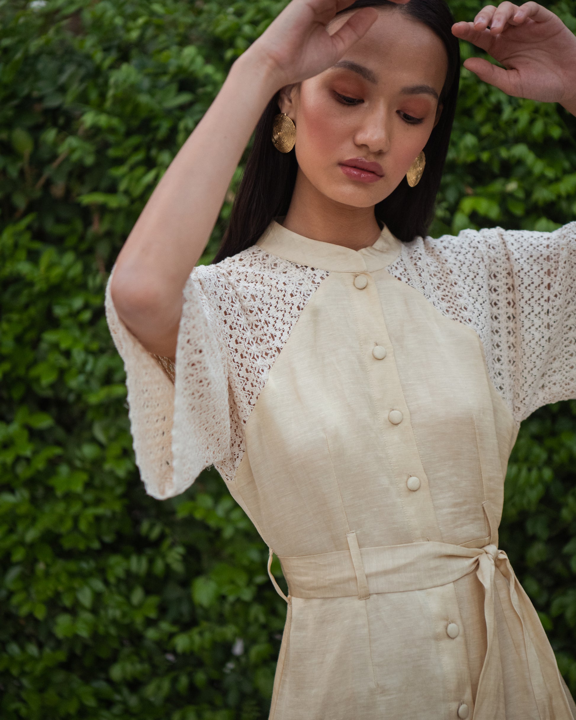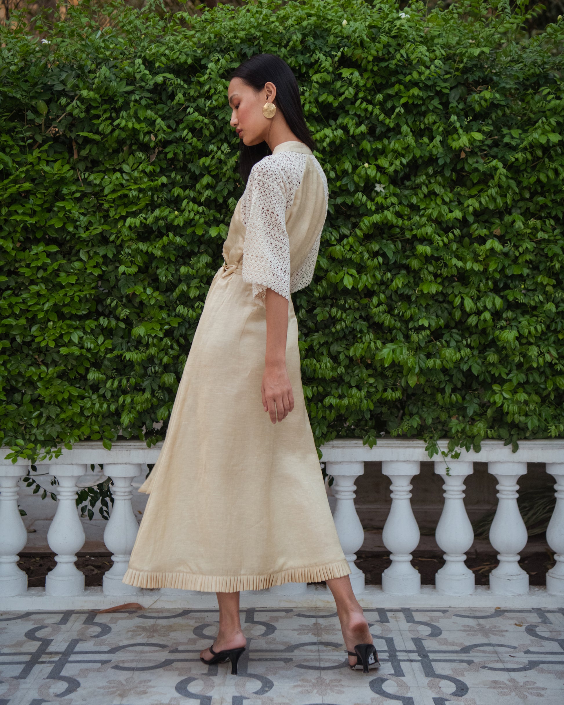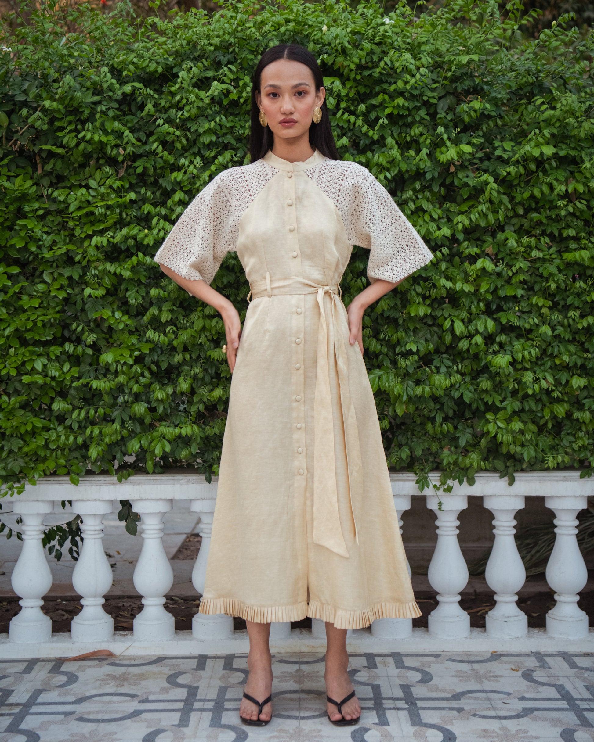 Millie is an every-occasion garment. You will repeat this outfit because it is the quintessential 'most wearable' dress. It features a linen-silk tie-up belt that cinches the waist, a pleated hemline and airy lace sleeves. This dress is the definition of comfort.