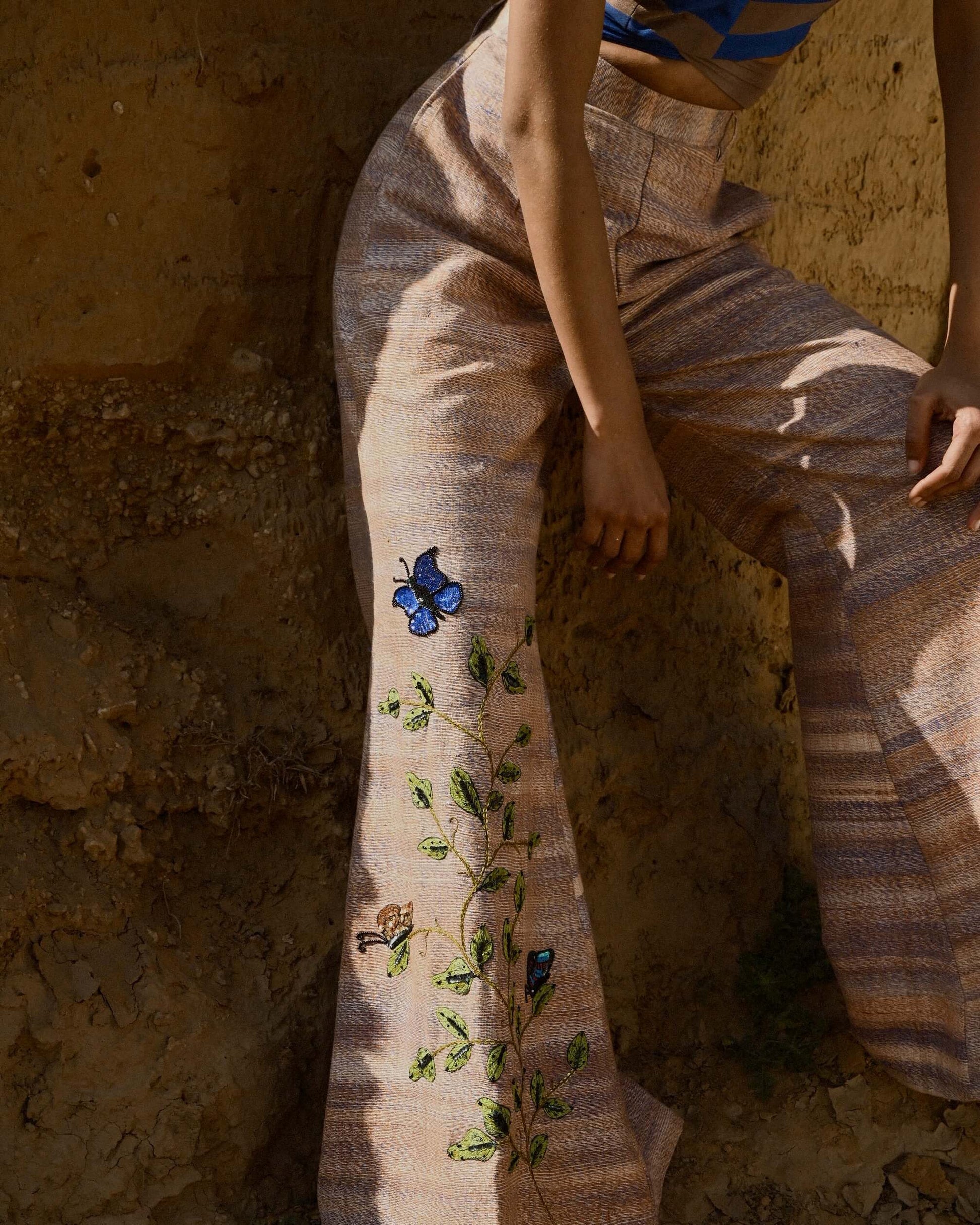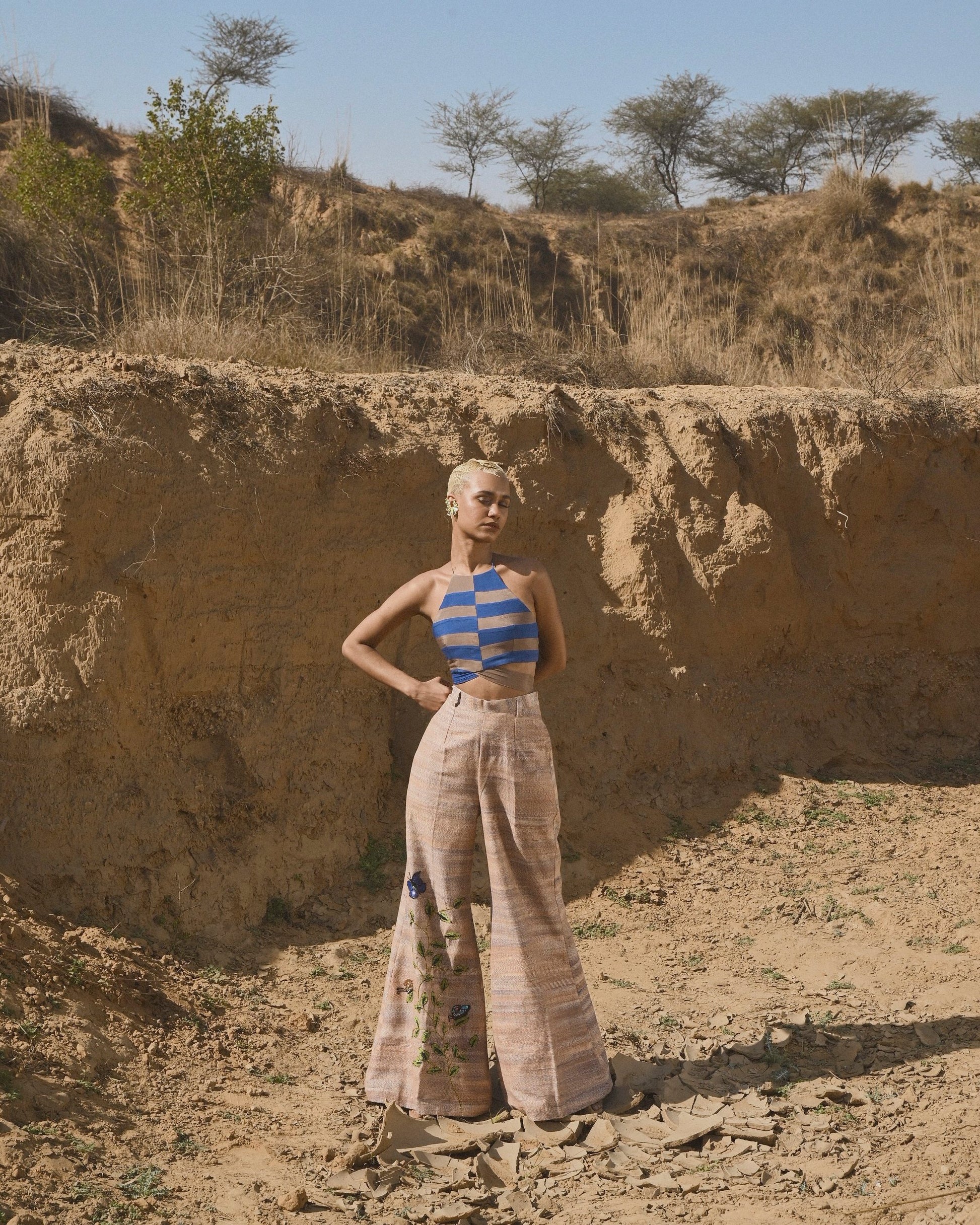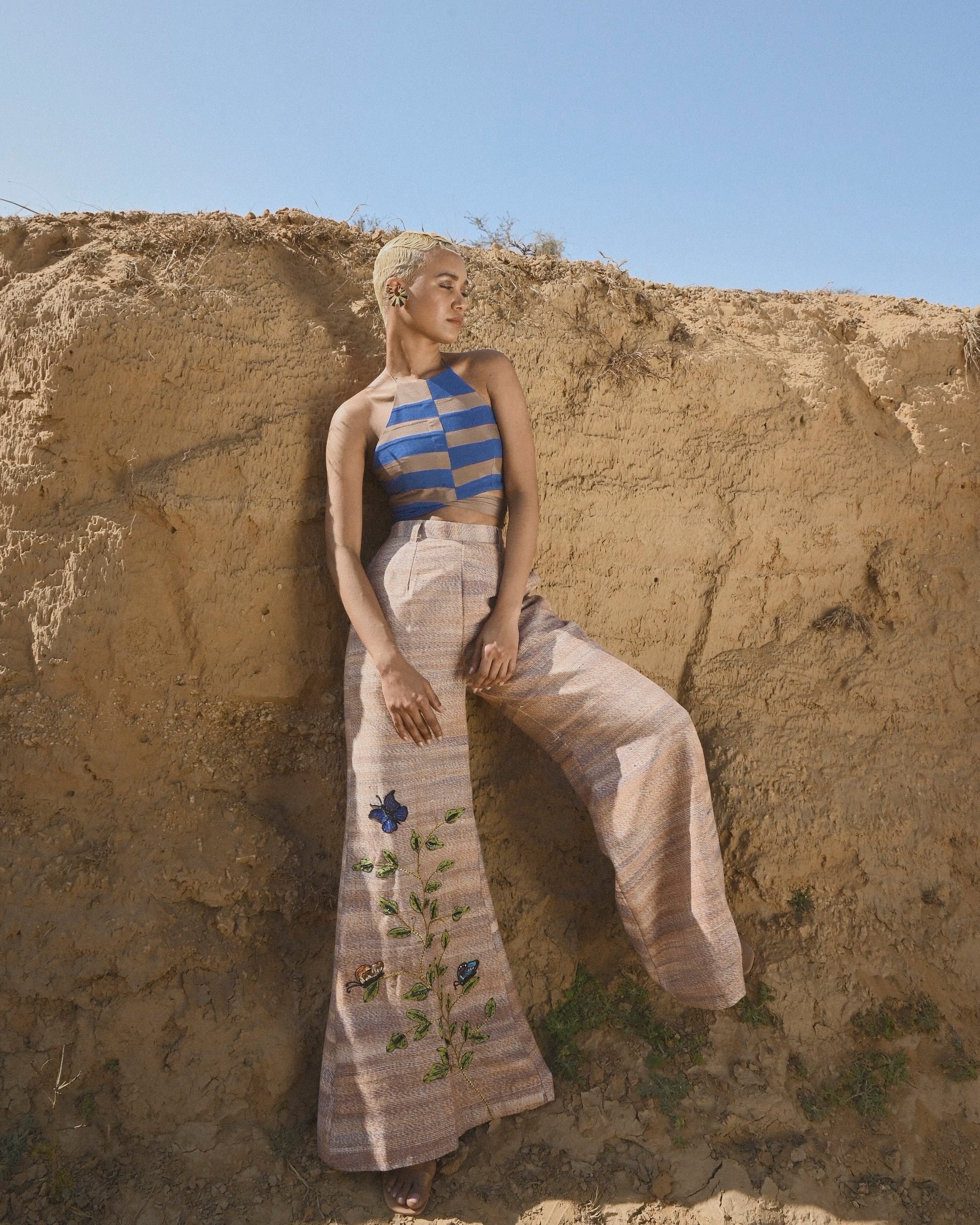 Flared pants never go out of style. With its textured khadi fabric and colourful embroidered motifs, the Nadia Pant is ultra wearable and .Pair this multi-hued trouser with the Nadia halter top to complete the ensemble.