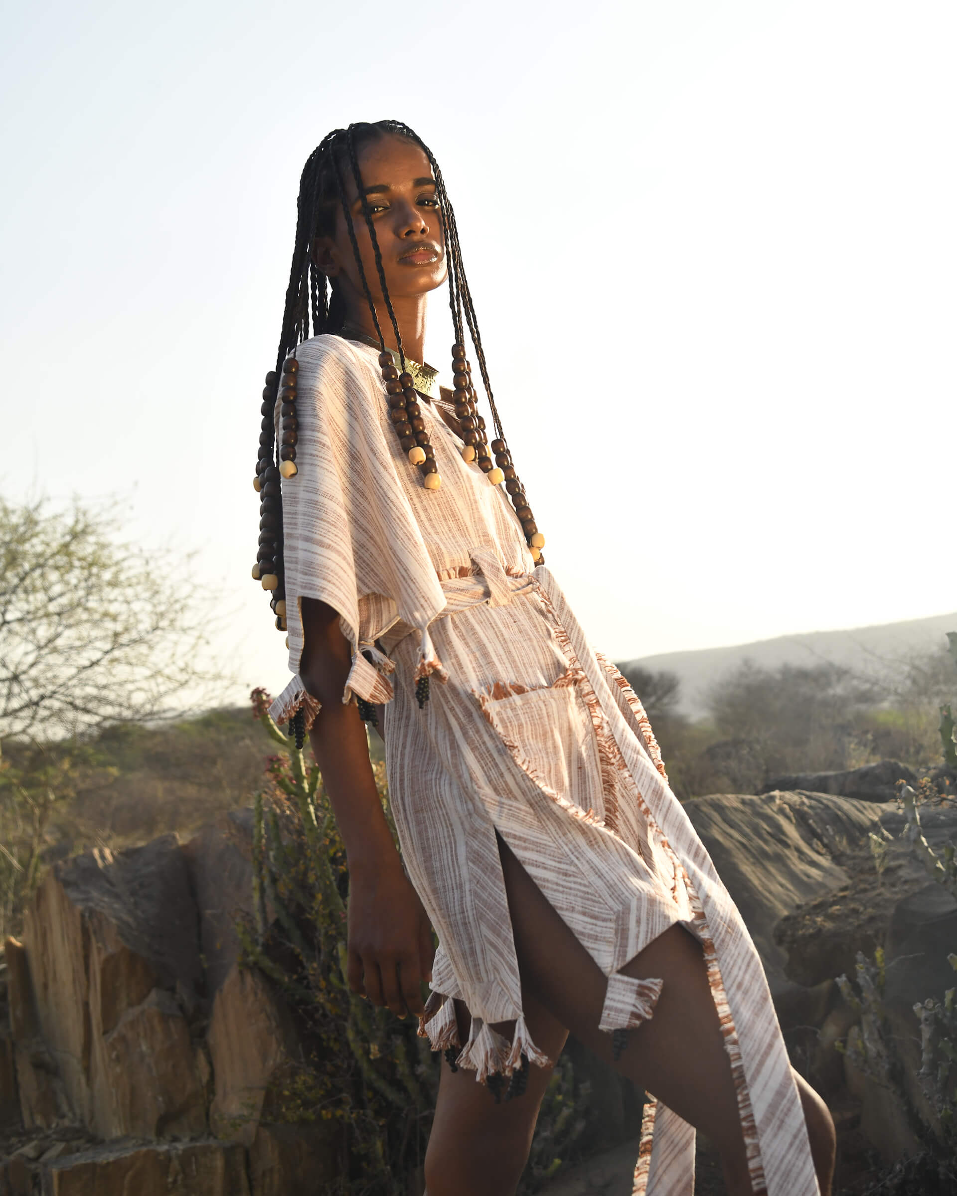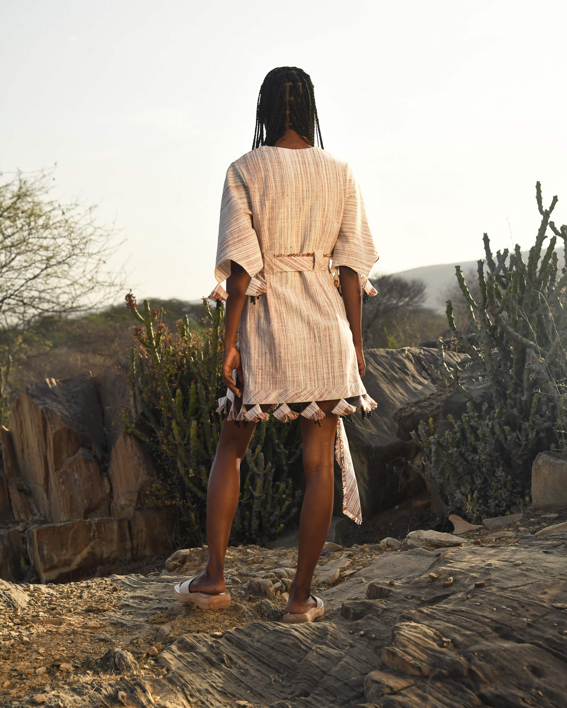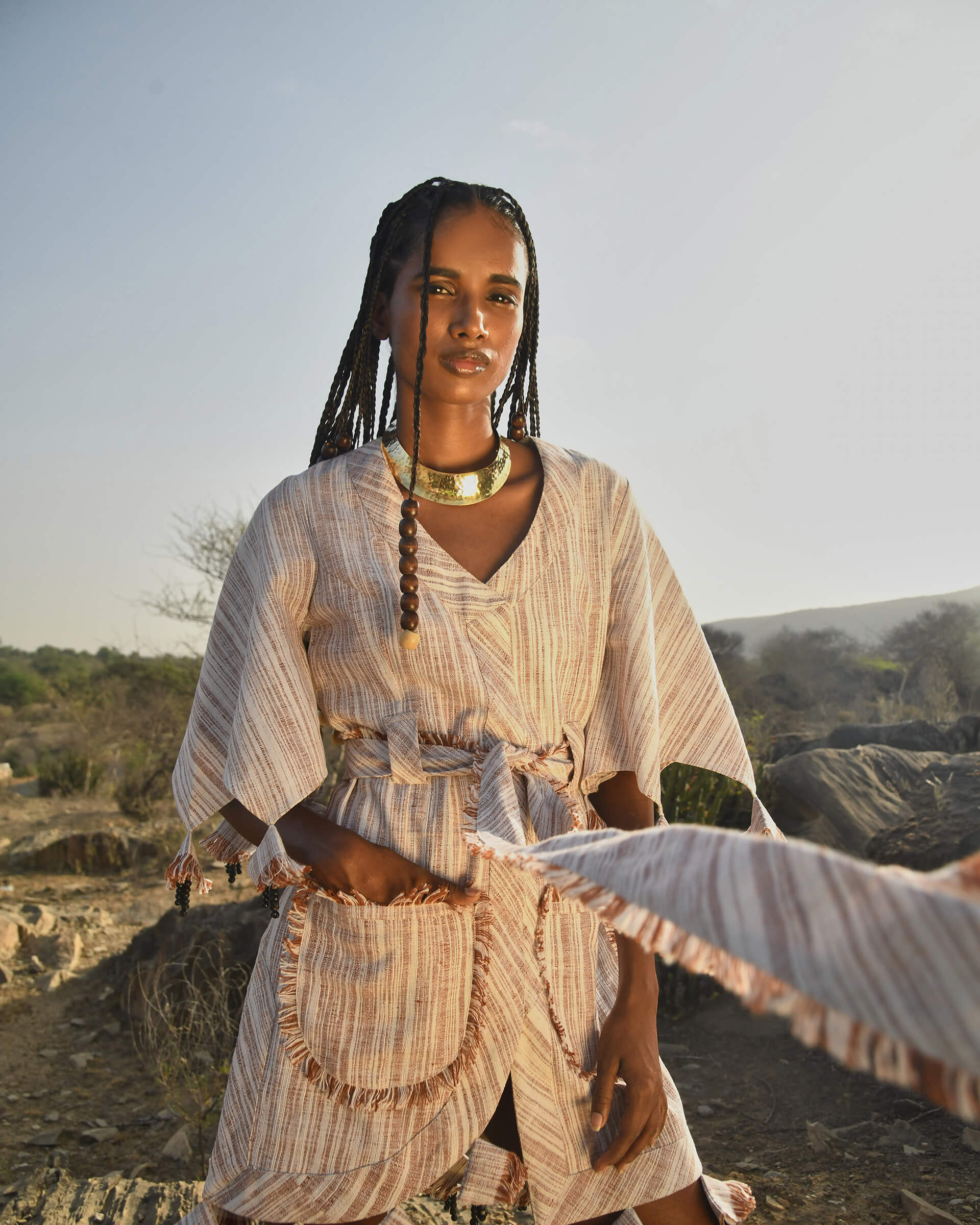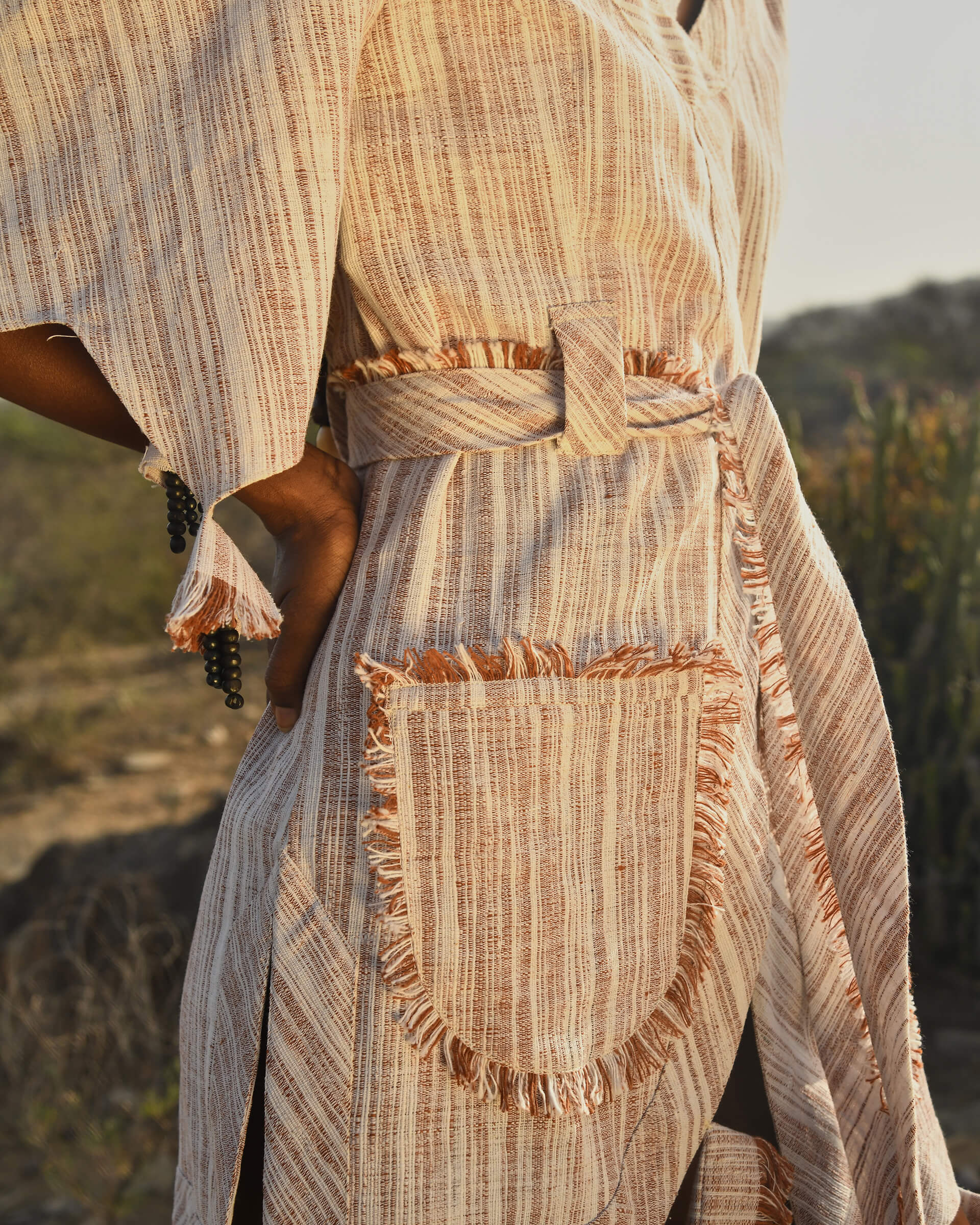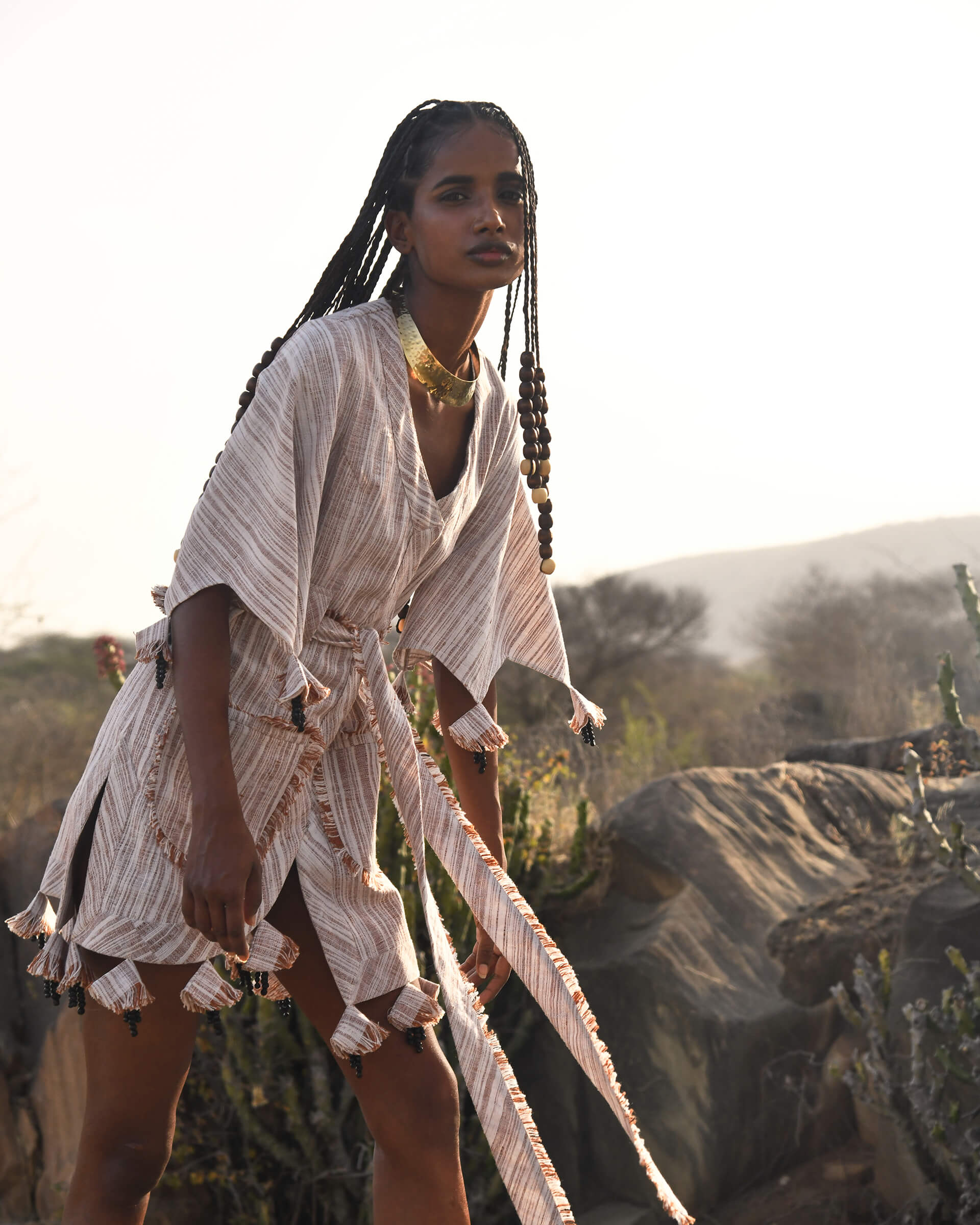 Inspired by arid jungle terrains, Nia is a short wrap dress made in textured Khadi. It is designed to cloak your body with ease. The V-neck dress features pockets with fringe detailing, a fringed belt and khadi tassels that hang from the sleeves and hemline. You can also wear this garment as a jacket over trousers.