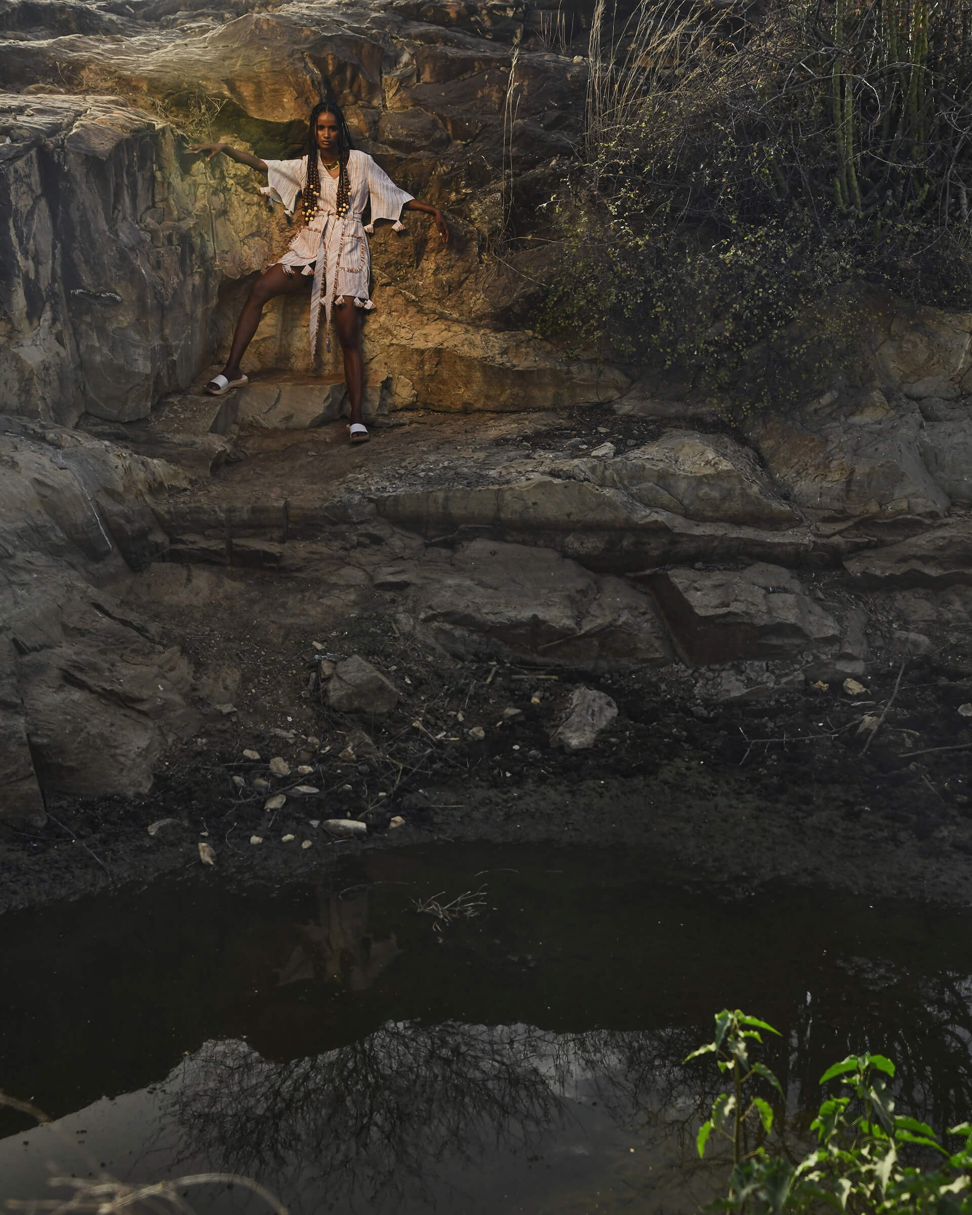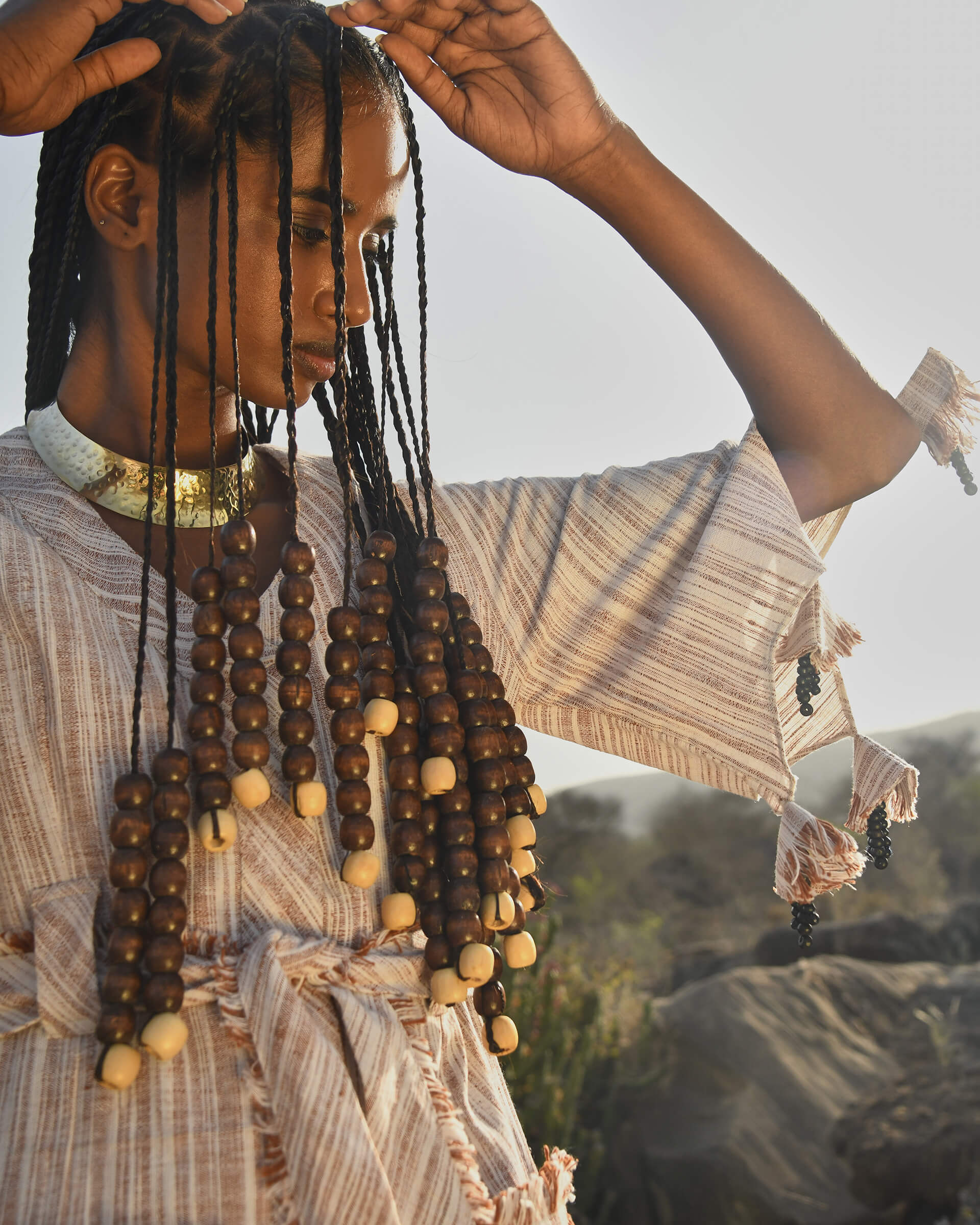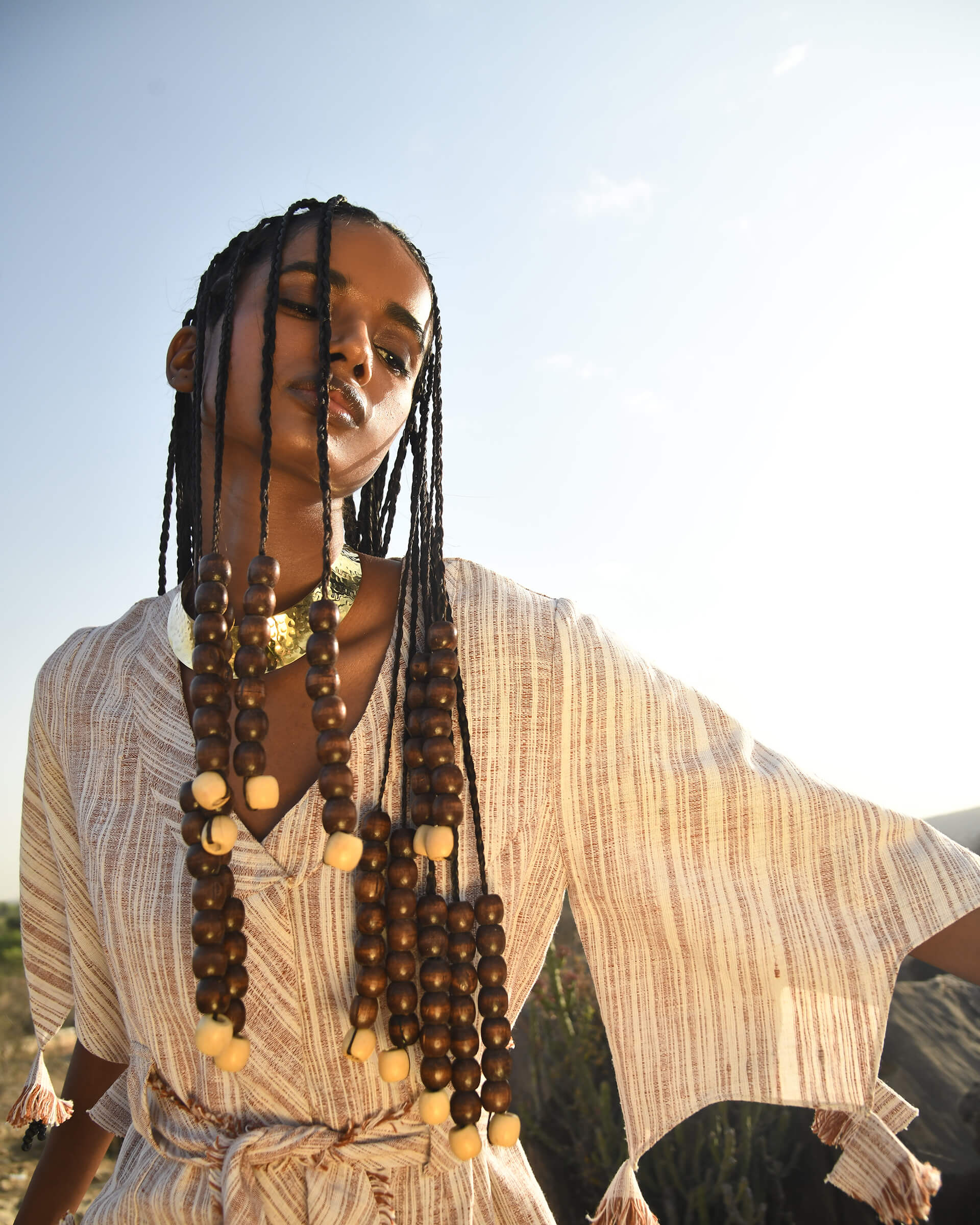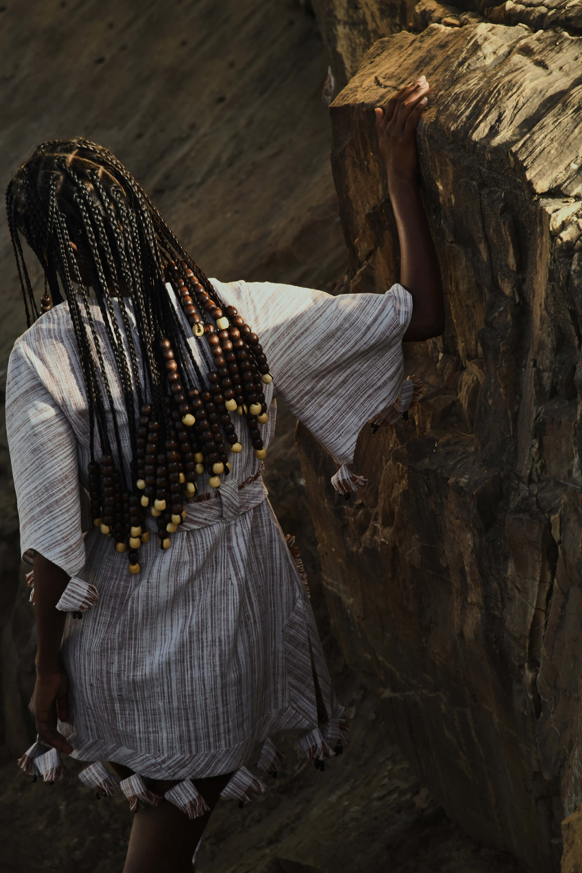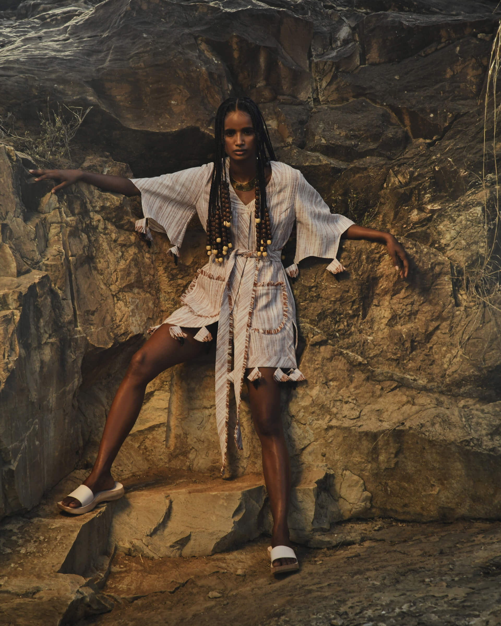 Inspired by arid jungle terrains, Nia is a short wrap dress made in textured Khadi. It is designed to cloak your body with ease. The V-neck dress features pockets with fringe detailing, a fringed belt and khadi tassels that hang from the sleeves and hemline. You can also wear this garment as a jacket over trousers.