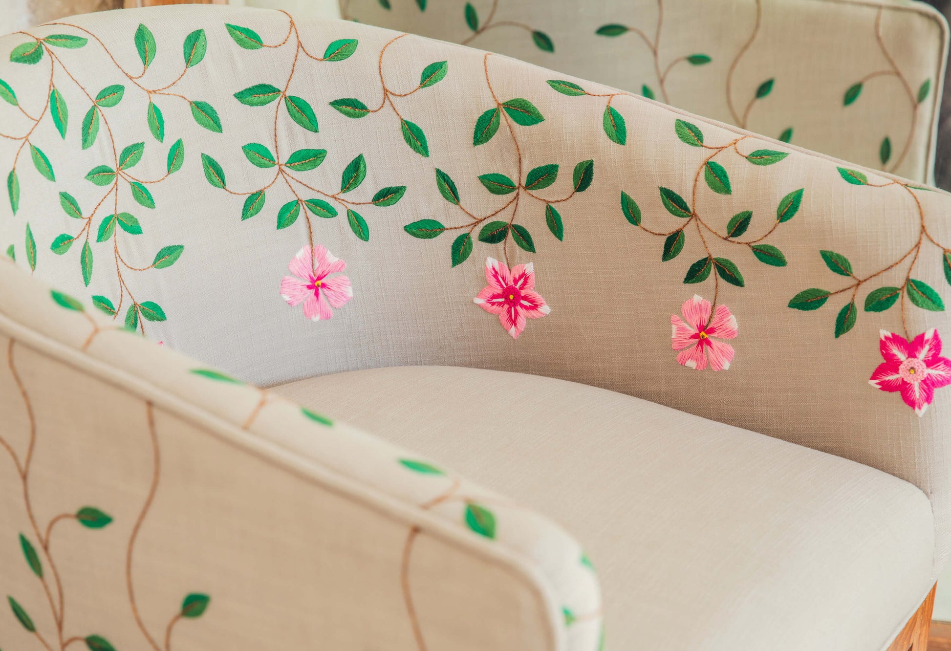 An armchair with a charming personality, Ruth is delicate, sturdy and supremely comfortable. Made using a sheesham wood base and linen-cotton upholstery, this chair features hand-embroidered periwinkle or ‘sadabahaar’ flowers. The armchair brings any space to life with its uplifting character. Place this piece in your living room, or as a standalone product in your bedroom or walk-in closet.