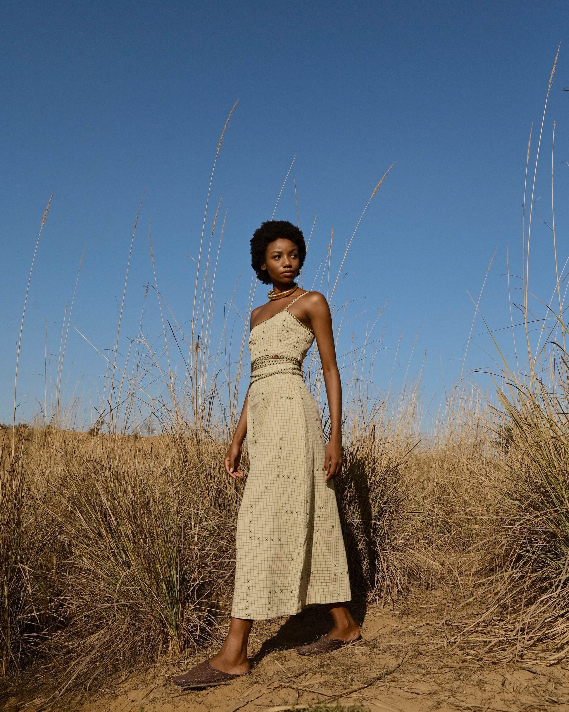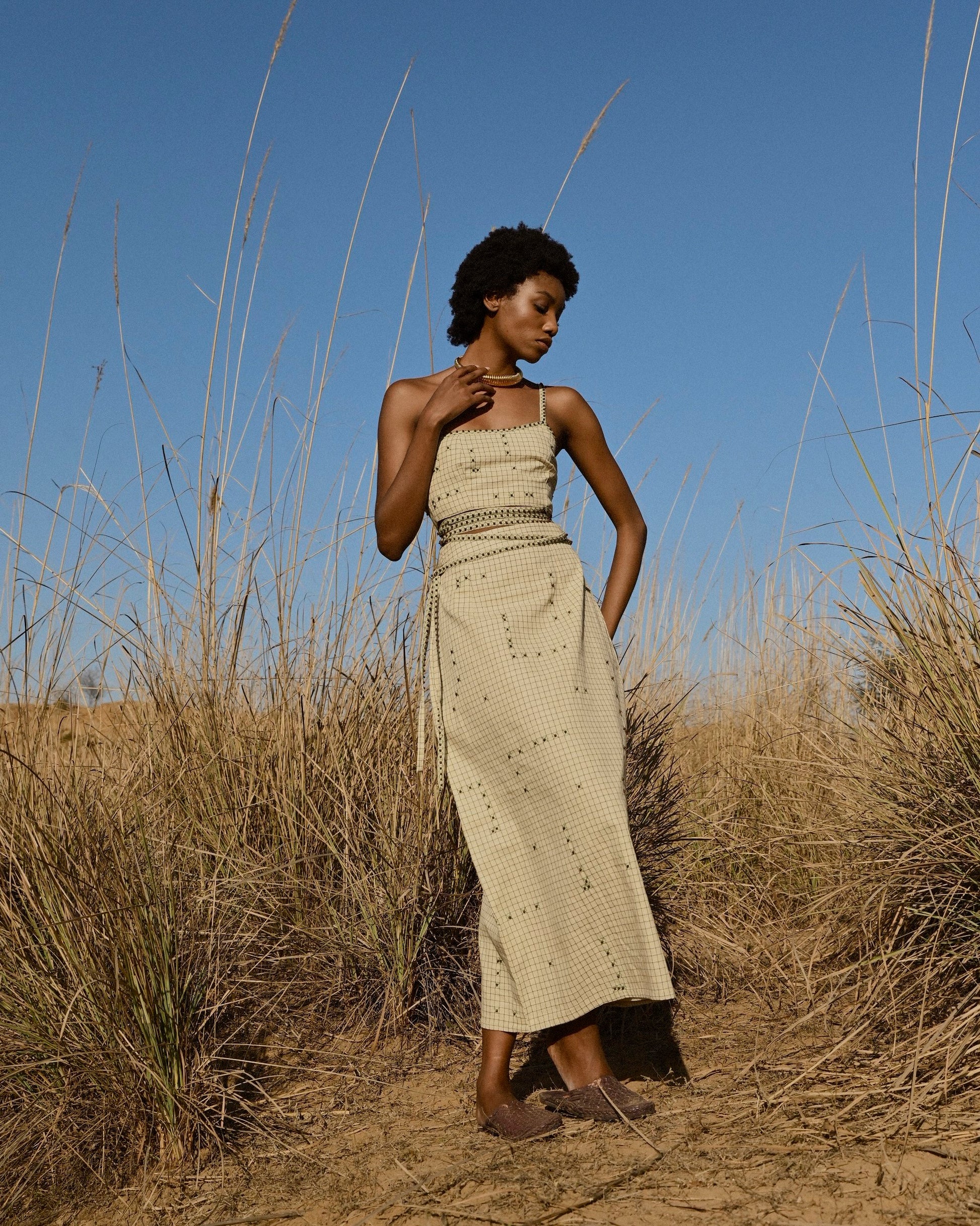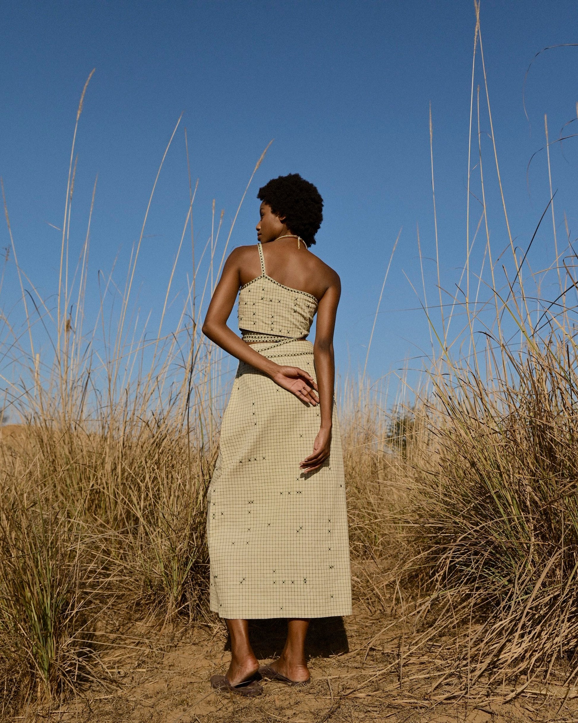 Simone is classy and quirky. With its minimalist checkered details and hand embroidered beads, this midi skirt gives XOXO vibes. Pair it with our Simone Crop Top for the full effect.