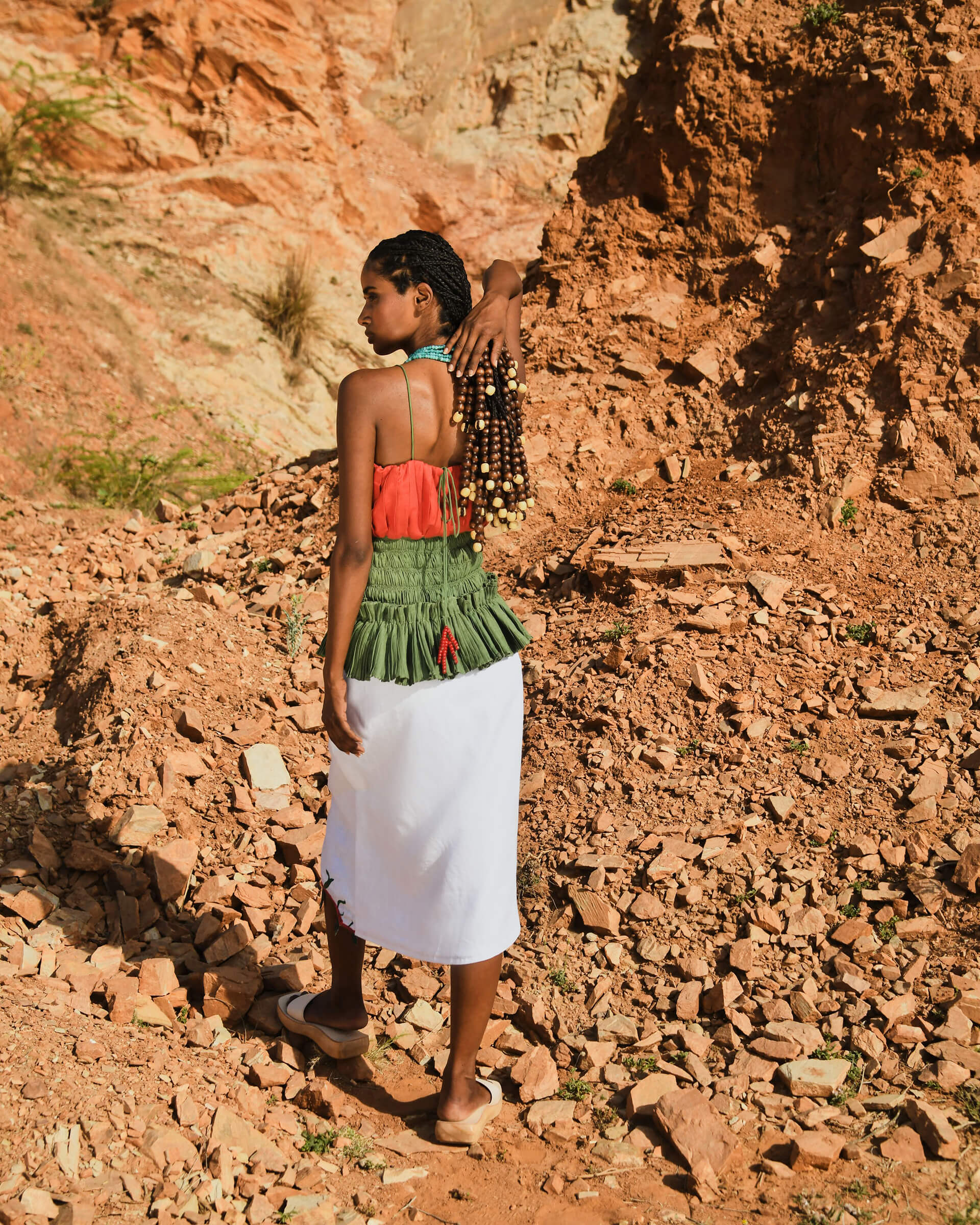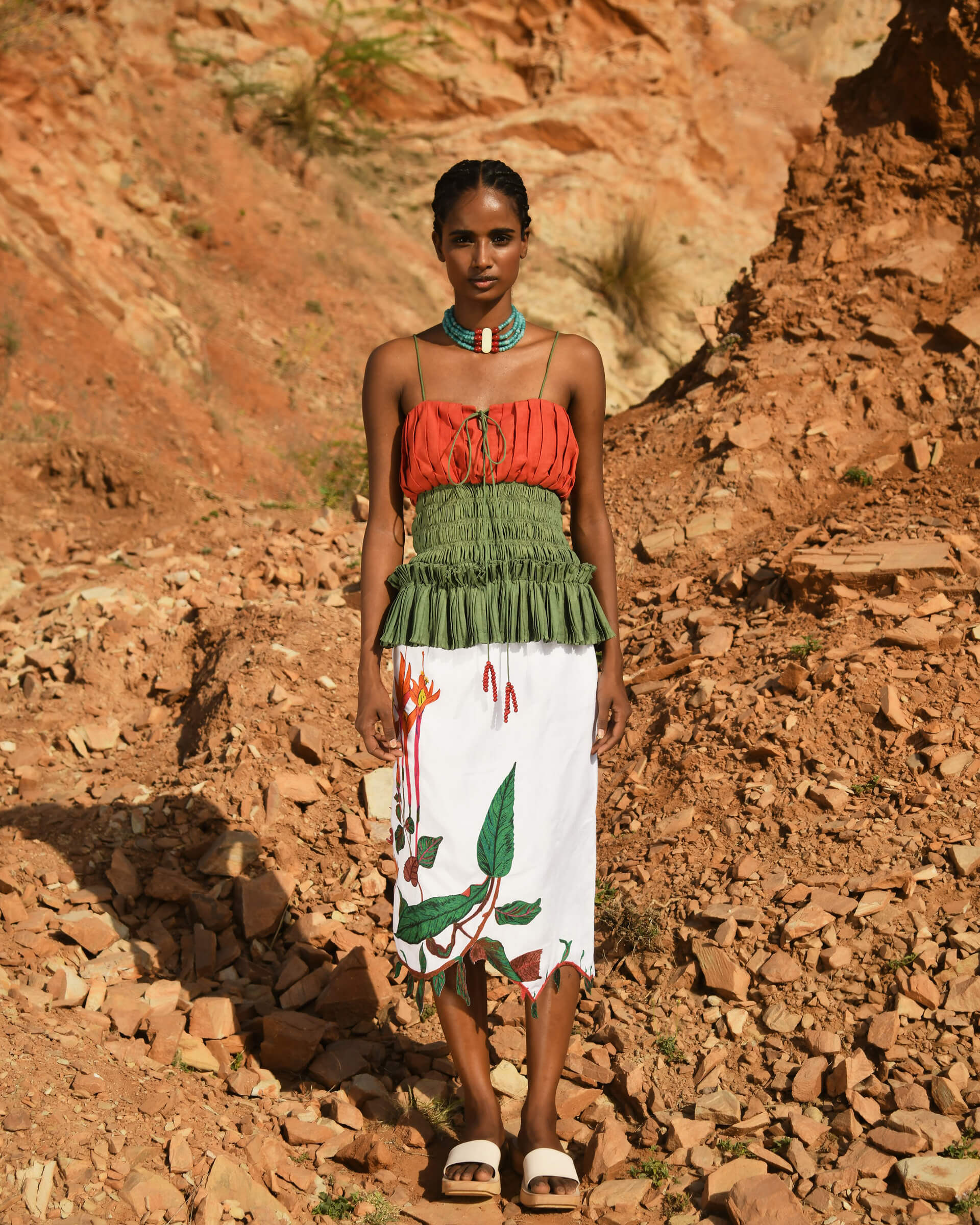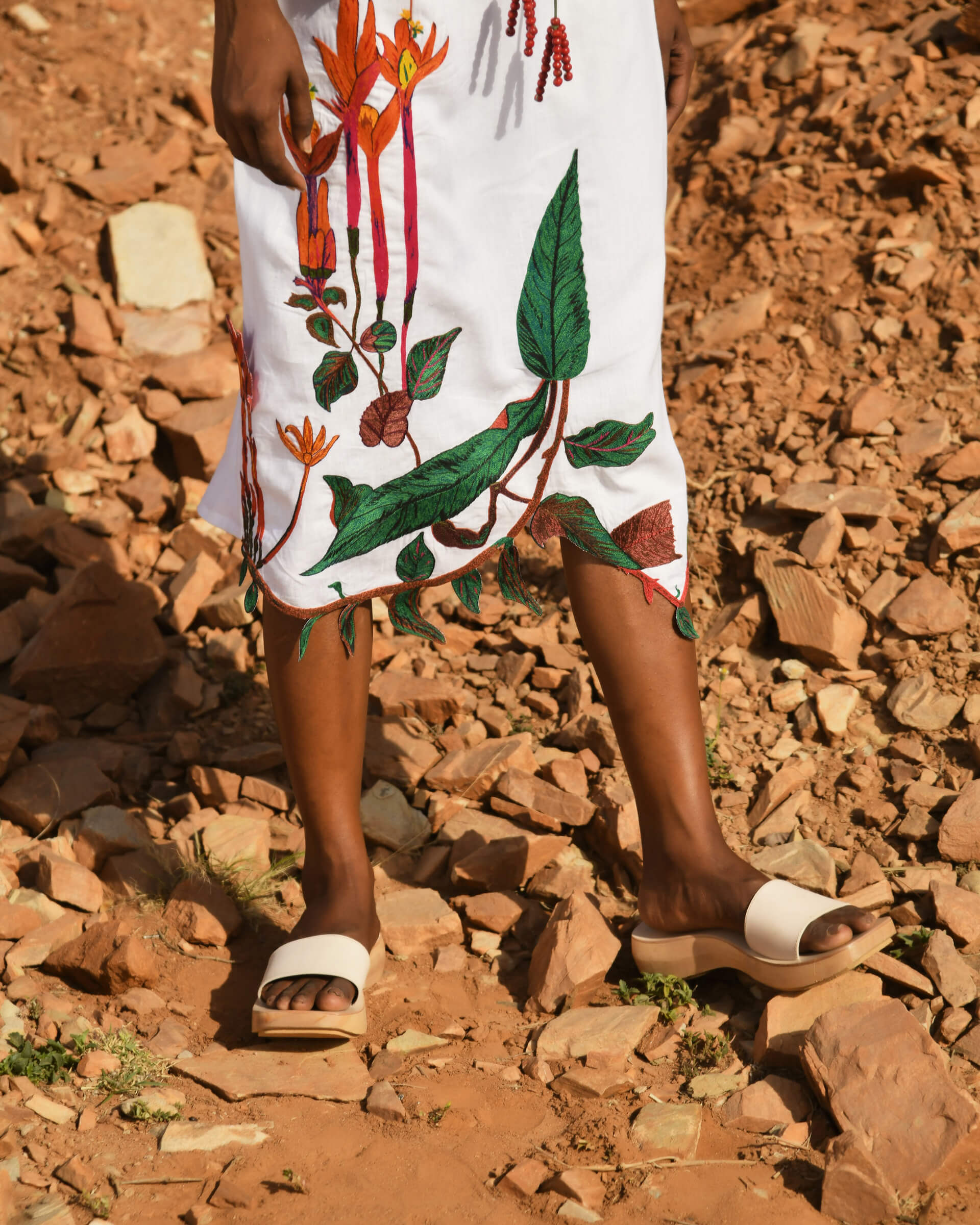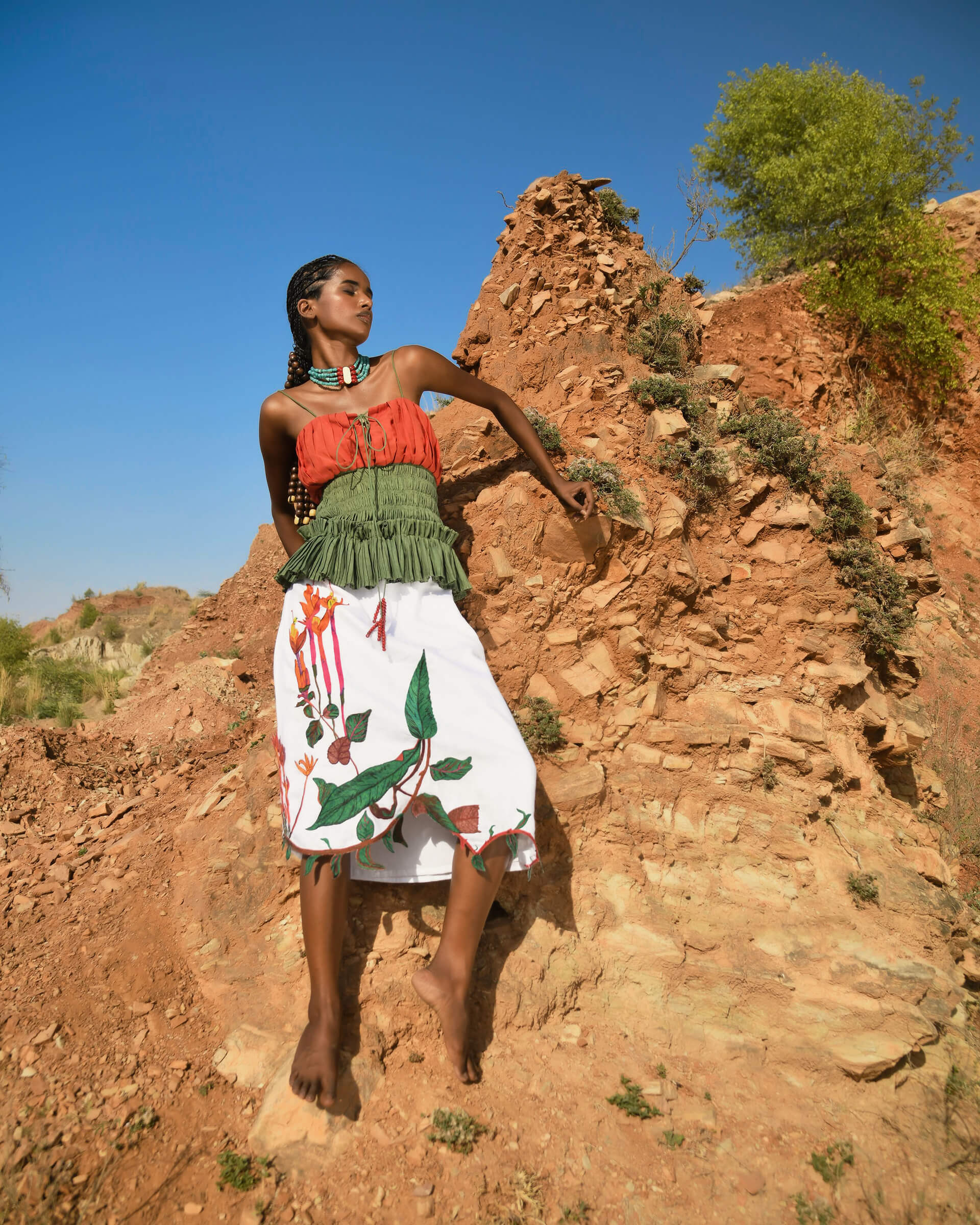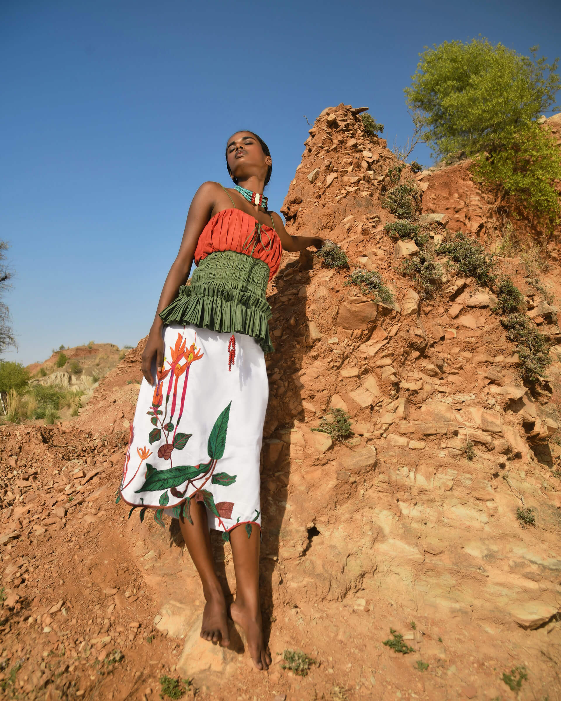 Wild flowers abound on the Thandie Skirt, which features a tapestry of hand-embroidered scenery. The skirt's hemline is made up of pop-out leaves, while the colours of the flowers are reminiscent of the bright colours found on Maasai clothing. Pair this gorgeous skirt with the Thandie Top to complete the look.