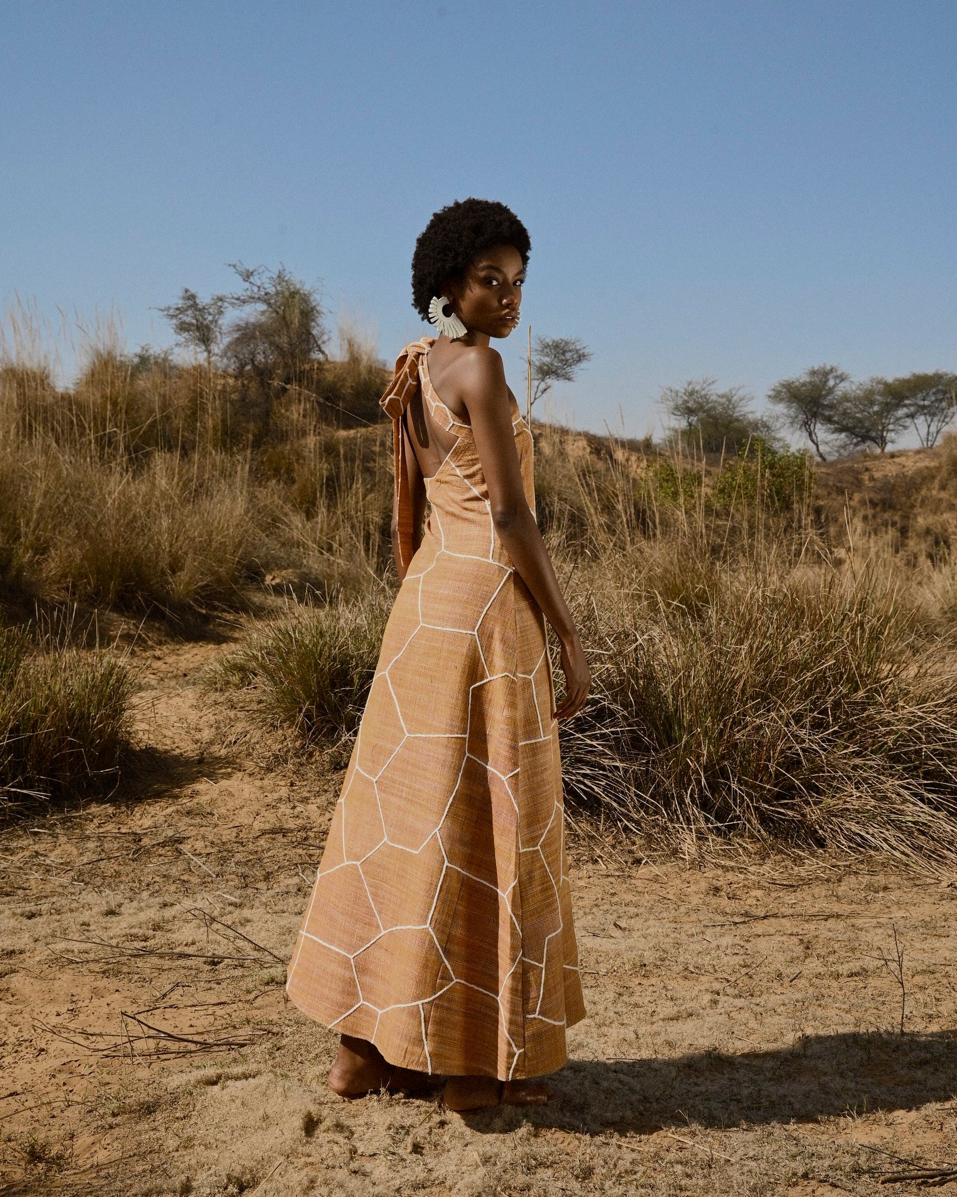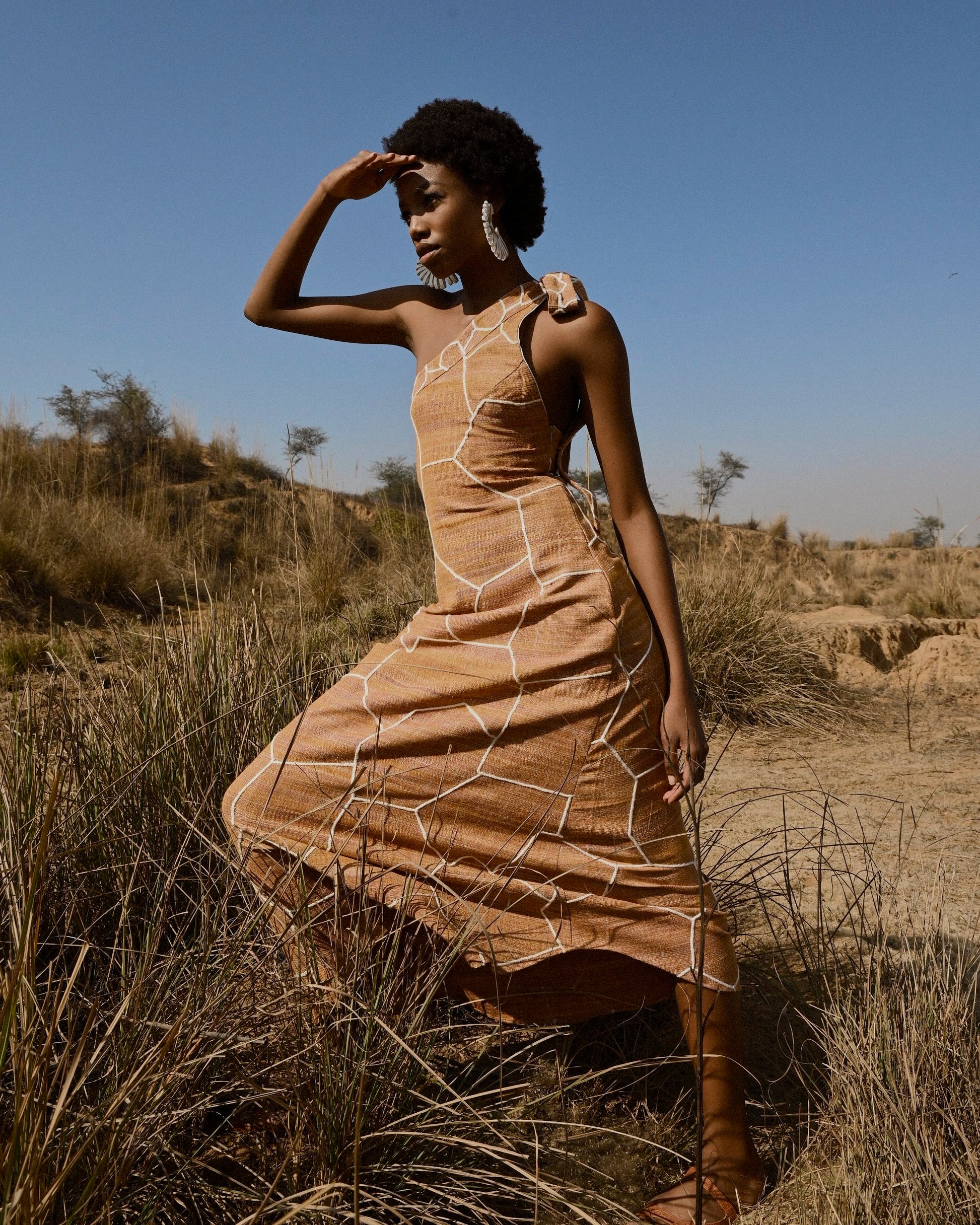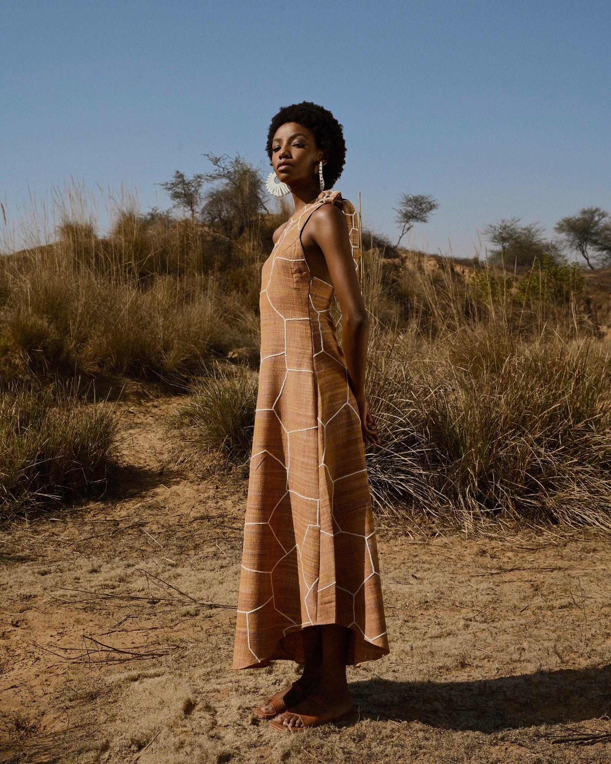 Giraffes are the cutest animals. Therefore, a dress has been dedicated to them. Their likeness has been inscribed onto a lovely khadi fabric, and their natural patterns highlighted against a backdrop of orange.