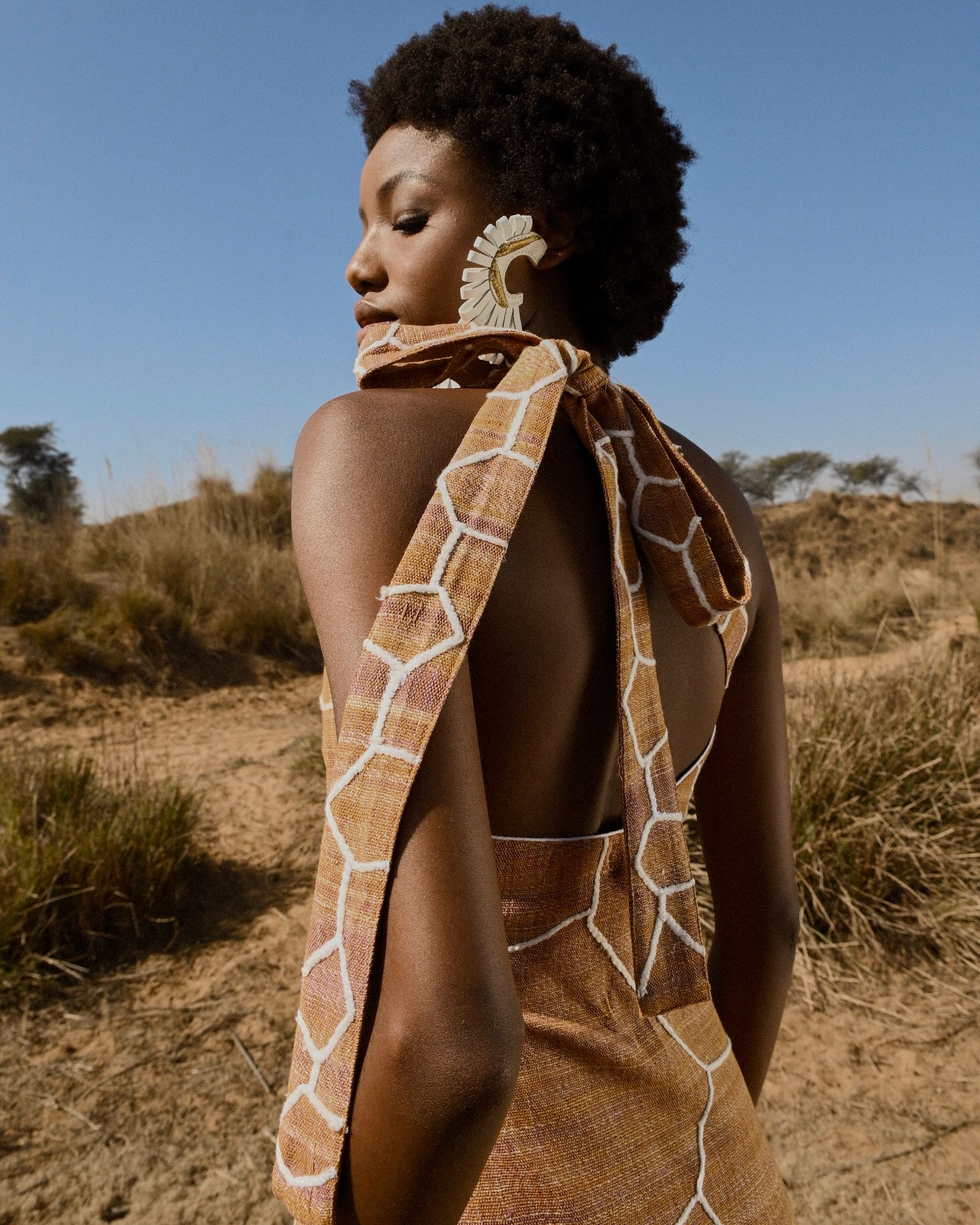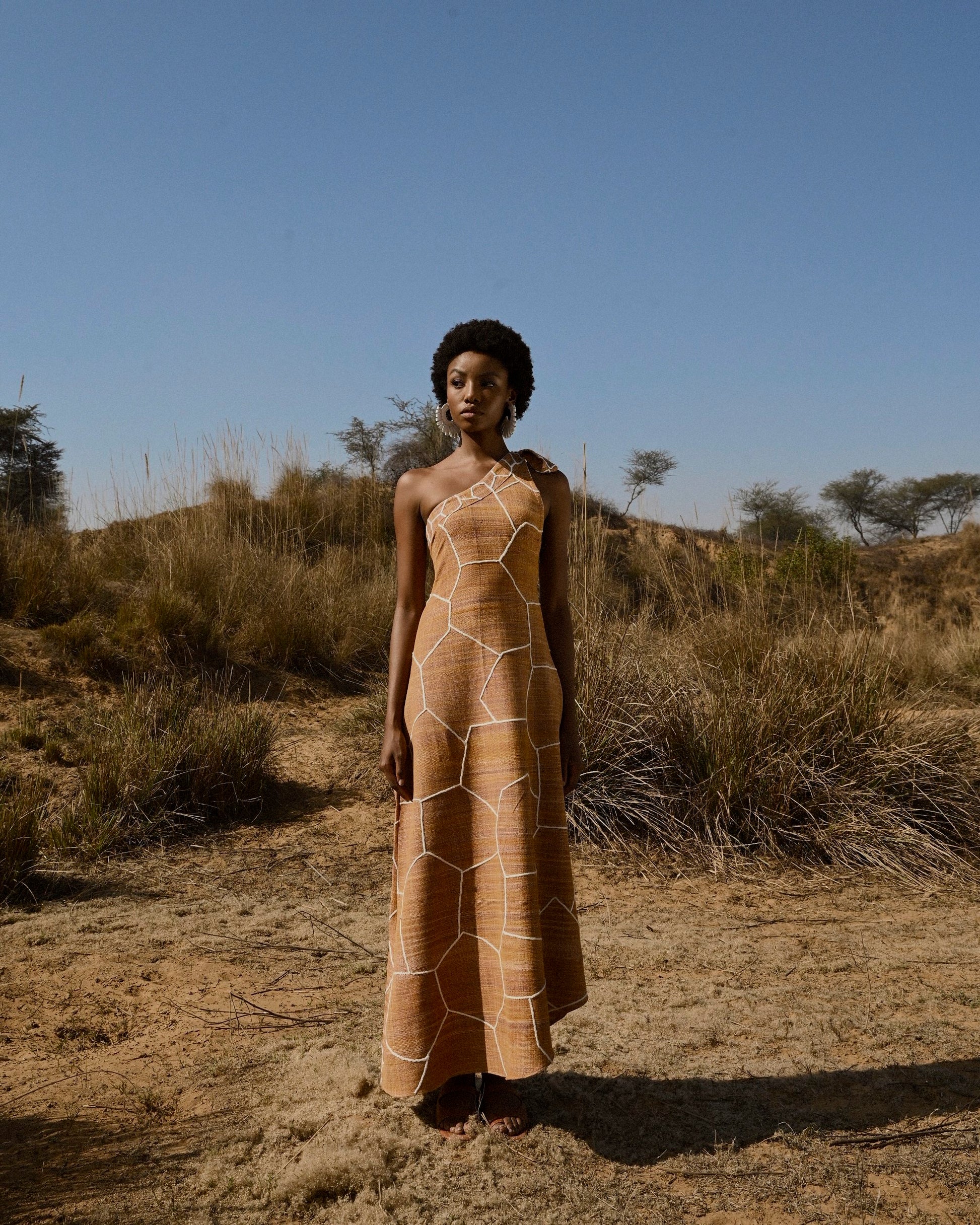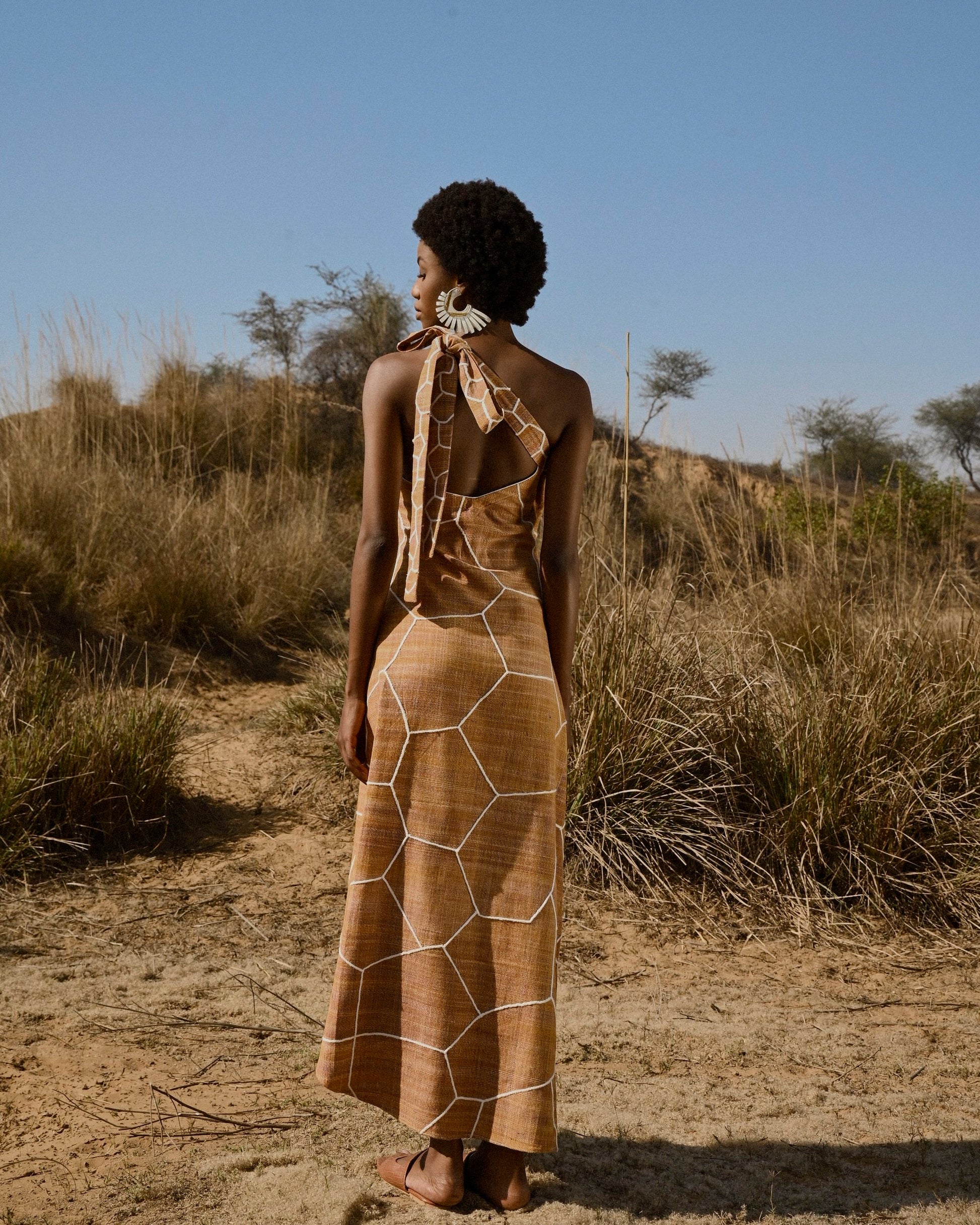 Giraffes are the cutest animals. Therefore, a dress has been dedicated to them. Their likeness has been inscribed onto a lovely khadi fabric, and their natural patterns highlighted against a backdrop of orange.
