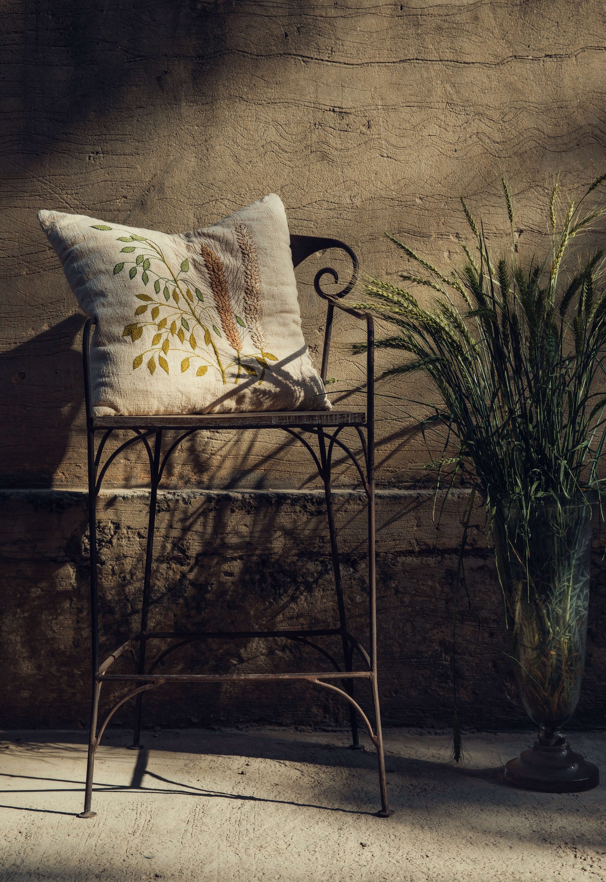 Rustic khadi cushion with hand-embroidered wheat motifs. This is a large, cotton-filled cushion that can be used on sofas, armchairs or as part of your bed linen.