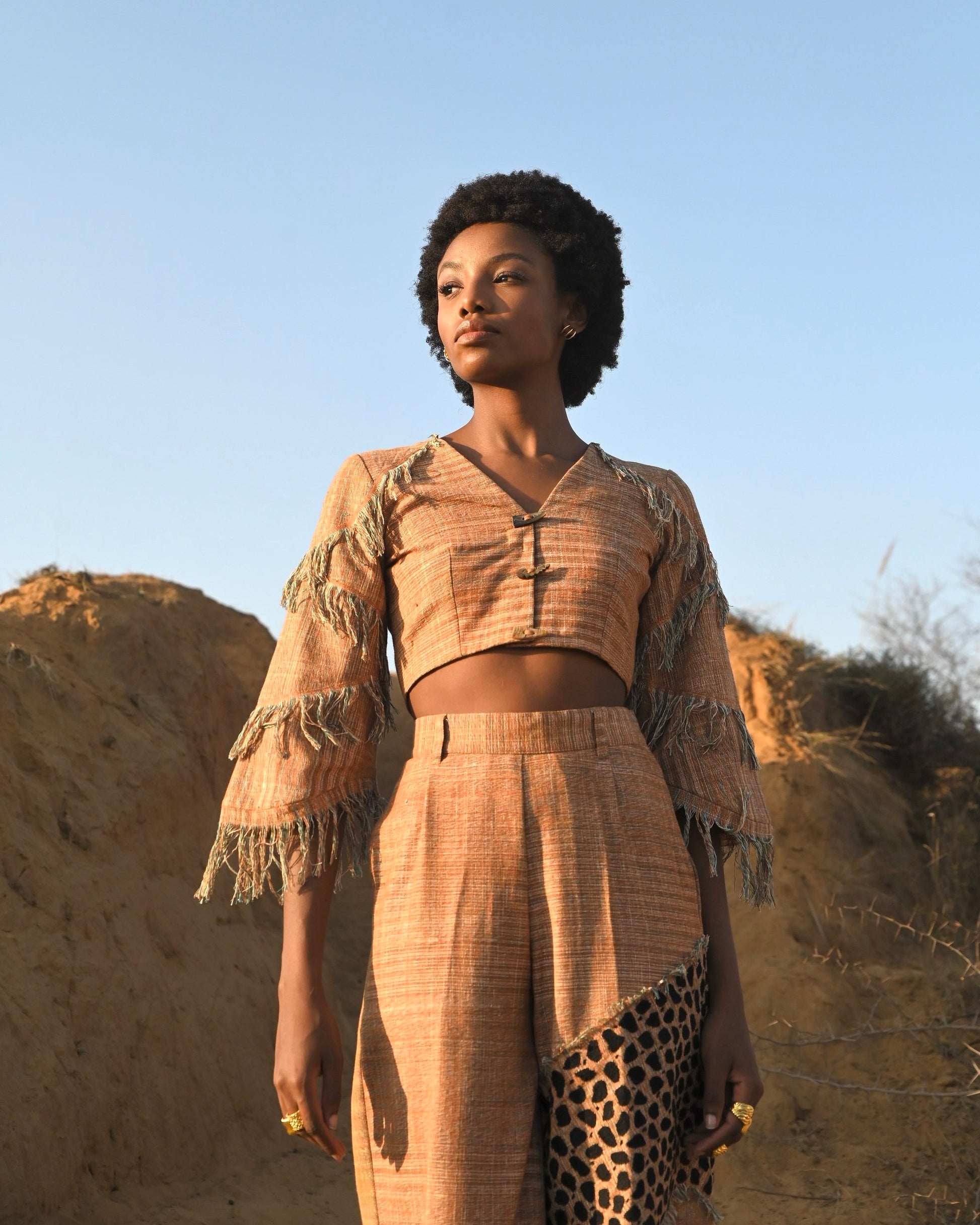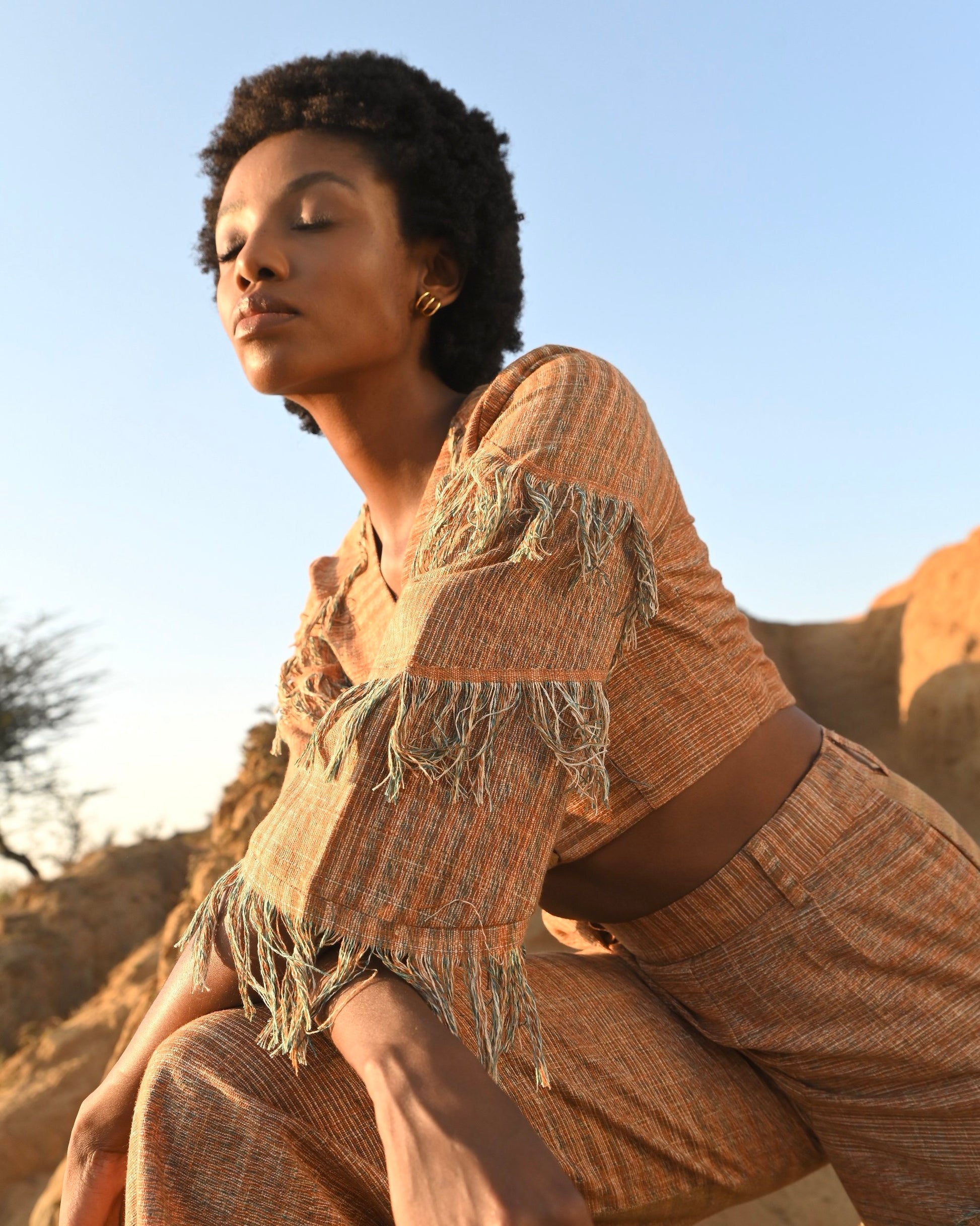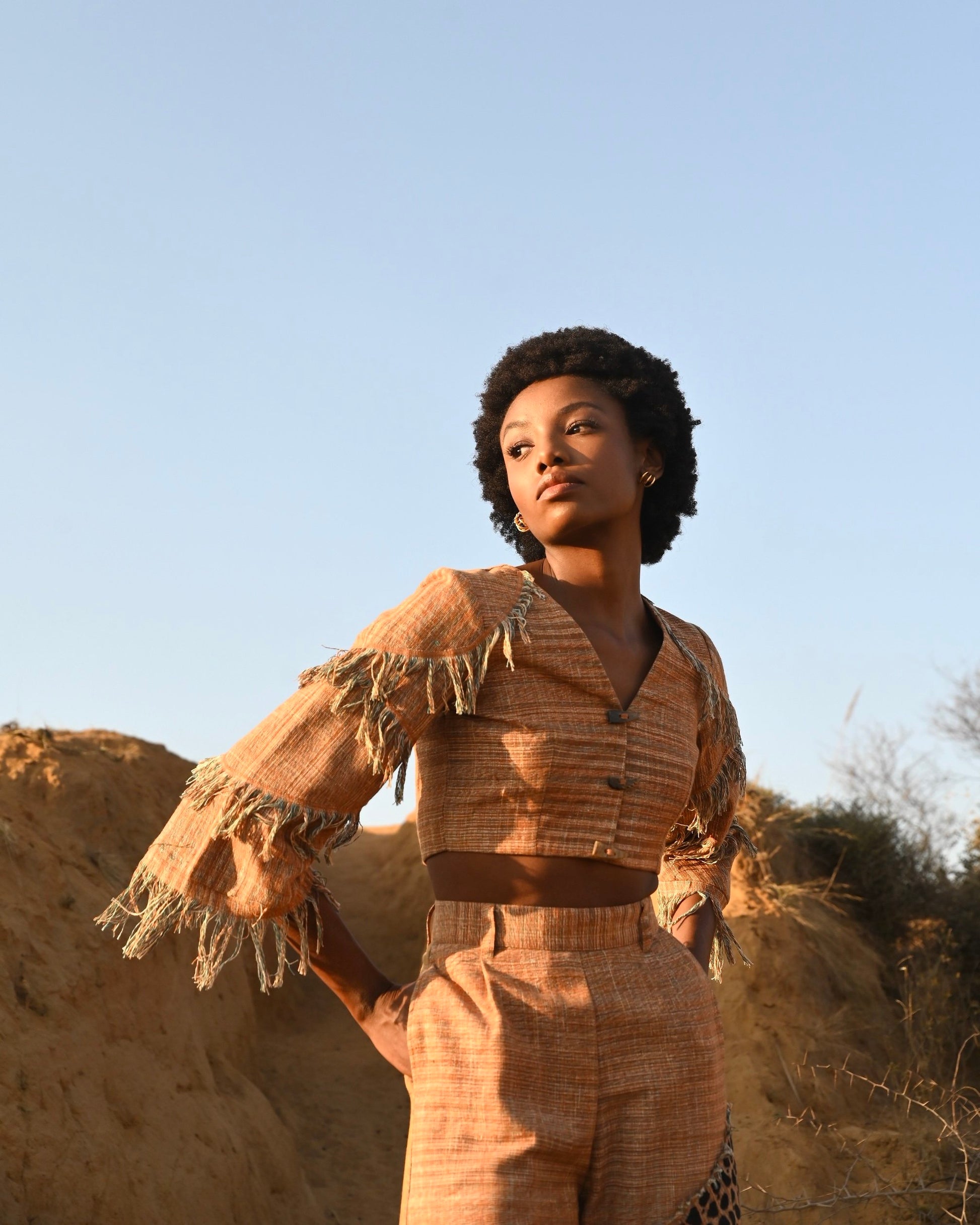 Earthy-toned and topped with fringe details, the Zarina Top doubles up as a jacket.The design is inspired by retro punk jackets, and has been crafted in gorgeous Khadi paired with the Zuri pants.